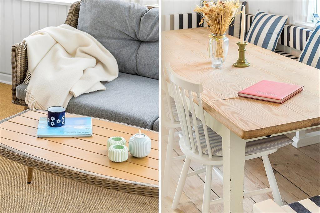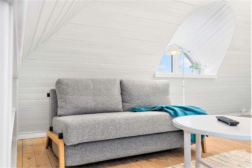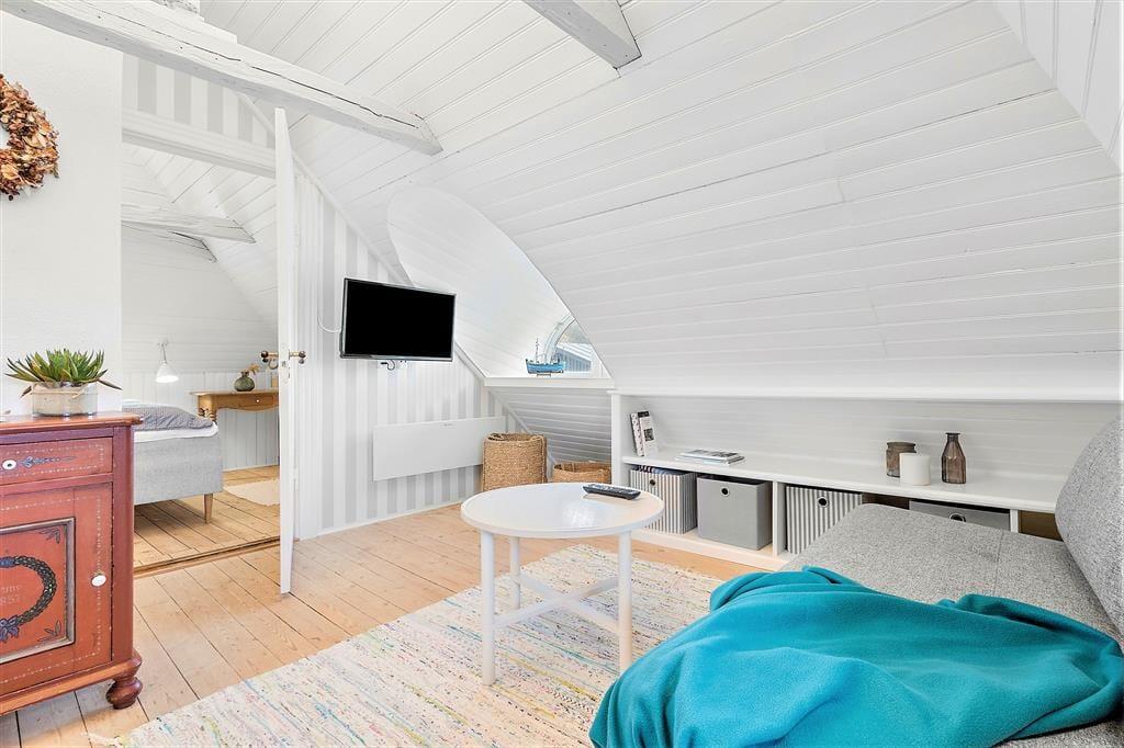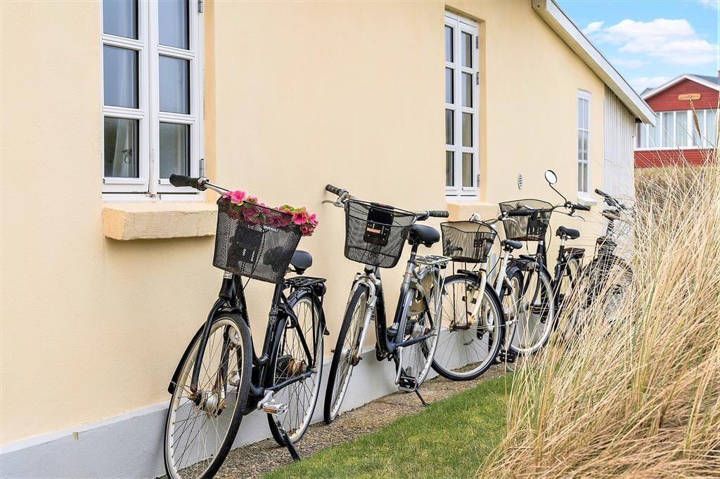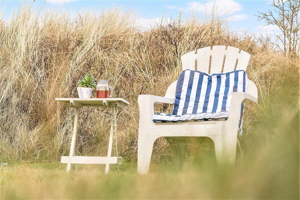 Rundt omkring på den naturskønne og kun let kuperede grund er det nemt at finde en fristende opholdsplads i solen. Ved huset kan du slå dig ned på en bænk eller vælge en lækrog – for eksempel er der en helt lukket terrasse, der skærmes af murværk og endda har et overdækket areal, hvis det er at foretrække. Du kan også sætte dig i en havestol tæt op ad de duftende hybenbuske og grundens små klittoppe, og hvis du har børn med på ferie, kan du give dem en gyngetur eller udfordre dem i vikingespil på græsplænen.