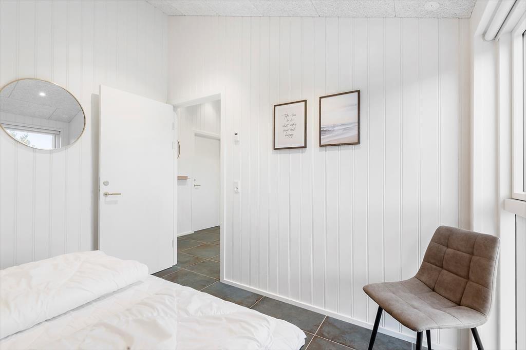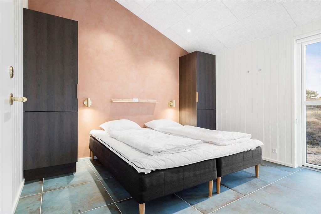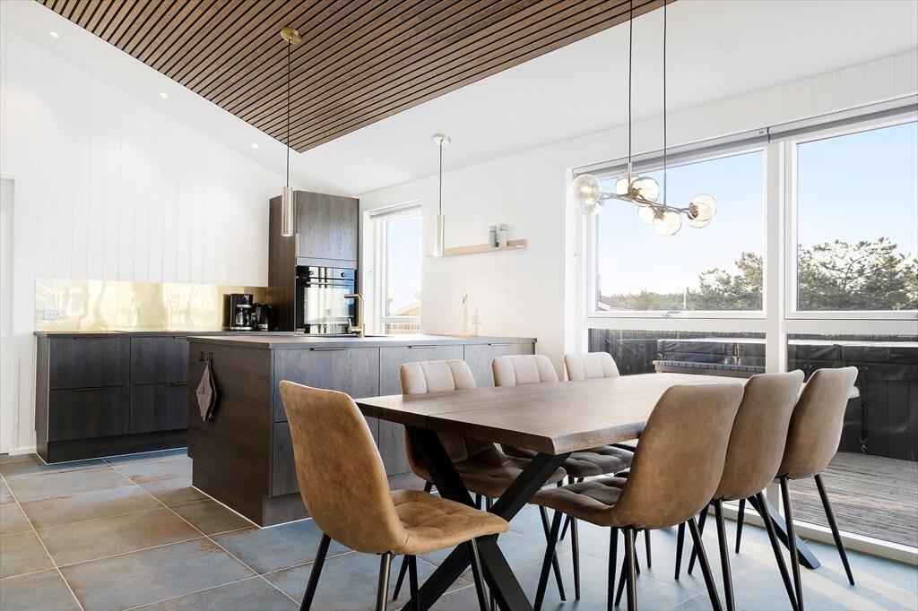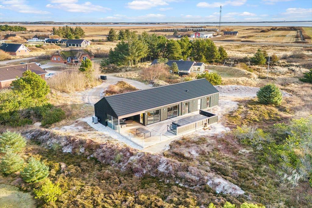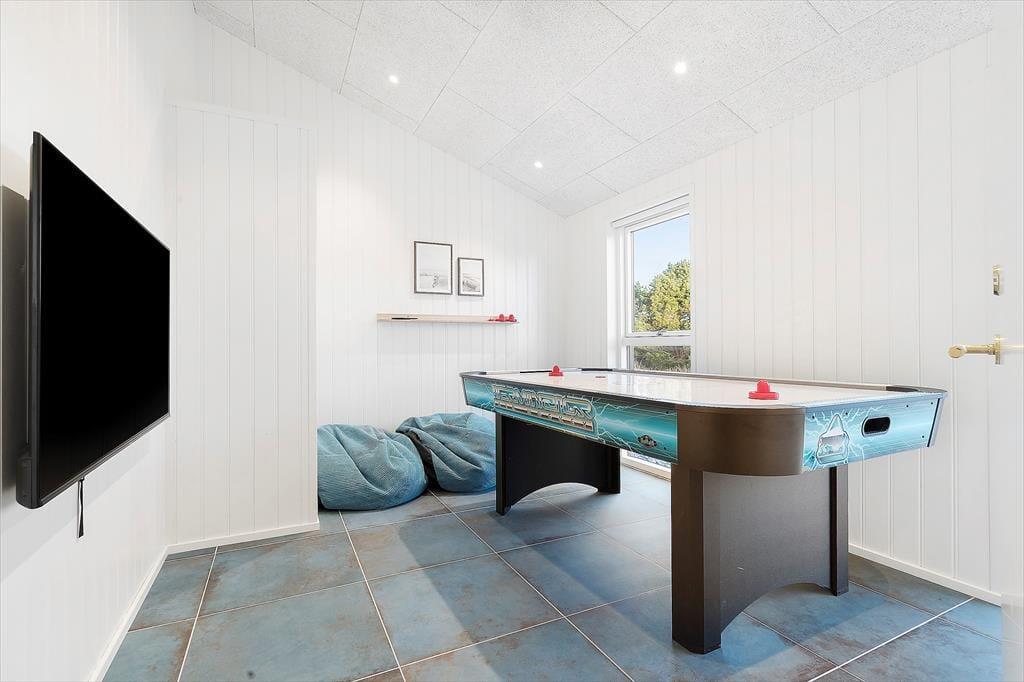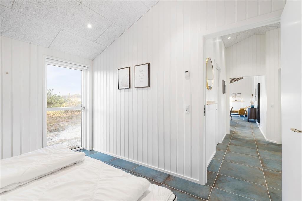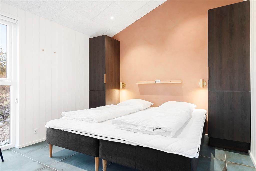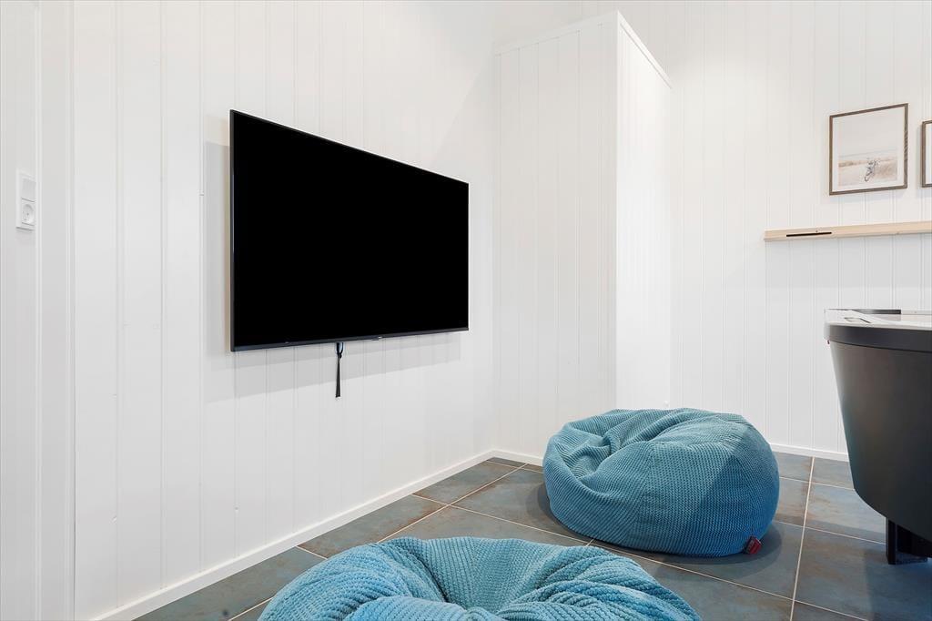 Da det 120 m2 store sommerhus blev opført og indrettet i 2023, blev de bedste materialer og det lækreste interiør taget i brug. Både inde og ude fremstår ferieboligen derfor utroligt stilfuldt, og der er mange skønne detaljer at hæfte sig ved – se bare de flotte, store gulvklinker med indlagt varme og de elegante skabsløsninger, der går igen i køkkenet, på de to badeværelser og i soveværelserne. Sidstnævnte er der tre af, og de har til sammen sengepladser til otte personer, så I har mulighed for at invitere venner eller familie med på ferie. Både børn og barnlige sjæle kan glæde sig over at have et aktivitetsrum med airhockey at hygge sig i, og mon ikke også saunaen bliver et hit. Opholdsrummet, hvor stuen og køkkenet ligger samlet, skal I også se frem til at hygge jer i, ikke mindst på grund af det flotte lysindfald og den fine udsigt, som vinduerne åbenbarer.