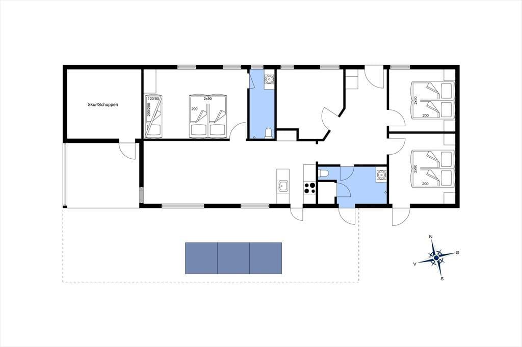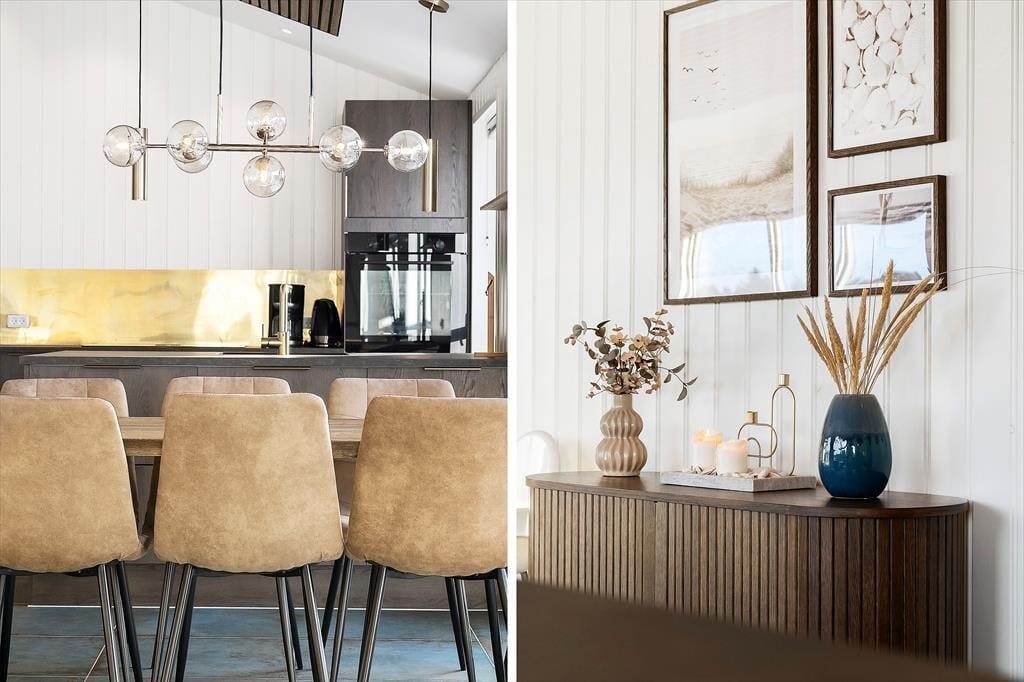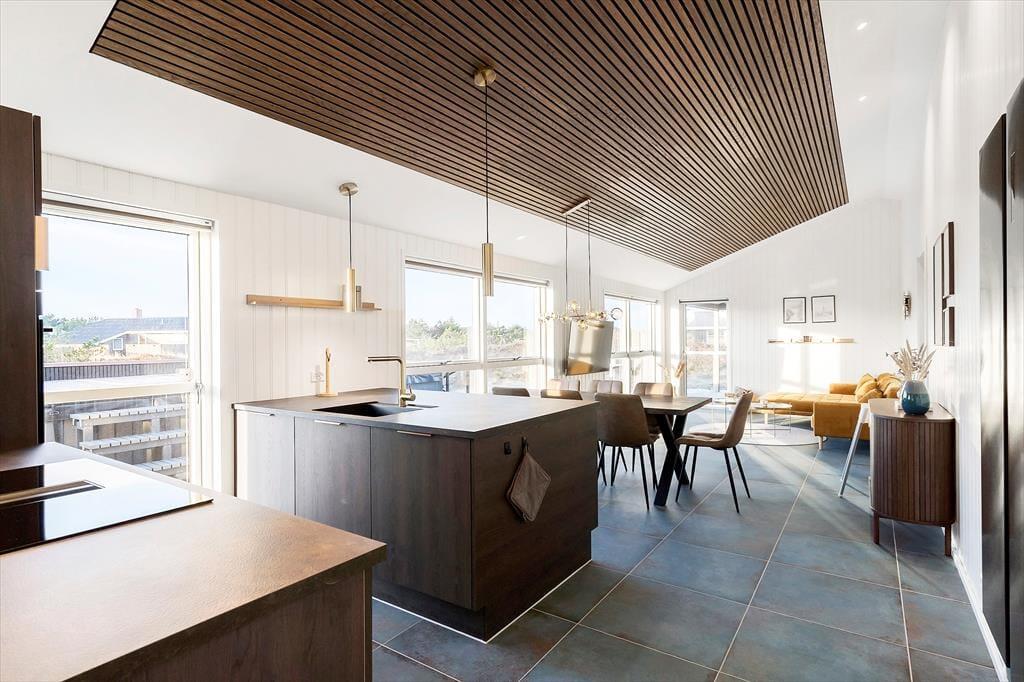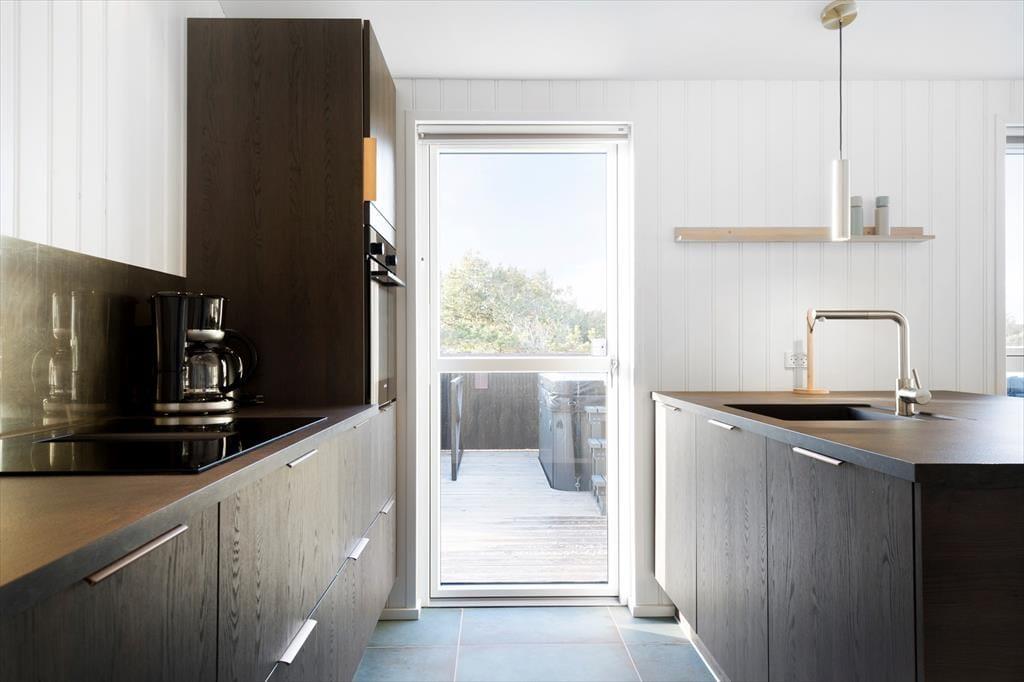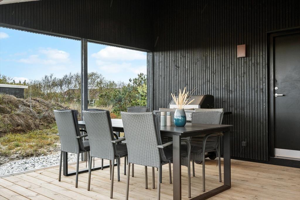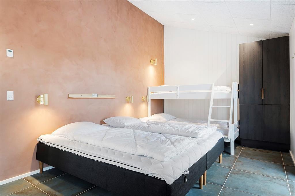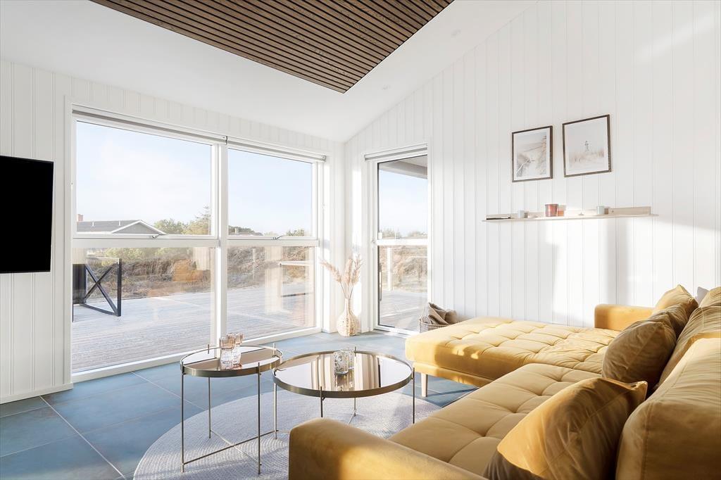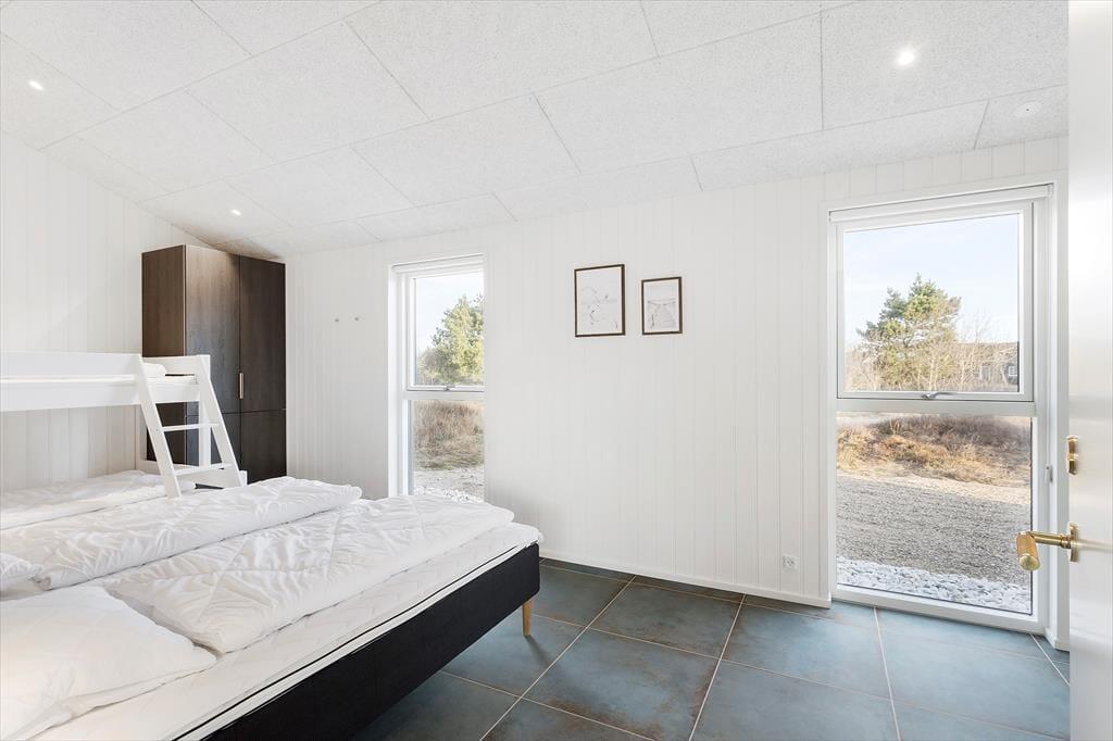 Da det 120 m2 store sommerhus blev opført og indrettet i 2023, blev de bedste materialer og det lækreste interiør taget i brug. Både inde og ude fremstår ferieboligen derfor utroligt stilfuldt, og der er mange skønne detaljer at hæfte sig ved – se bare de flotte, store gulvklinker med indlagt varme og de elegante skabsløsninger, der går igen i køkkenet, på de to badeværelser og i soveværelserne. Sidstnævnte er der tre af, og de har til sammen sengepladser til otte personer, så I har mulighed for at invitere venner eller familie med på ferie. Både børn og barnlige sjæle kan glæde sig over at have et aktivitetsrum med airhockey at hygge sig i, og mon ikke også saunaen bliver et hit. Opholdsrummet, hvor stuen og køkkenet ligger samlet, skal I også se frem til at hygge jer i, ikke mindst på grund af det flotte lysindfald og den fine udsigt, som vinduerne åbenbarer.