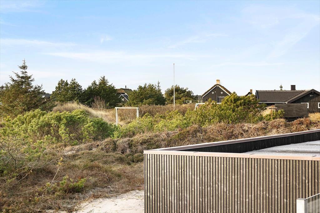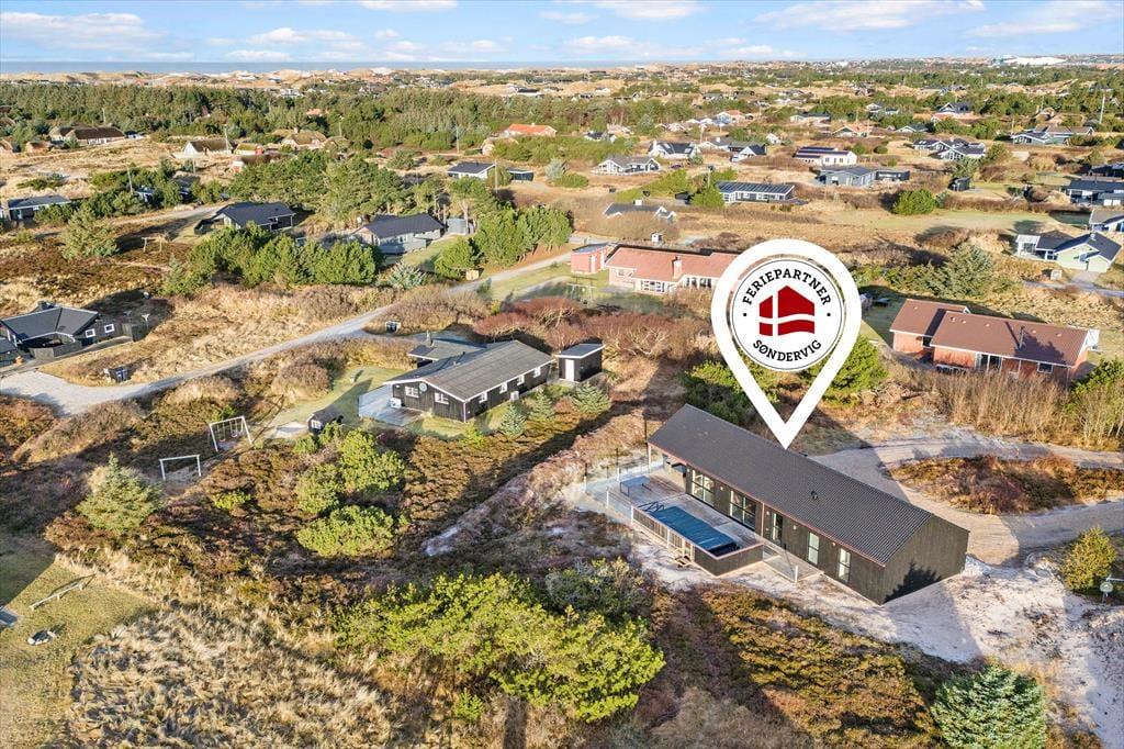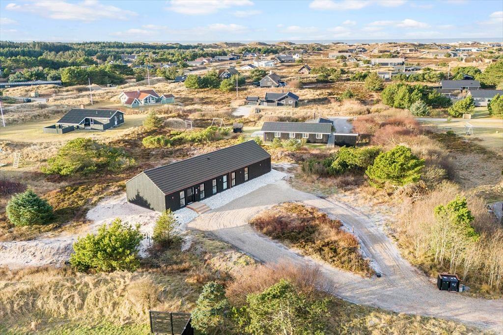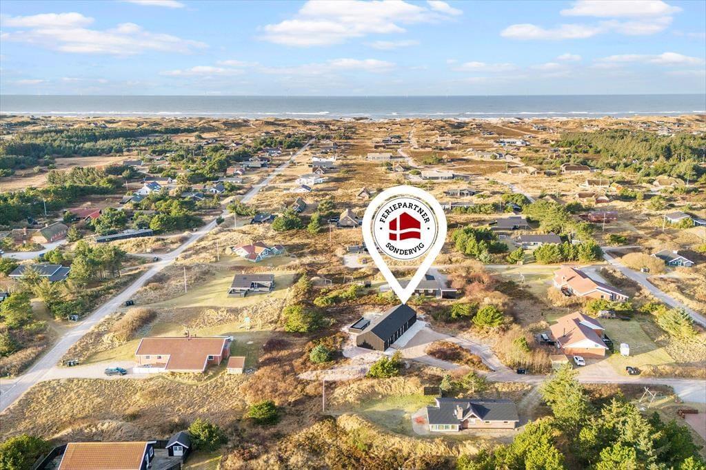 Sommerhuset ligger godt placeret for enden af en lille sidevej og med udsigt til lyng og anden naturskøn bevoksning. Vil I helt ud i den fri natur, kan I gå ned for enden af vejen og følge stierne ud i det åbne klitlandskab, indtil I når Søndervig Strand. Det er et perfekt sted at vandre og løbe ture, og hvis I holder af at bade, er der også mulighed for at få daglige dukkerter i Vesterhavet. Begiver I jer i stedet mod øst, kommer I hurtigt til Ringkøbing Fjord, for Holmsland Klit ligger nemlig smukt imellem hav og fjord. Søndervigs hyggelige bymidte er bare et par kilometer mod nord, og hvis I kører sydpå i bil eller på cykel, kommer I snart til fisker- og surferbyen Hvide Sande.