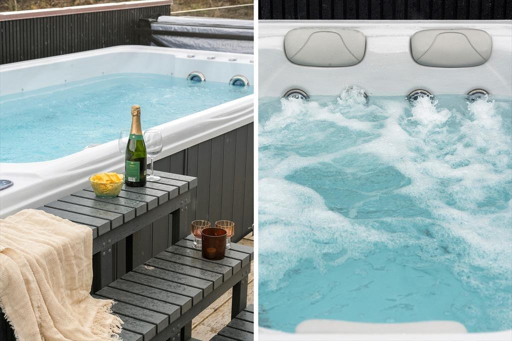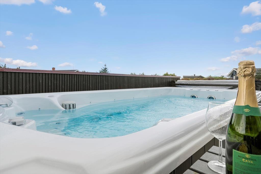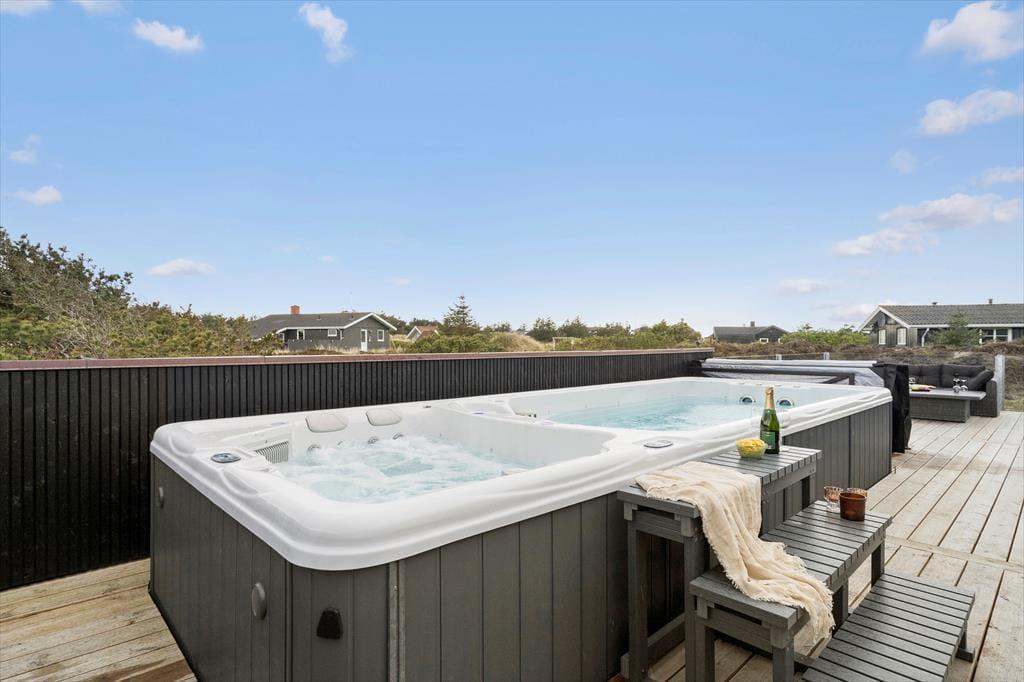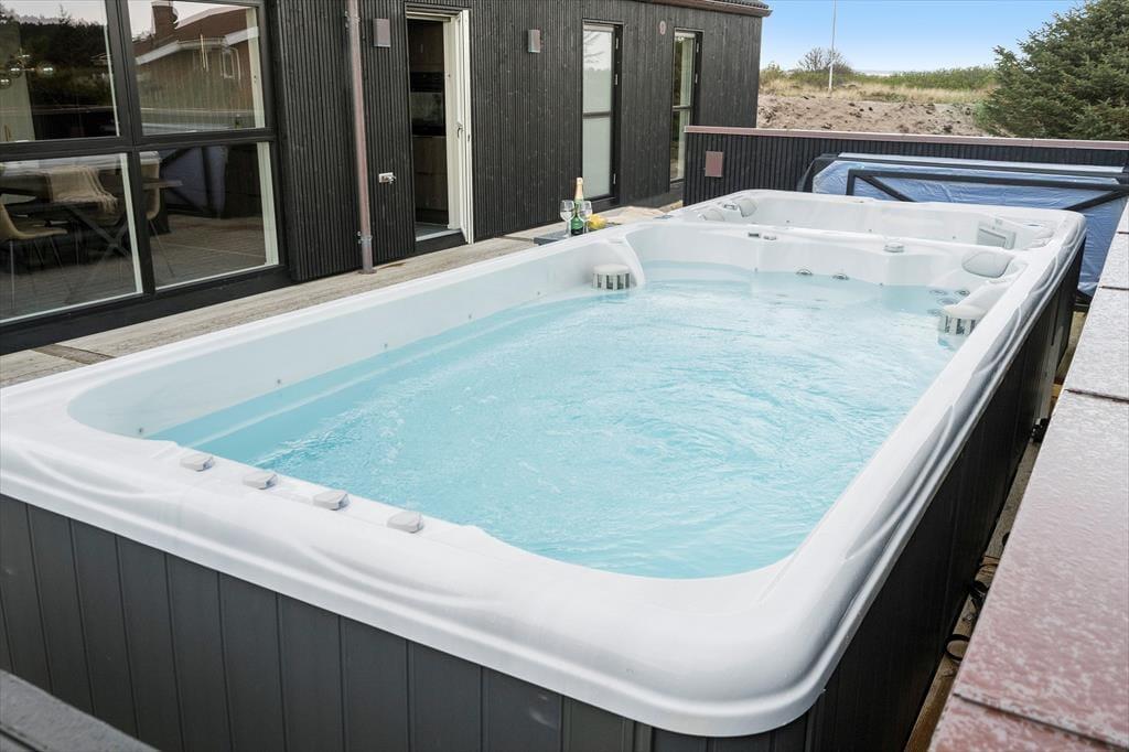 Fra stuen har I direkte adgang til et stort terrassemiljø, der har et overdækket areal mod vest og et åbent område i sydlig retning. Under åben himmel står det store spabad, hvor I kan være op til seks personer, der trænger til lidt afslapning og wellness.