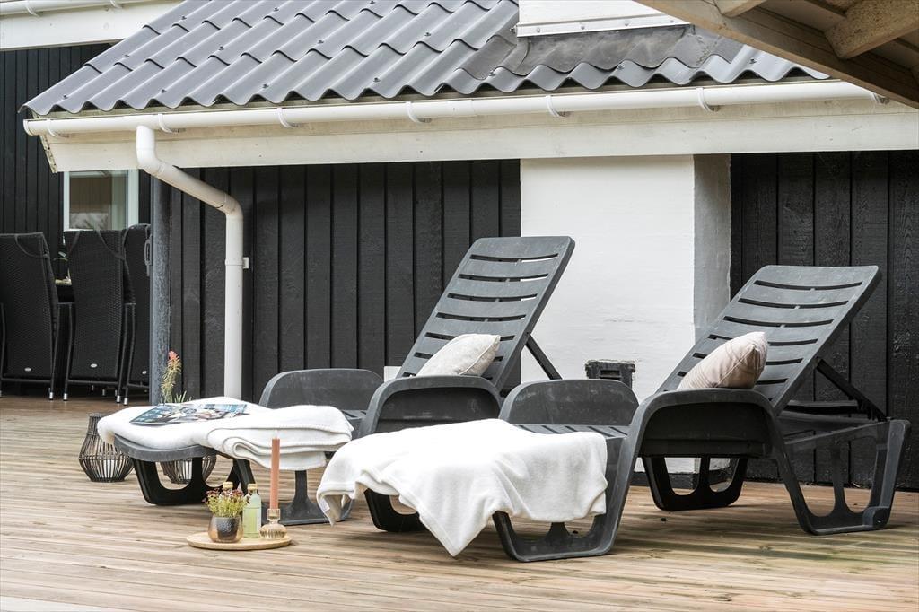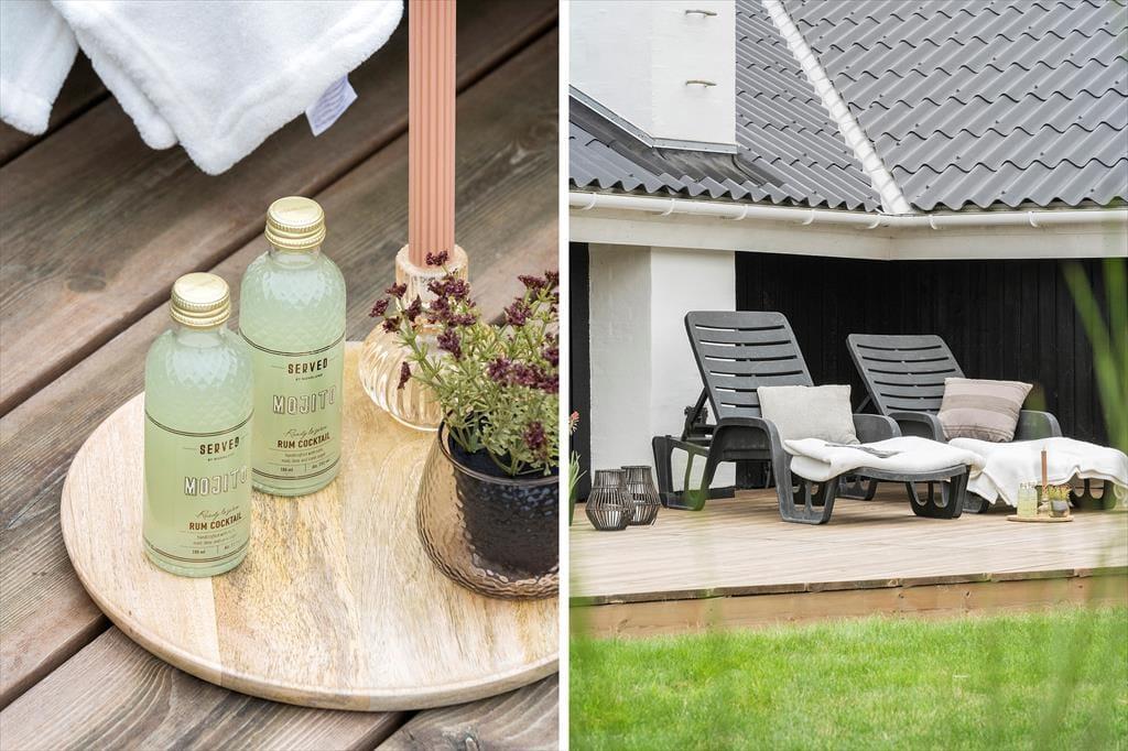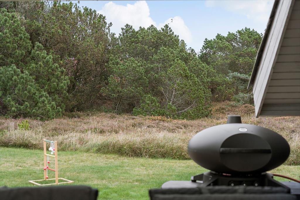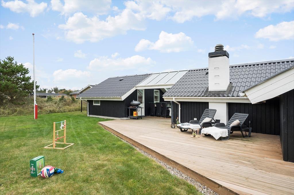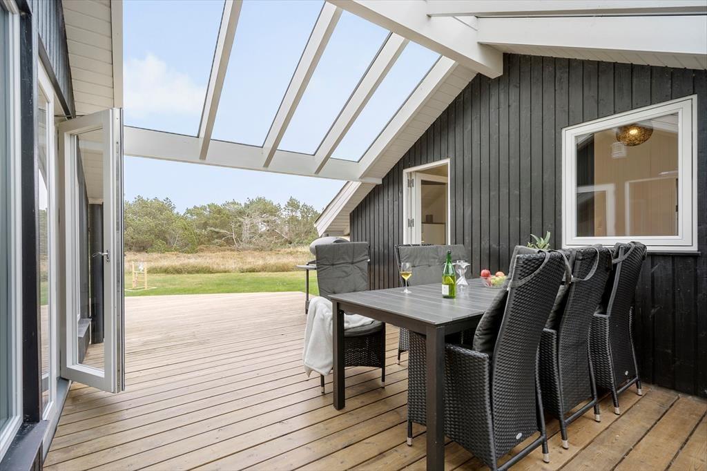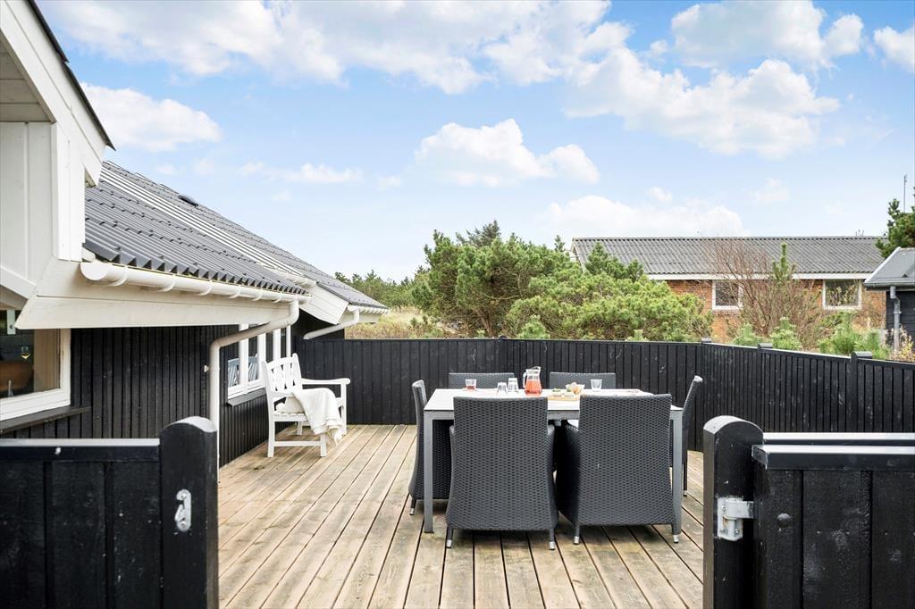 Feriehuset har en række gode terrasser, der giver jer mulighed for at nyde livet under åben himmel. Mod vest kan I nyde aftensolen på en delvist overdækket terrasse, mens en afskærmet terrasse på husets anden side giver ro og privatliv til hyggelige stunder og måltider udendørs. Med havemøbler, liggestole og en gasgrill er alt klar til grillmiddage og afslappende eftermiddage i solen. Den åbne naturgrund omkring huset skaber samtidig en perfekt ramme for leg og afslapning, så både børn og voksne kan nyde ferielivet fuldt ud.