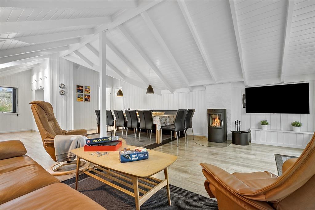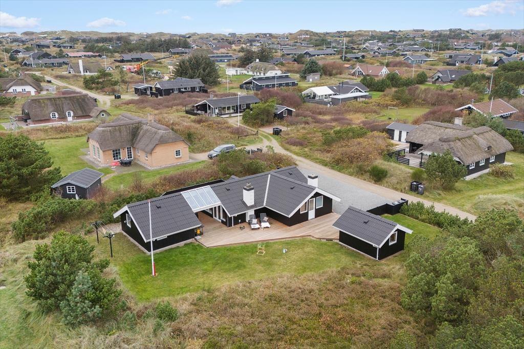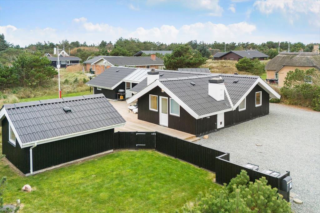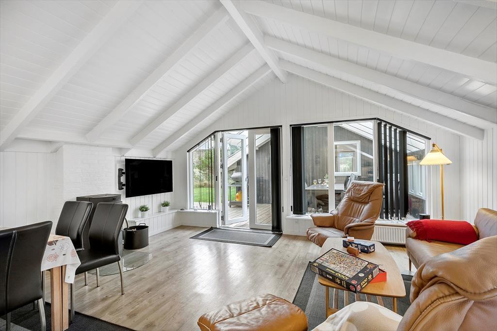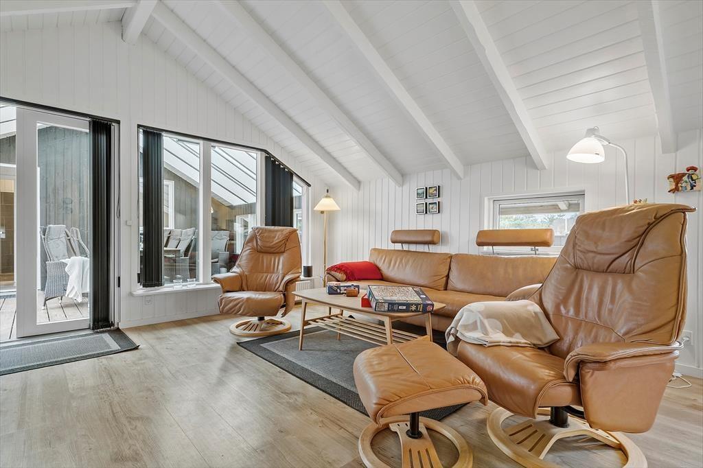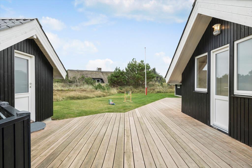 Feriehuset har en række gode terrasser, der giver jer mulighed for at nyde livet under åben himmel. Mod vest kan I nyde aftensolen på en delvist overdækket terrasse, mens en afskærmet terrasse på husets anden side giver ro og privatliv til hyggelige stunder og måltider udendørs. Med havemøbler, liggestole og en gasgrill er alt klar til grillmiddage og afslappende eftermiddage i solen. Den åbne naturgrund omkring huset skaber samtidig en perfekt ramme for leg og afslapning, så både børn og voksne kan nyde ferielivet fuldt ud.