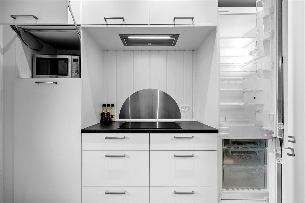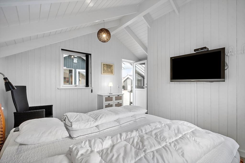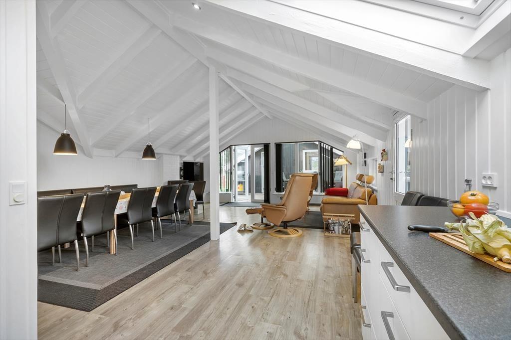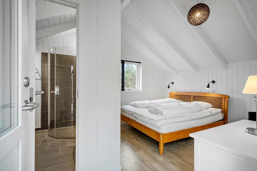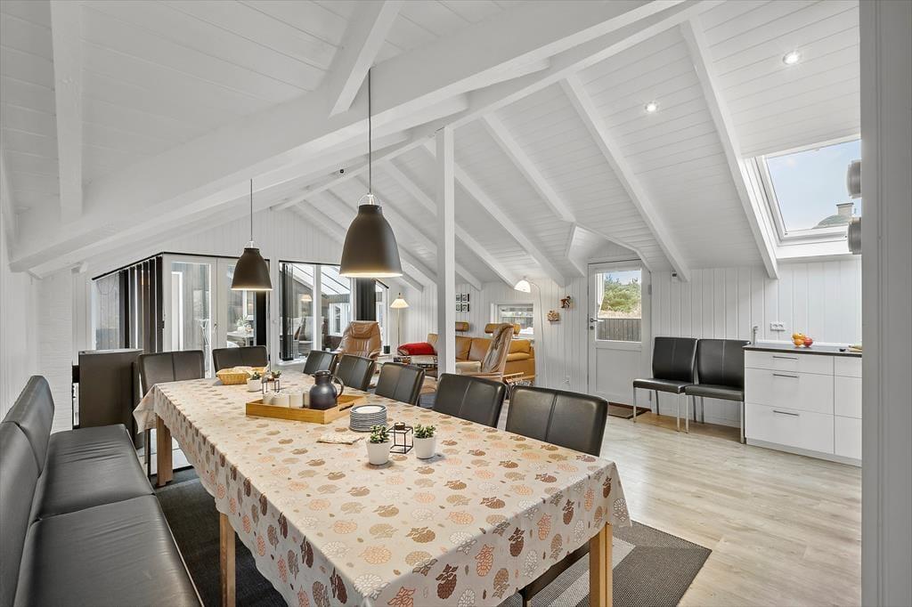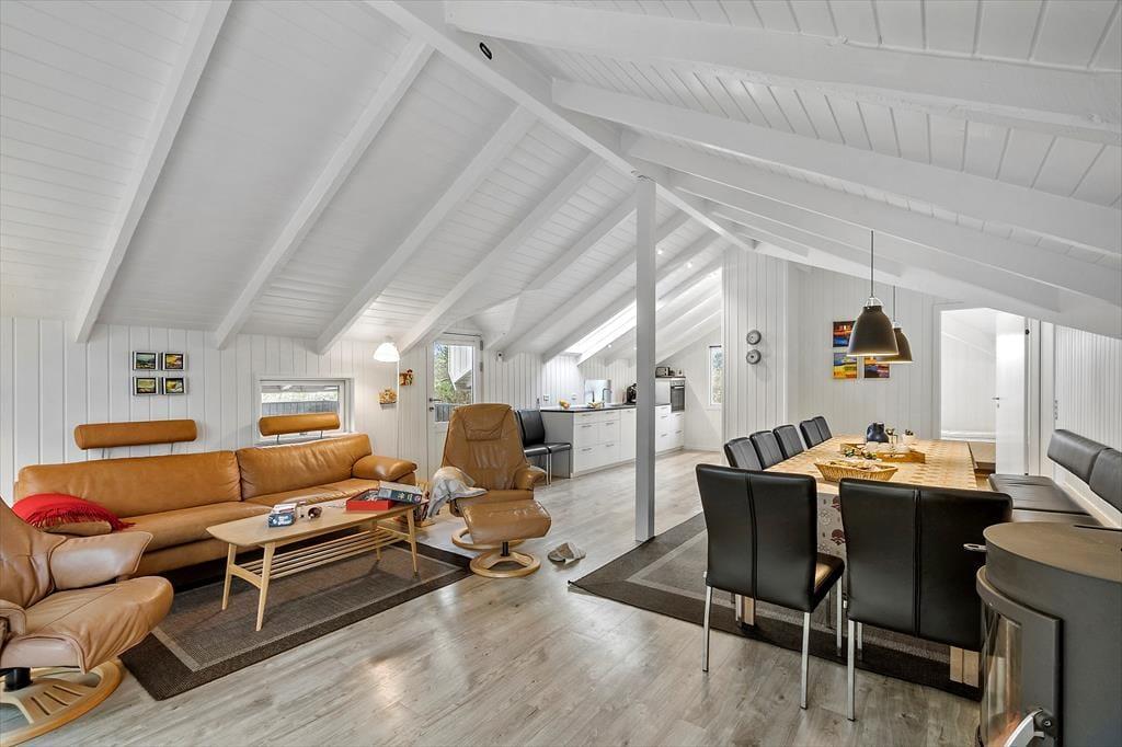 Når I træder indenfor, bliver I mødt af en lys og hyggelig indretning, hvor det åbne alrum udgør husets naturlige samlingspunkt. Her kan I samles om spisebordet til måltider, nyde brændeovnens varme på køligere dage eller slappe af i sofahjørnet med en god bog eller en film. Feriehuset har tre gode soveværelser, hvoraf to er indrettet med dobbeltsenge og ét med to enkeltsenge, så alle får en god nattesøvn. Badeværelset er udstyret med gulvvarme, så I kan få en varm start på dagen. I annekset finder I et af soveværelserne og et badeværelse – en oplagt løsning for dem, der ønsker lidt ekstra privatliv under ferien.