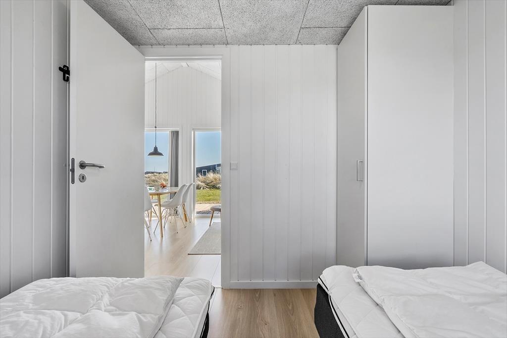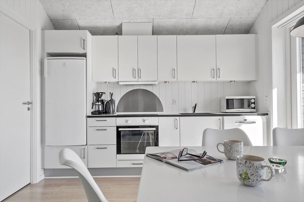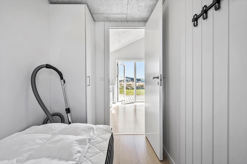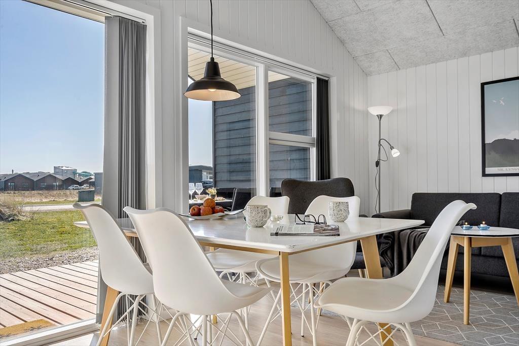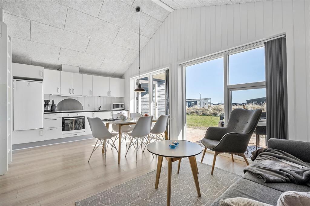 Træd indenfor i et lyst og moderne feriehus, hvor rammerne er sat for afslappede dage i feriestemning. Den åbne indretning skaber en indbydende atmosfære, hvor samvær er i centrum. Sommerhusets hjerte er den rummelige stue, hvor store panoramavinduer lukker lyset og naturen indenfor. Her kan du slå dig ned i sofaen med en god bog og på de køligere dage kan du mærke varmen brede sig i rummet, mens du nyder en dejlig kop te. Efter en dag ved stranden kan du lave et lækkert aftensmåltid i det veludstyrede køkken og samles omkring spisebordet til lange samtaler og brætspil. De bløde senge i de indbydende soveværelser sikrer en god nats søvn, så du vågner veludhvilet og klar til en ny dag med ferieeventyr. Badeværelset byder på velvære med en skøn bruser, hvor du kan skylle dagens oplevelser af dig og lade kroppen slappe af i det varme vand.