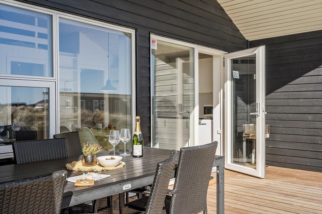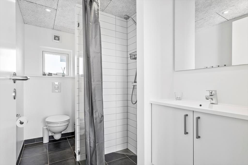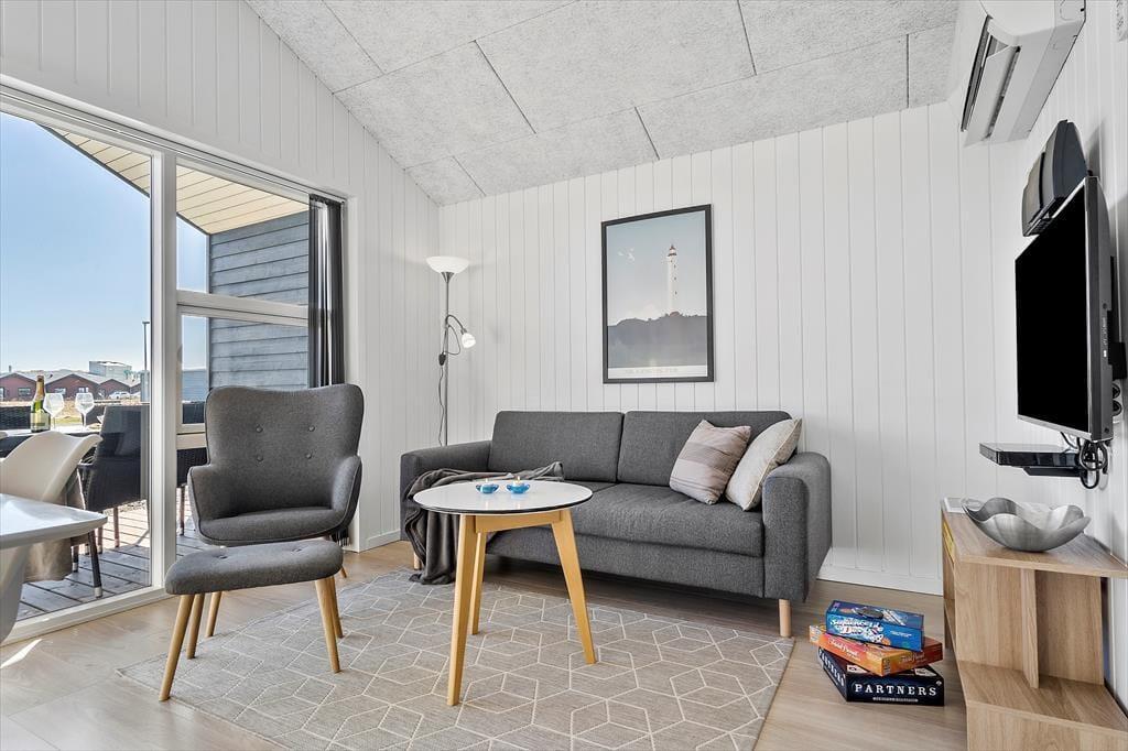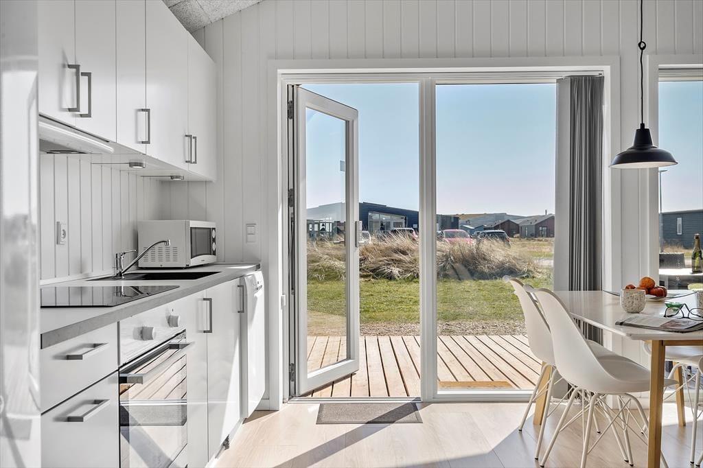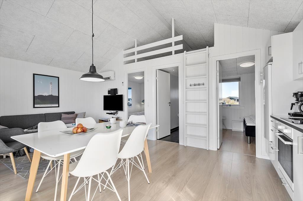 Træd indenfor i et lyst og moderne feriehus, hvor rammerne er sat for afslappede dage i feriestemning. Den åbne indretning skaber en indbydende atmosfære, hvor samvær er i centrum. Sommerhusets hjerte er den rummelige stue, hvor store panoramavinduer lukker lyset og naturen indenfor. Her kan du slå dig ned i sofaen med en god bog og på de køligere dage kan du mærke varmen brede sig i rummet, mens du nyder en dejlig kop te. Efter en dag ved stranden kan du lave et lækkert aftensmåltid i det veludstyrede køkken og samles omkring spisebordet til lange samtaler og brætspil. De bløde senge i de indbydende soveværelser sikrer en god nats søvn, så du vågner veludhvilet og klar til en ny dag med ferieeventyr. Badeværelset byder på velvære med en skøn bruser, hvor du kan skylle dagens oplevelser af dig og lade kroppen slappe af i det varme vand.