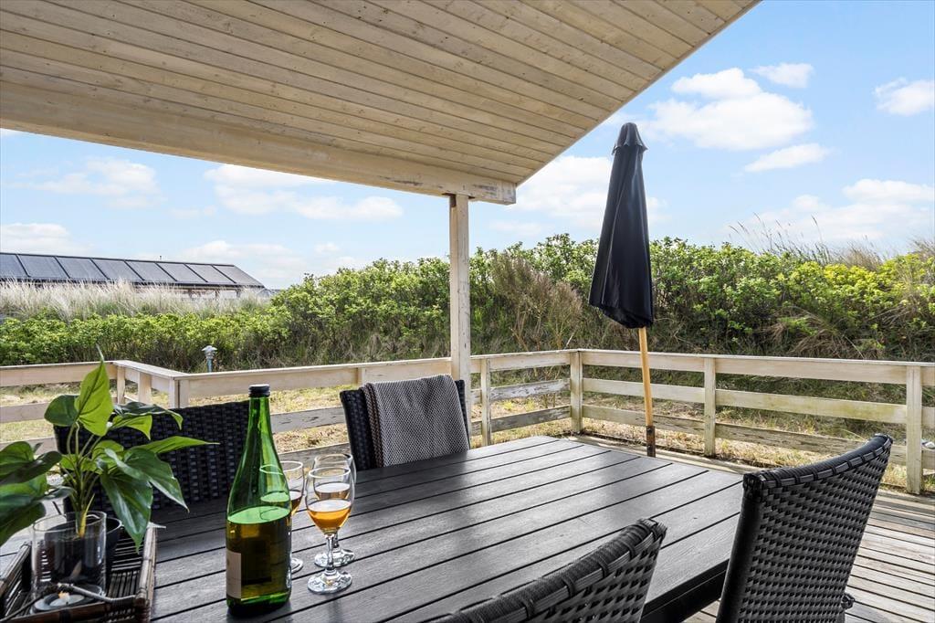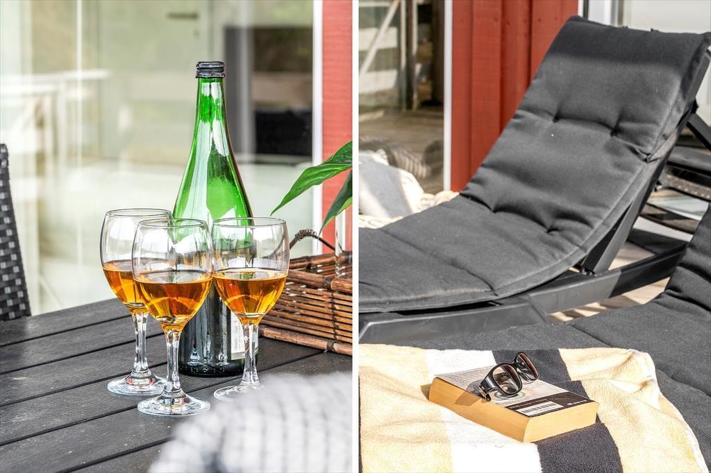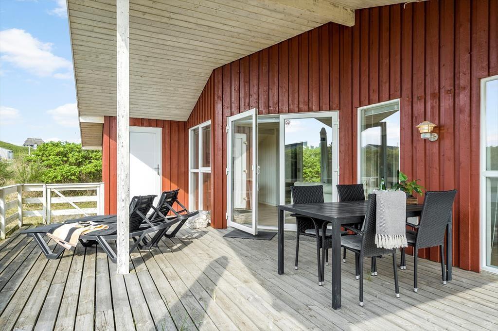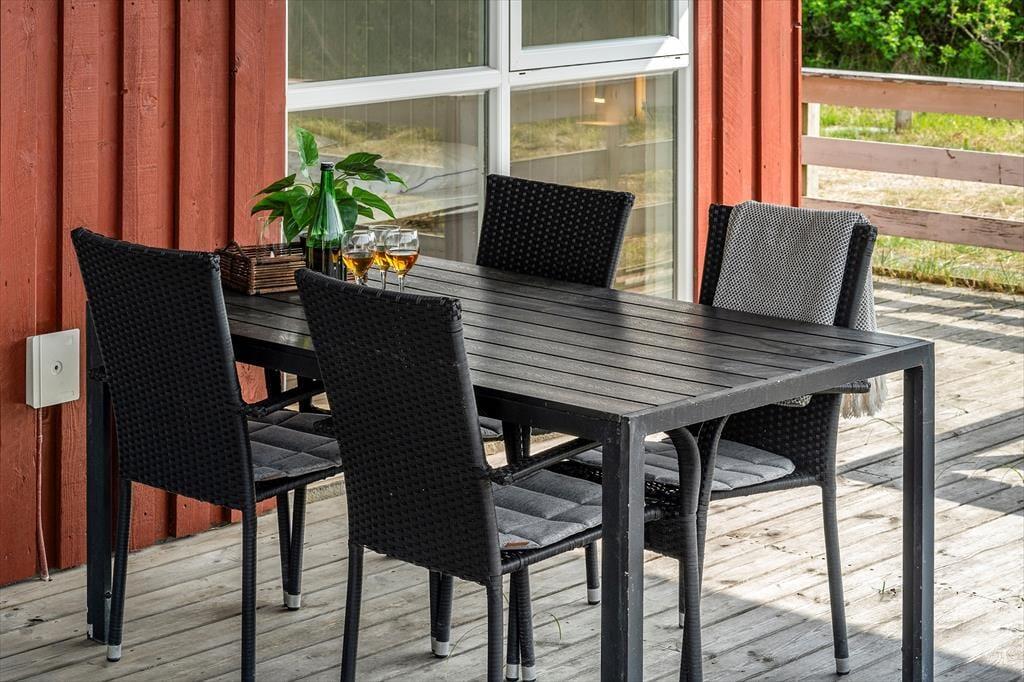 Som tidligere nævnt har I direkte adgang fra stuen til en dejlig terrasse. Den er delvist overdækket og breder sig både syd og øst for huset, og med liggestole, havemøbler og grill er der virkelig lagt op til sommerhygge. Terrassen er helt aflukket med hegn, hvilket kan være et plus for både hundeejere og småbørnsfamilier, og naturgrundens hybenbuske og anden beplantning sørger for, at I kan slappe af i ganske ugenerede omgivelser.