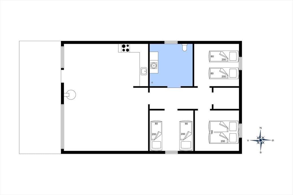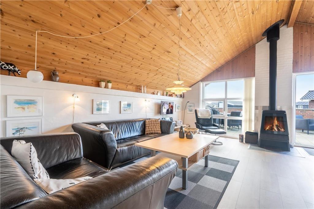 Husets hjerte er det store køkkenalrum der ligger i åben forbindelse med stuen. Stuen er smagfuldt og enkelt møbleret og indbyder til afslapning: her er en dejlig brændeovn med stor glasrude så ilden kan beundres, mens den spreder varme på en kold dag, En god lænestol er placeret foran vinduerne, så du kan fordybe sig i en god bog eller blot lade tankerne flyve mens I kigger på klitternet mod vest. Vil du lade dig underholde kan du se både tyske og danske kanaler på fladskærms Tv’et eller benytte det gratis trådløse internet. Sommerhuset har også en ny og lækker sauna og badeværelset er velindrettet med bruser og vaskemaskine. Der er 3 gode værelser - den ene med en dobbeltseng, den anden med 2 enkeltsenge - der kan sættes sammen til en dobbeltseng og det tredje værelse har to enkeltsenge.