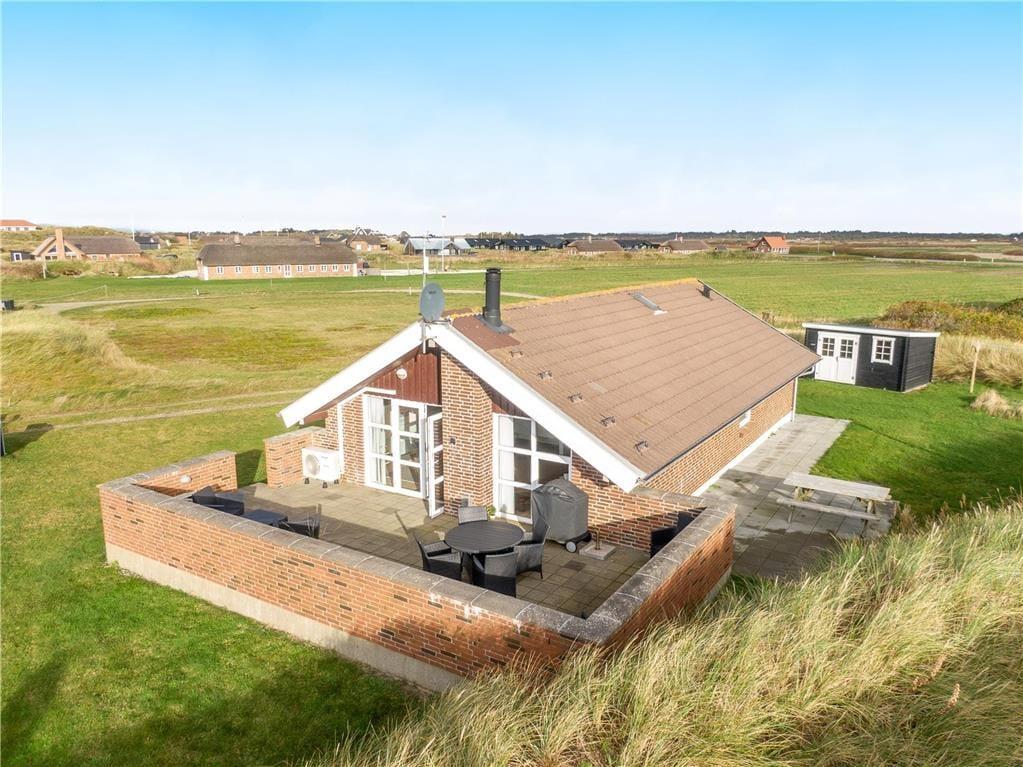 Rundt om grunden mod nabohusene er der en klit så man kan være uforstyrret i huset. En stor græsplæne med plads til boldspil og leg. Huset har en stor flisebelagt terrasse mod sydvest med havemøbler, liggestole og en grill. Mod nordøst kan man nyde udsigten ud over det grønne område og videre mod Søndervig Golfbane hvor I kan følge spillet live.