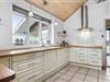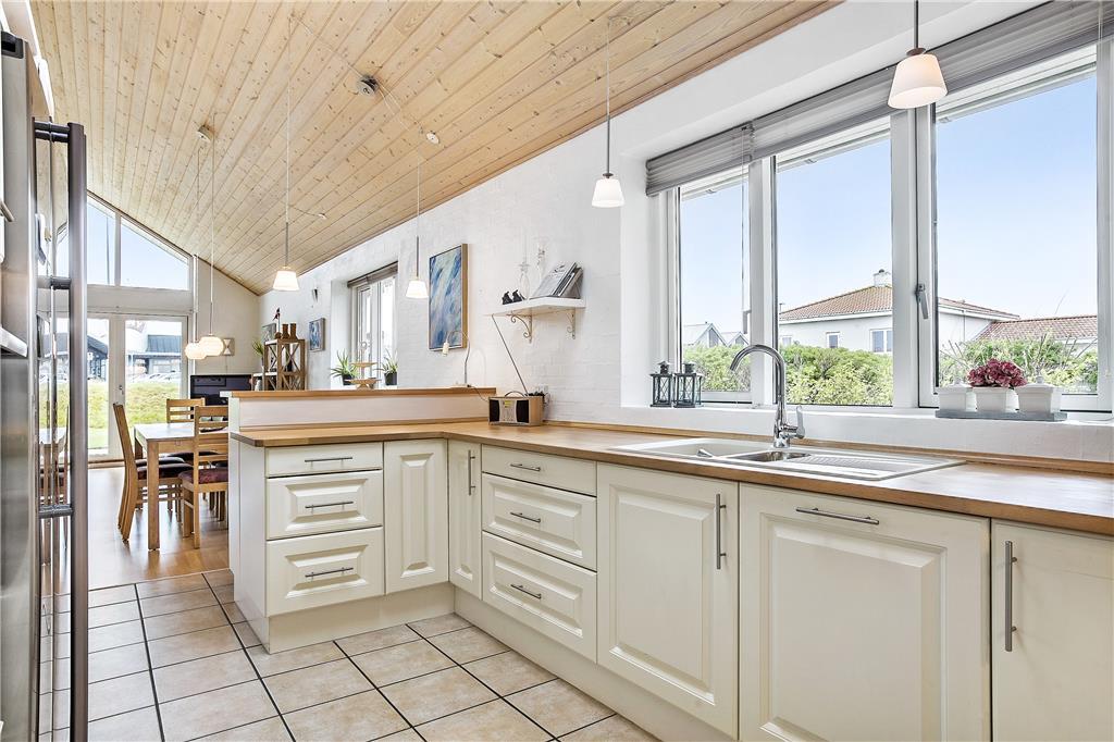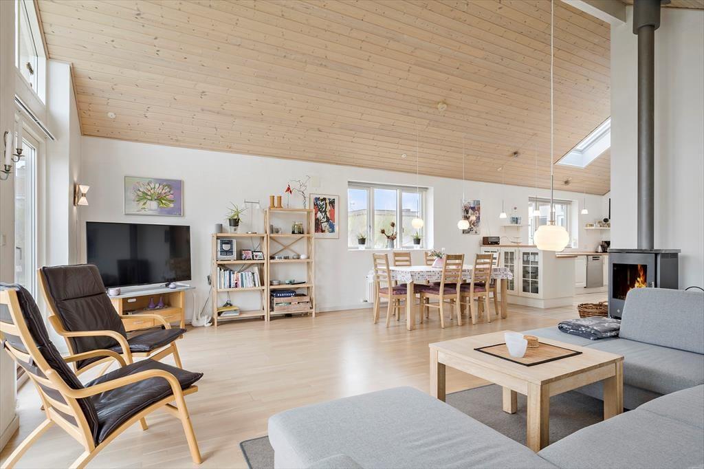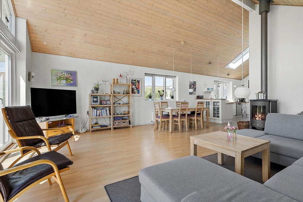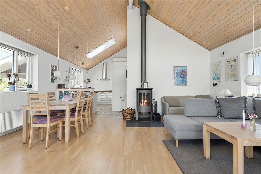 Indenfor venter et sommerhus, der både er rummeligt og indbydende. Her finder du store soveværelser med indbyggede skabe, så der er masser af plads til både tøj og ferieudstyr. I det ene badeværelse er der et lækkert spabad, hvor du kan nyde en afslappende stund efter en dag med aktiviteter. Huset har en åben planløsning, der gør det nemt at samles i de fælles rum. Stuen er lys og indbydende med et komfortabelt møblement, hvor du kan sætte dig og nyde varmen fra den knitrende brændeovn. Hele huset emmer af hygge og funktionalitet, hvilket gør det særdeles velegnet til både voksne og den store familie, der ønsker at være tæt på Søndervigs mange faciliteter, samtidig med at de kan trække sig tilbage til ro og privatliv.