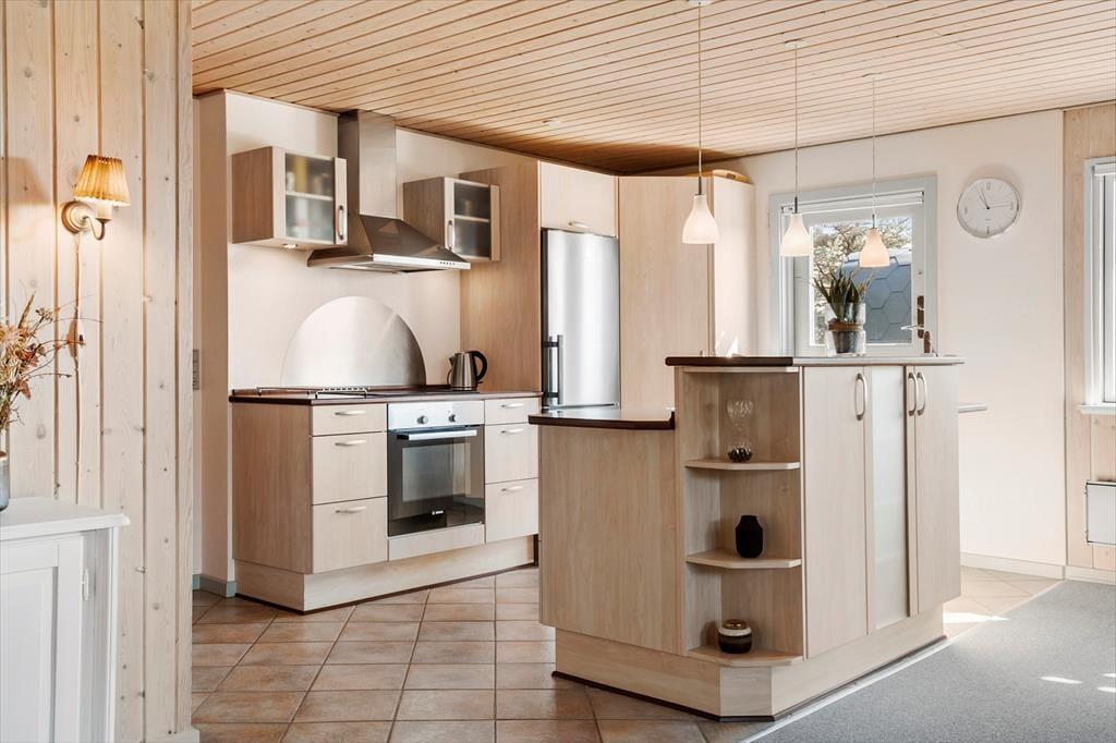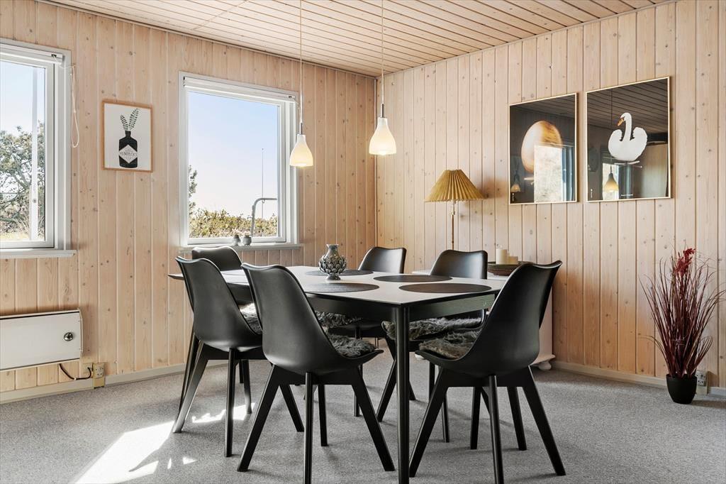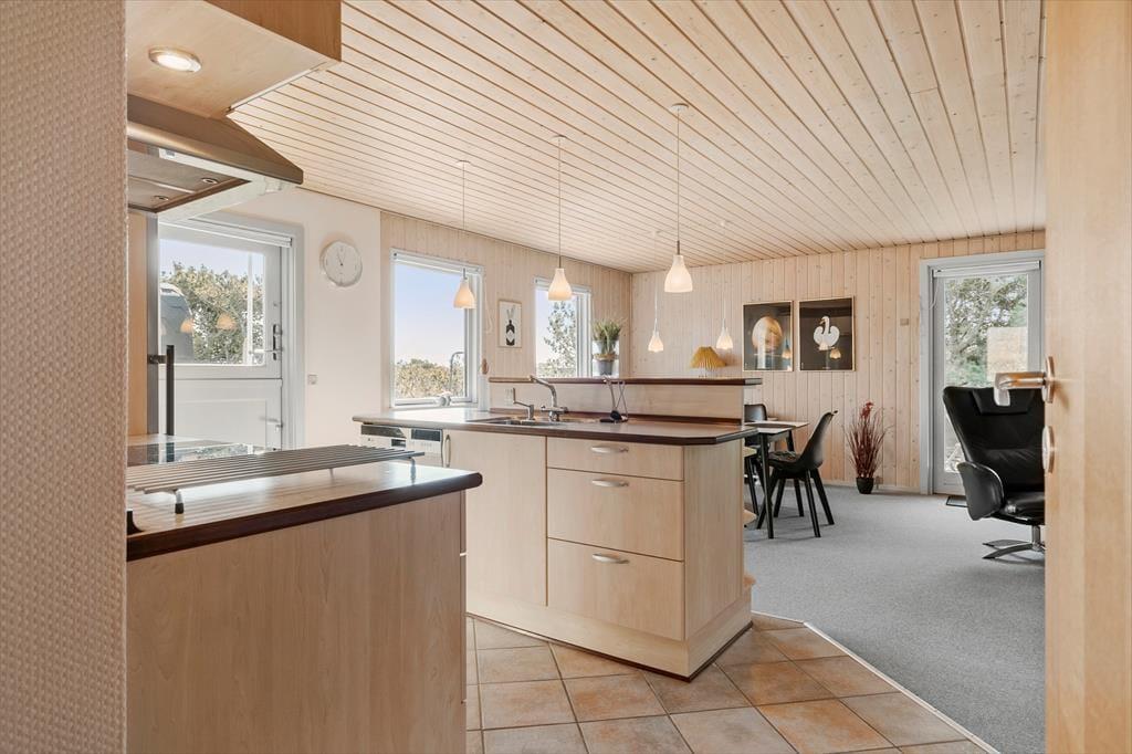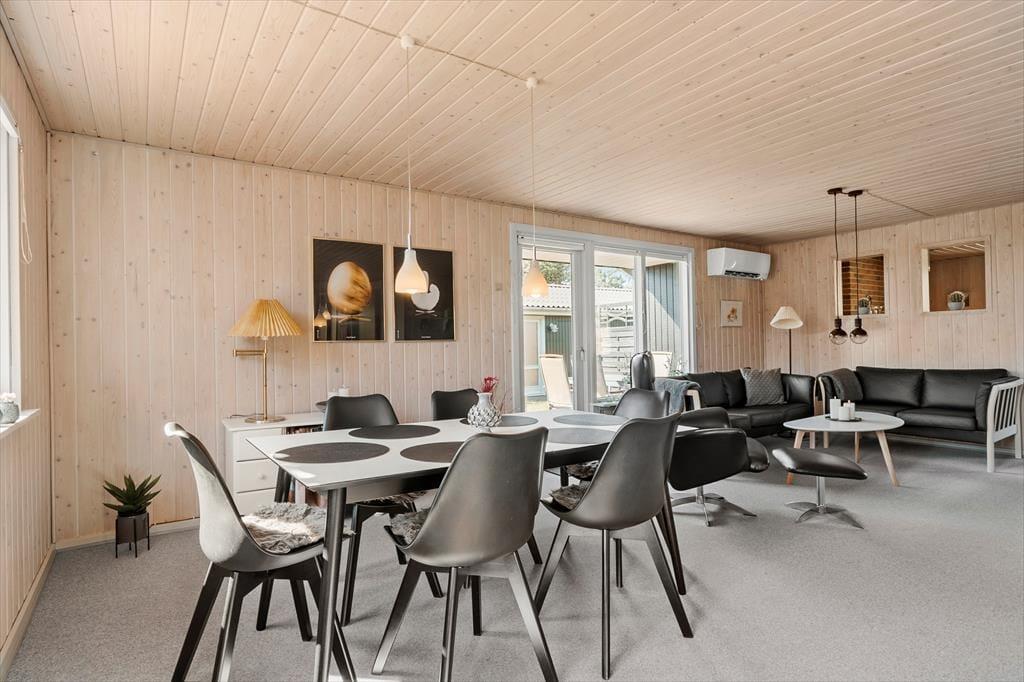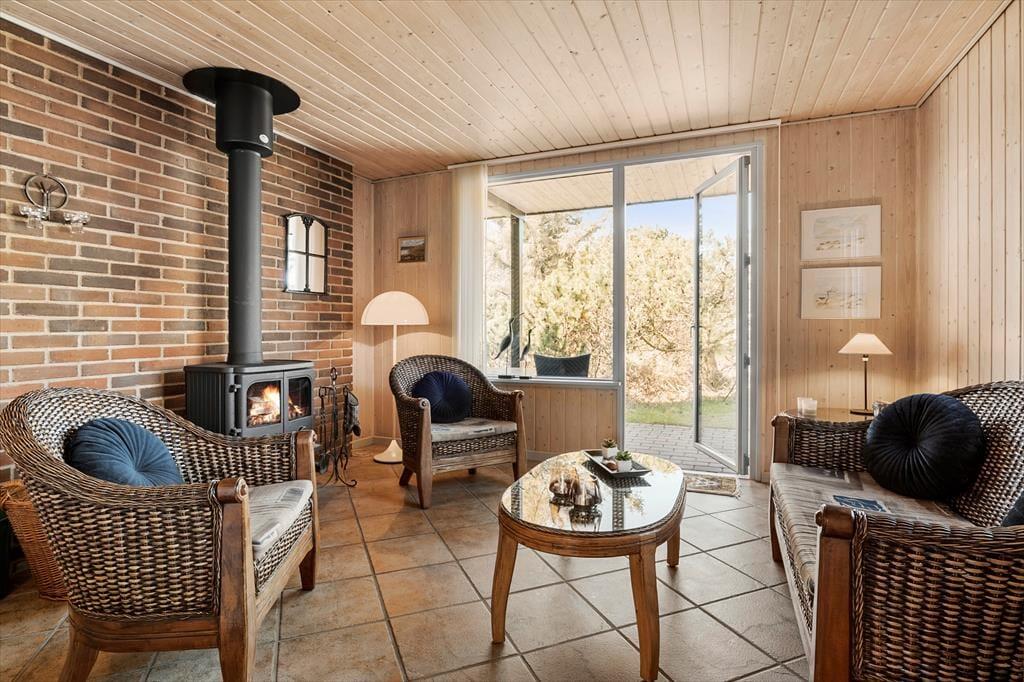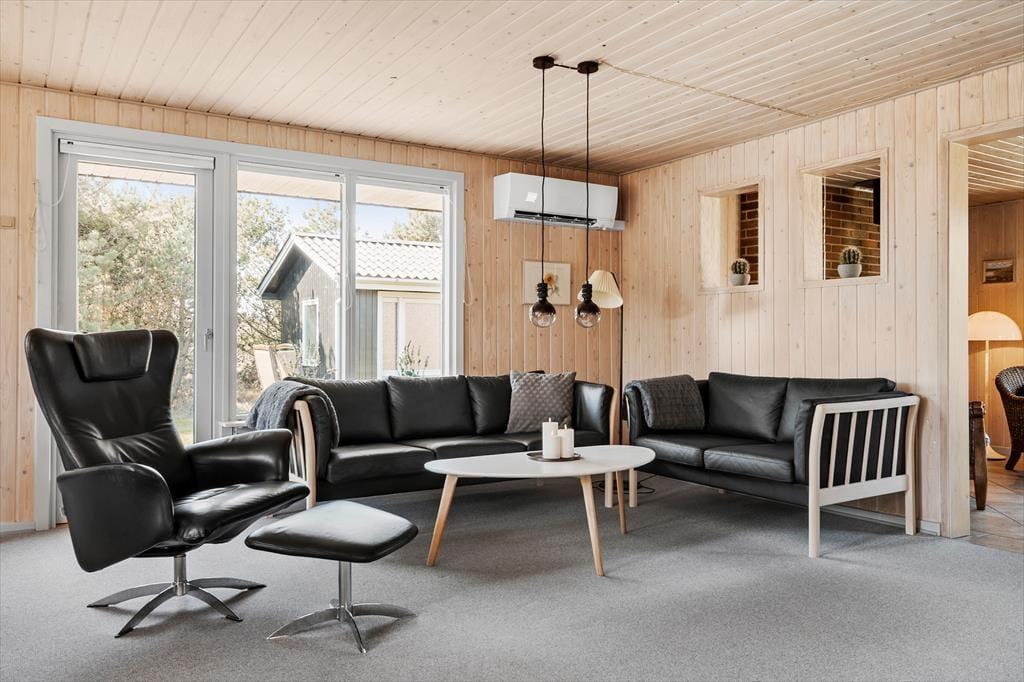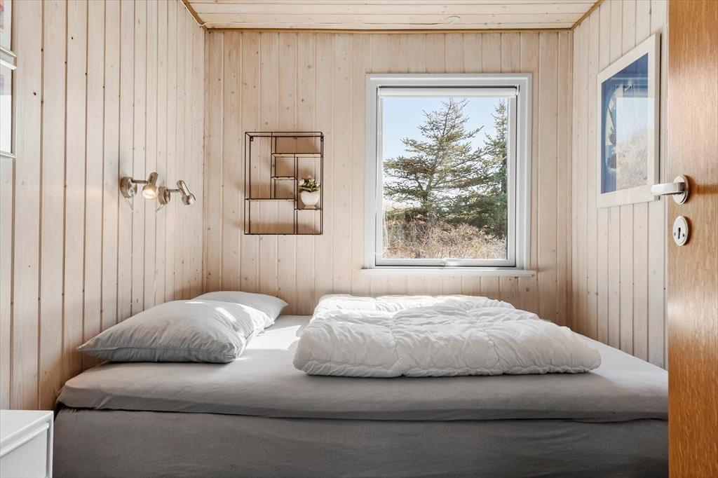 Det 90 m2 store sommerhus har en både praktisk og hyggelig indretning, der passer godt til seks personer. Fra gangen har I adgang til tre soveværelser og et badeværelse med bruser, vaskemaskine og gulvvarme, mens stue og køkken ligger samlet i opholdsafdelingen. Her kan I hygge jer med madlavning, måltider og sofaafslapning med en spændende bog eller en film på fladskærmen – og ellers kan I rykke ind i den tilstødende stue for at drikke te og slappe af nær brændeovnen. Sommerhusets varmepumpe kan både køle og varme alt efter behovet, og den hurtige WI-FI -forbindelse på 1000/1000 Mbit sørger for, at I kan følge med i nyhederne og holde vennerne opdaterede om jeres ferieoplevelser og den yngre generation kan streame film eller spil på egne enheder uden problemer