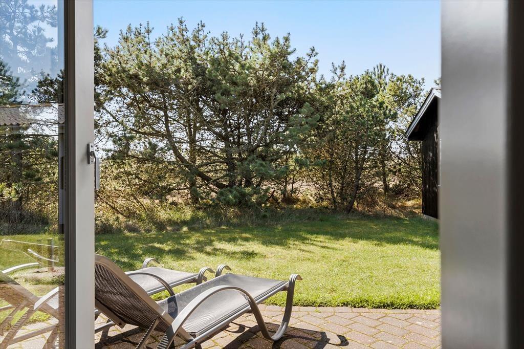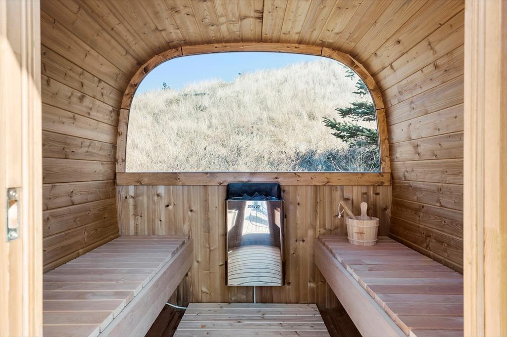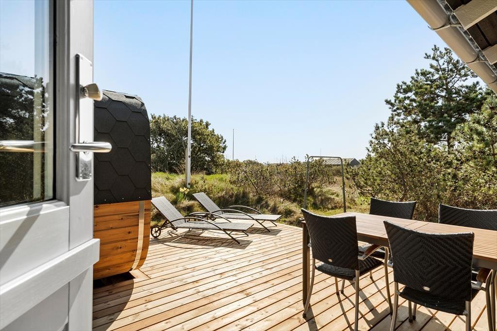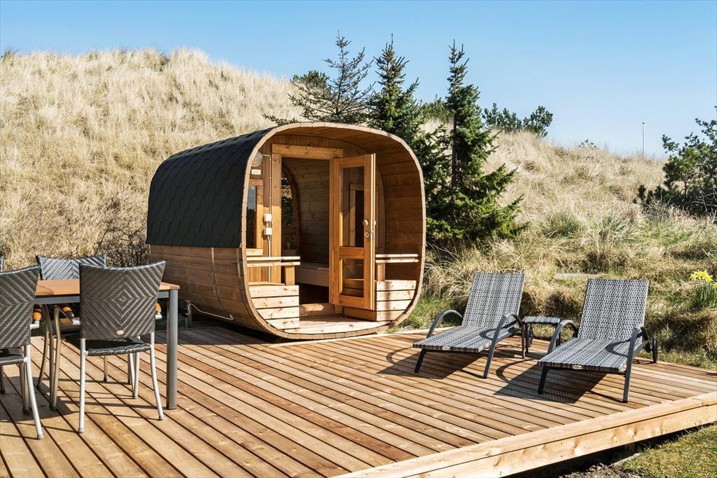 Hyggestunderne kan oplagt udspille sig i det fri på den 2500 m2 store naturgrund – og også inde i tøndesaunaen, der ligger hyggeligt i læ af klitterne i forbindelse med en dejlig træterrasse. Er I vendt hjem fra en kølig dukkert eller en dag med windsurfing eller golf, er det intet mindre end herlig at sidde her i varmen. Fra toppen af klitten har I et flot vue over det naturskønne sommerhusområde, og husets mange gode terrasser gør det nemt at finde den helt rette opholdsplads, uanset om I går efter sol, læ eller skygge under overdækningen.