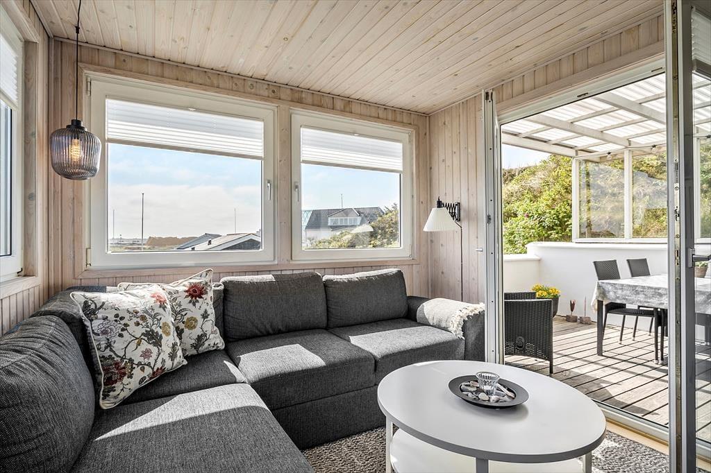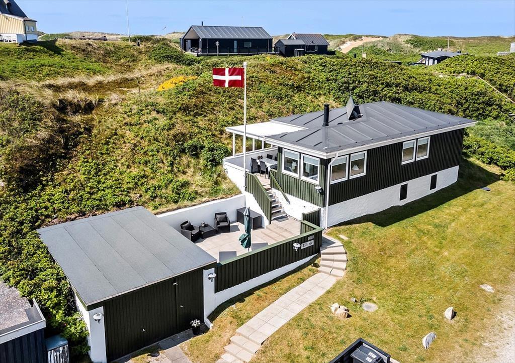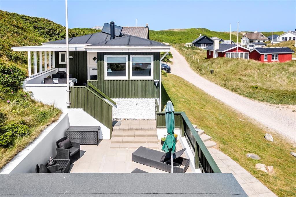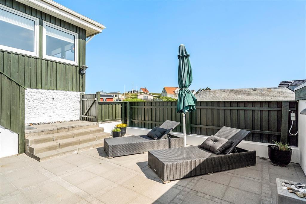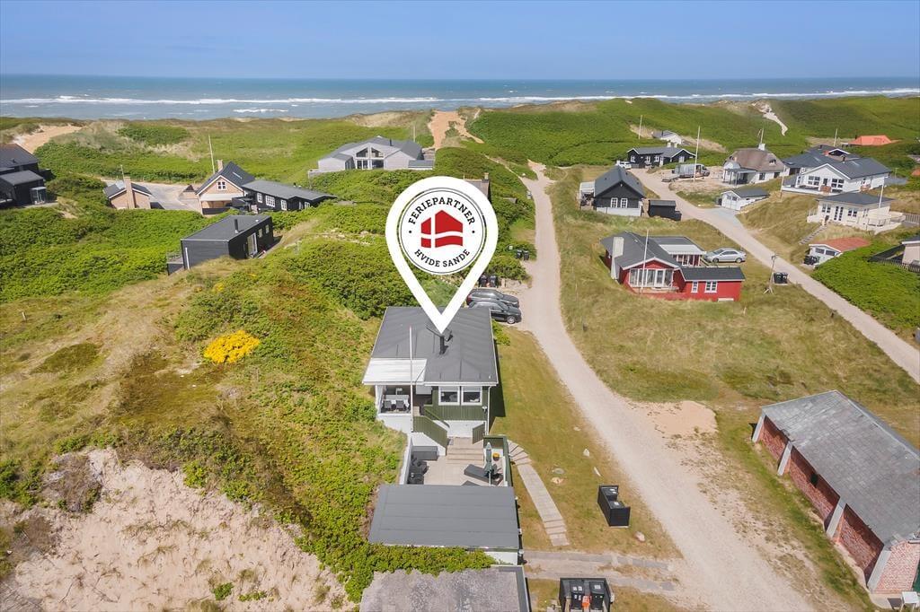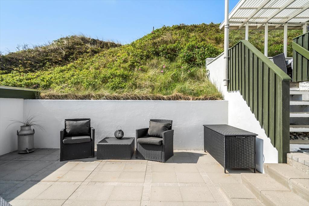 Udearealerne er mindst lige så skønne som selve sommerhuset, for her kan I vælge mellem at have udsigt til vestkystens klitter eller helt til Ringkøbing Fjord, når I slapper af med kaffen eller en god bog. En delvist overdækket terrasse ligger mod øst, mens en åben terrasse ligger vest for huset, og dertil kommer en stor gårdhave, der skærmes af hegn. I har gode havemøbler til rådighed foruden loungemøbler, parasol og en grill, og en høj klit er med til at sørge for, at huset og udearealerne ligger godt i læ.