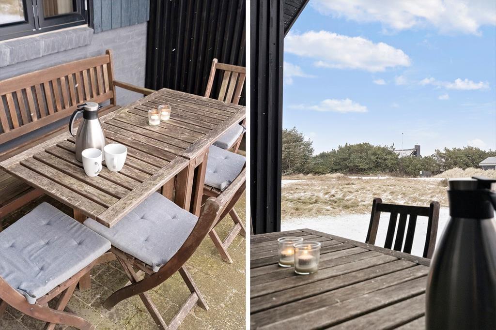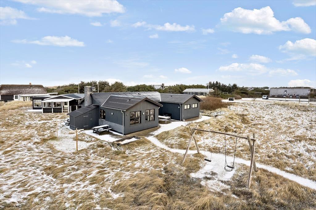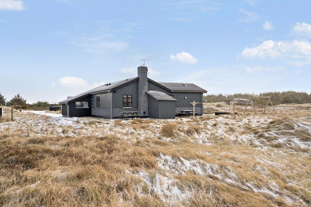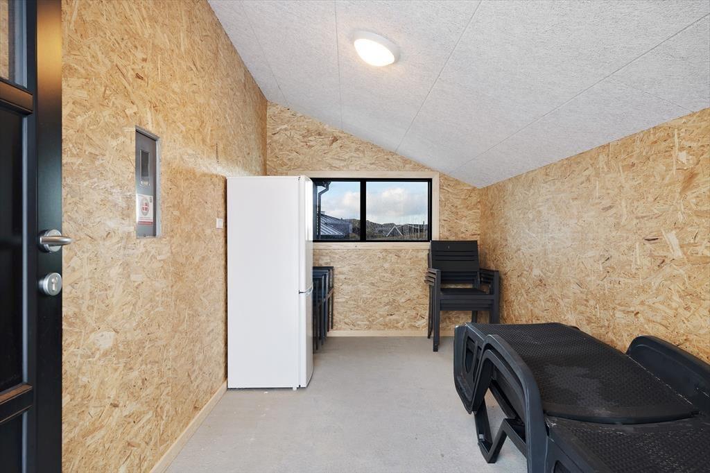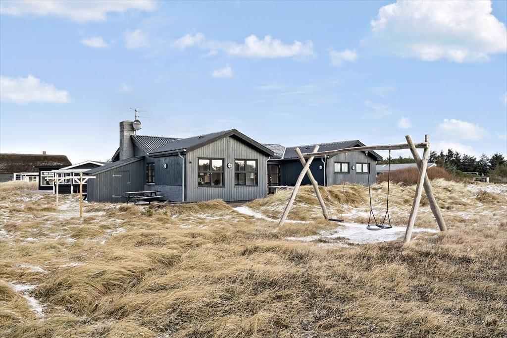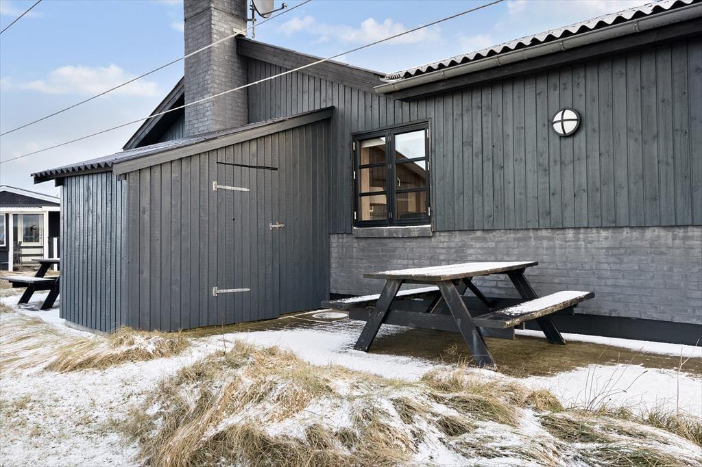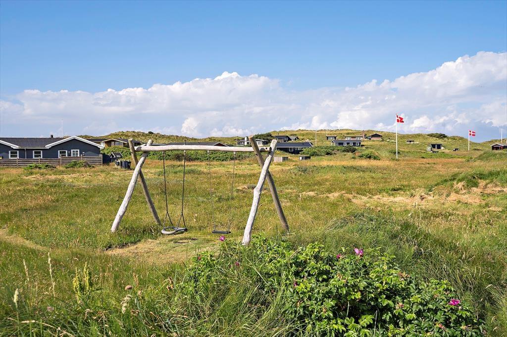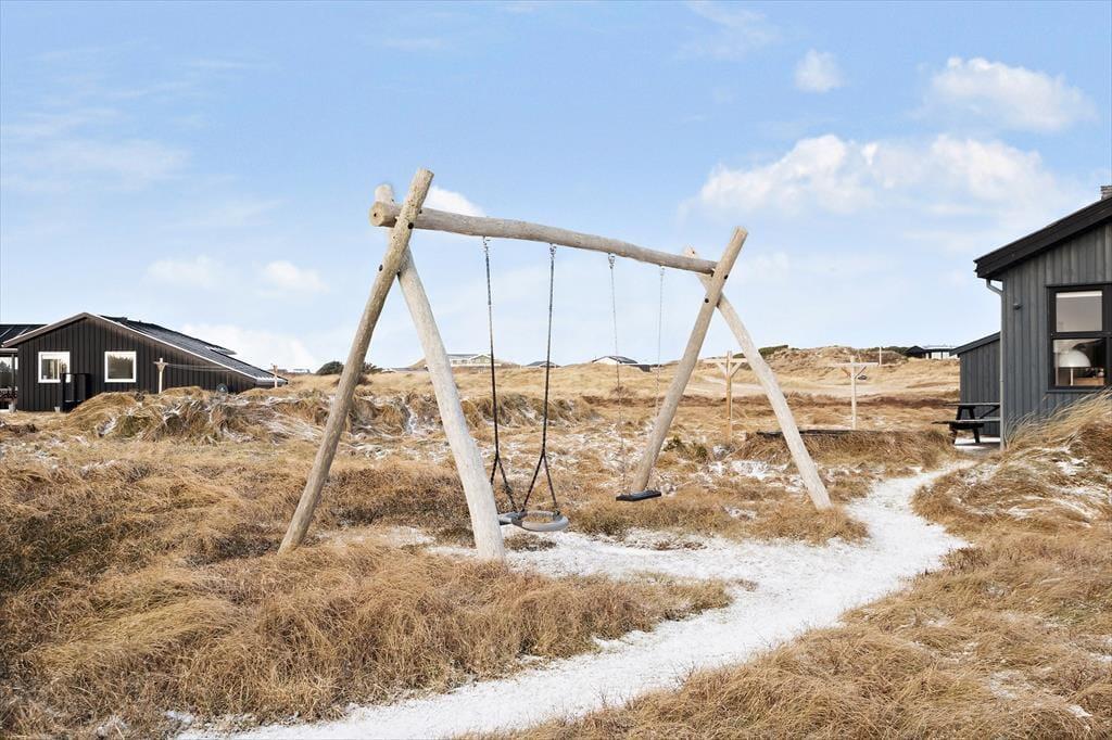 Rundt om sommerhuset venter en sandkasse, et gyngestativ og flere terrasseområder – inklusiv en sydvendt hyggekrog, der ligger godt i læ mellem husets længer. Mod øst ligger der en overdækket terrasse, og I kan også sætte jer på vestsiden for at se solen sænke sig langsomt ned bag klitterne. I har gode havemøbler, liggestole og en grill til rådighed, og både naturgrunden og det omgivende hedelandskab giver jer en køn ramme om driverlivet. Som en nyhed i 2024 er der blevet sat et skur op med en ekstra køle- og fryseskab samt 3 stikkontakter, der giver mulighed for at oplade elcykler i et aflåst skur.