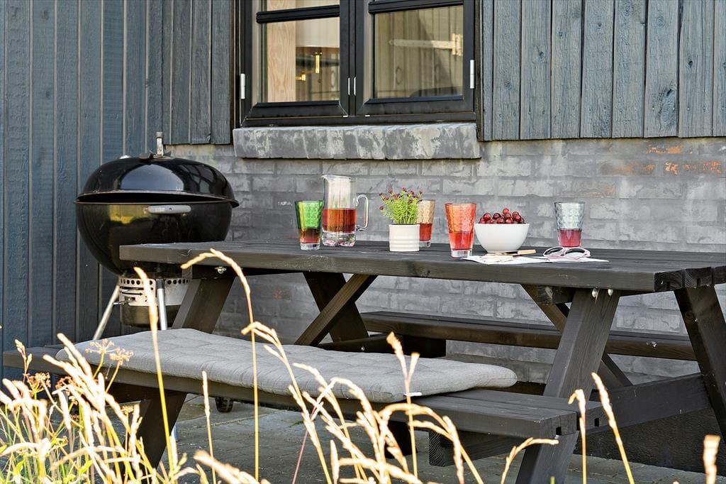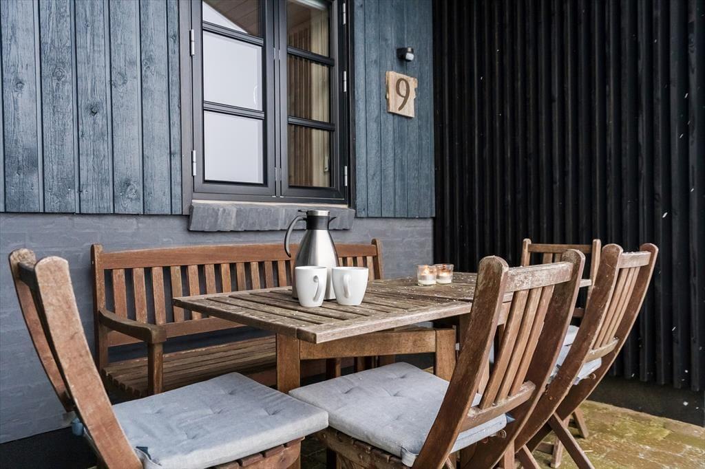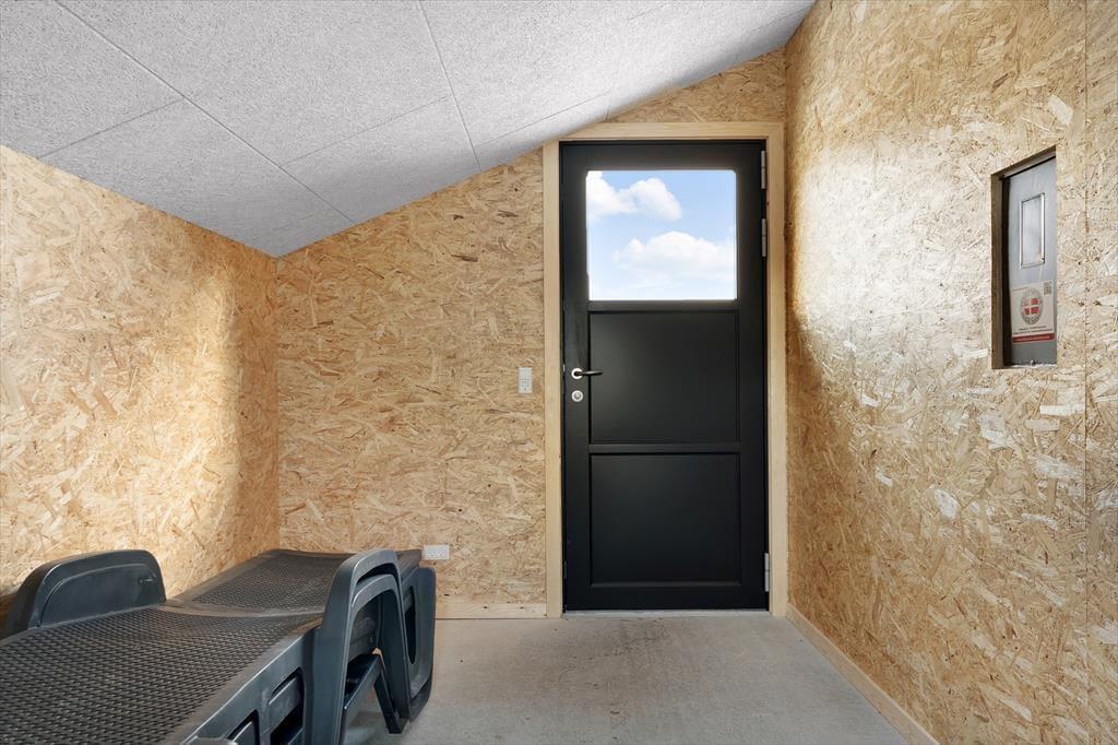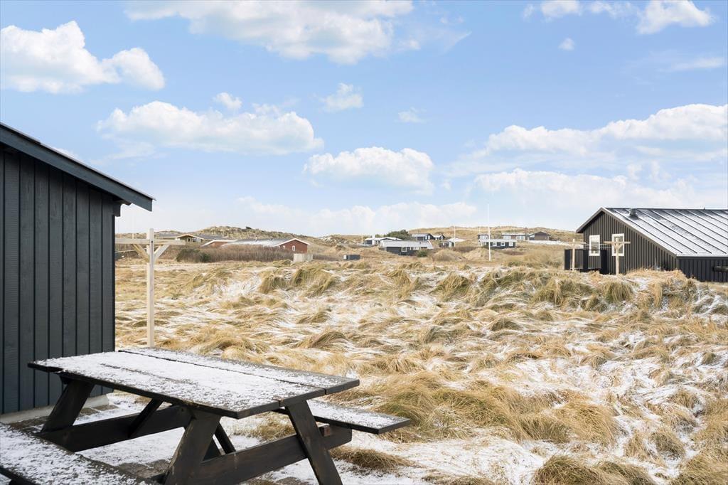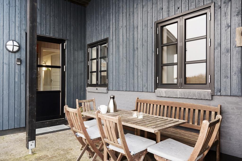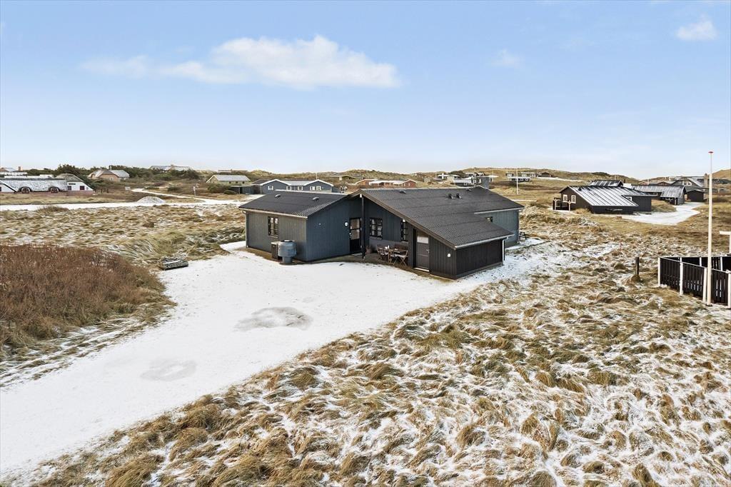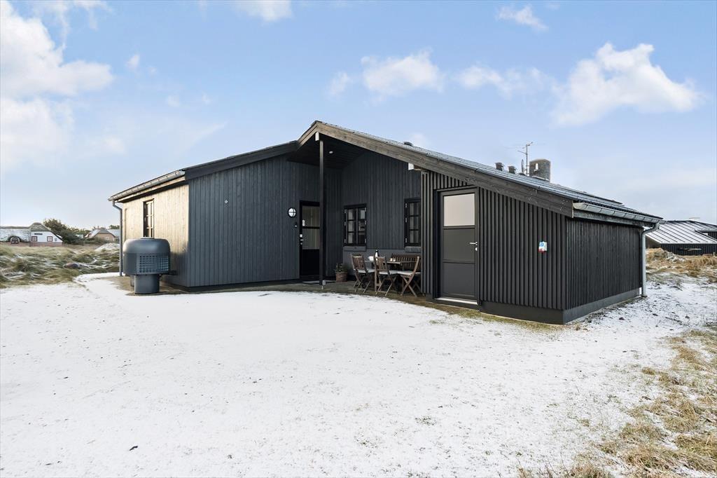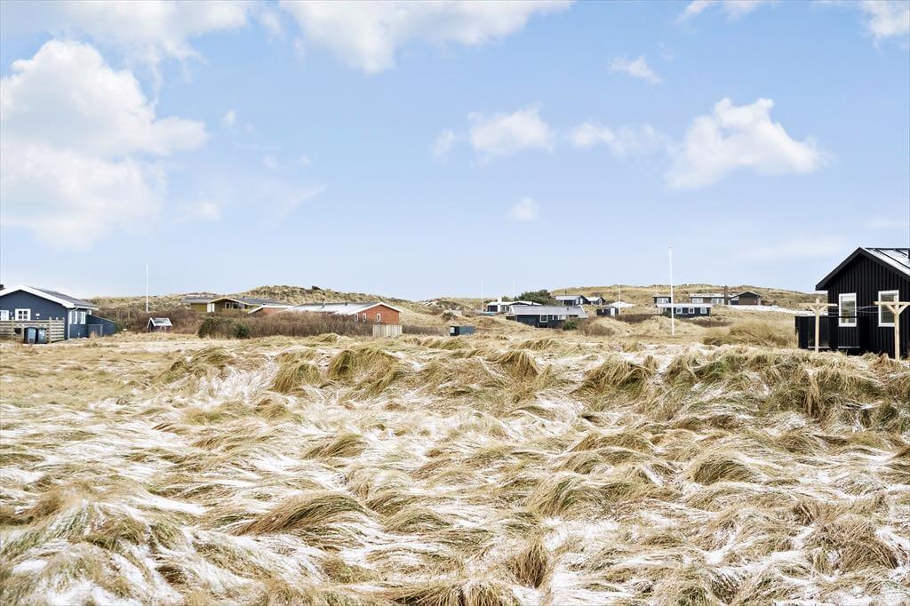 Rundt om sommerhuset venter en sandkasse, et gyngestativ og flere terrasseområder – inklusiv en sydvendt hyggekrog, der ligger godt i læ mellem husets længer. Mod øst ligger der en overdækket terrasse, og I kan også sætte jer på vestsiden for at se solen sænke sig langsomt ned bag klitterne. I har gode havemøbler, liggestole og en grill til rådighed, og både naturgrunden og det omgivende hedelandskab giver jer en køn ramme om driverlivet. Som en nyhed i 2024 er der blevet sat et skur op med en ekstra køle- og fryseskab samt 3 stikkontakter, der giver mulighed for at oplade elcykler i et aflåst skur.
