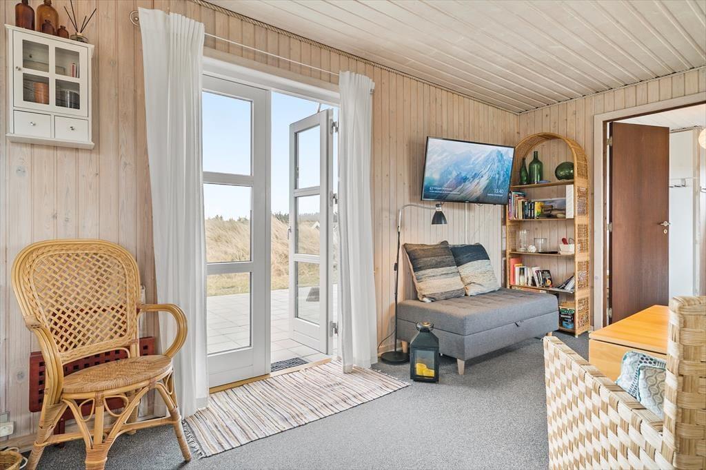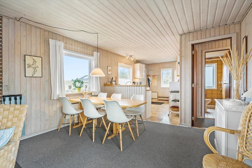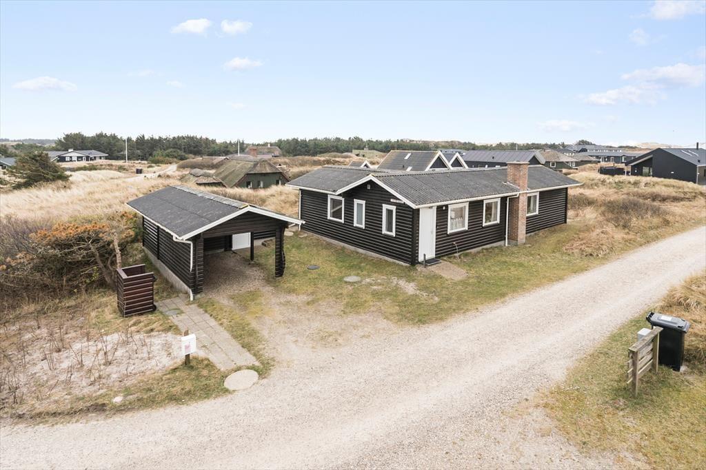 Her på Holmsland Klit bor I tæt på både Vesterhavet og Ringkøbing Fjord, så fra den kuperede naturgrund kan I se lige hen på klitterne, og til den anden side er der fjordudsigt. Et stort terrasseområde breder sig sydvest for huset, og med delvis afskærmning og naturgrundens volde har I både læ og privatliv, når I solbader eller hygger jer med en god kop kaffe. Ud mod vejen er der carport til bilen.