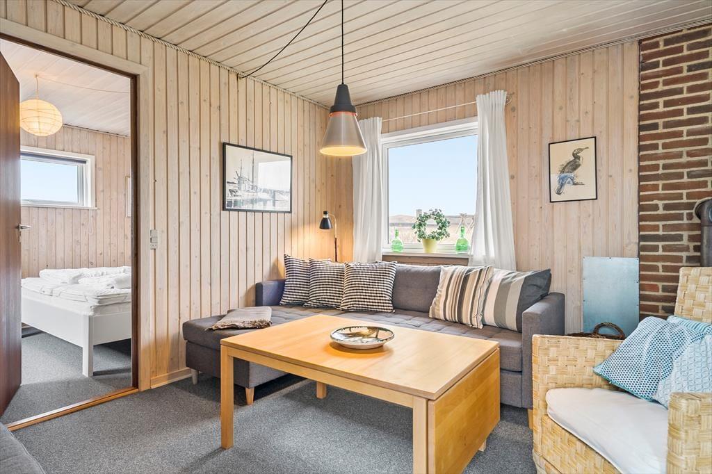 Sommerhusstemningen er helt i top inden døre, hvor I kan glæde jer til at slappe af med gode bøger, krydsogtværser eller en film på det 42” store fladskærms-tv. Uanset om I slænger jer i sofaen eller sidder samlet omkring spisebordet, kan I nyde varmen fra stuens brændeovn – med mindre vejret er så lunt og sommerligt, at I i stedet har åbnet havedøren på vid gab. Et praktisk indrettet køkken med opvaskemaskine, mikroovn og meget mere ligger i åben forbindelse af stuen, og derudover byder planløsningen på et funktionelt brusebadeværelse og tre soveværelser med plads til seks personer.