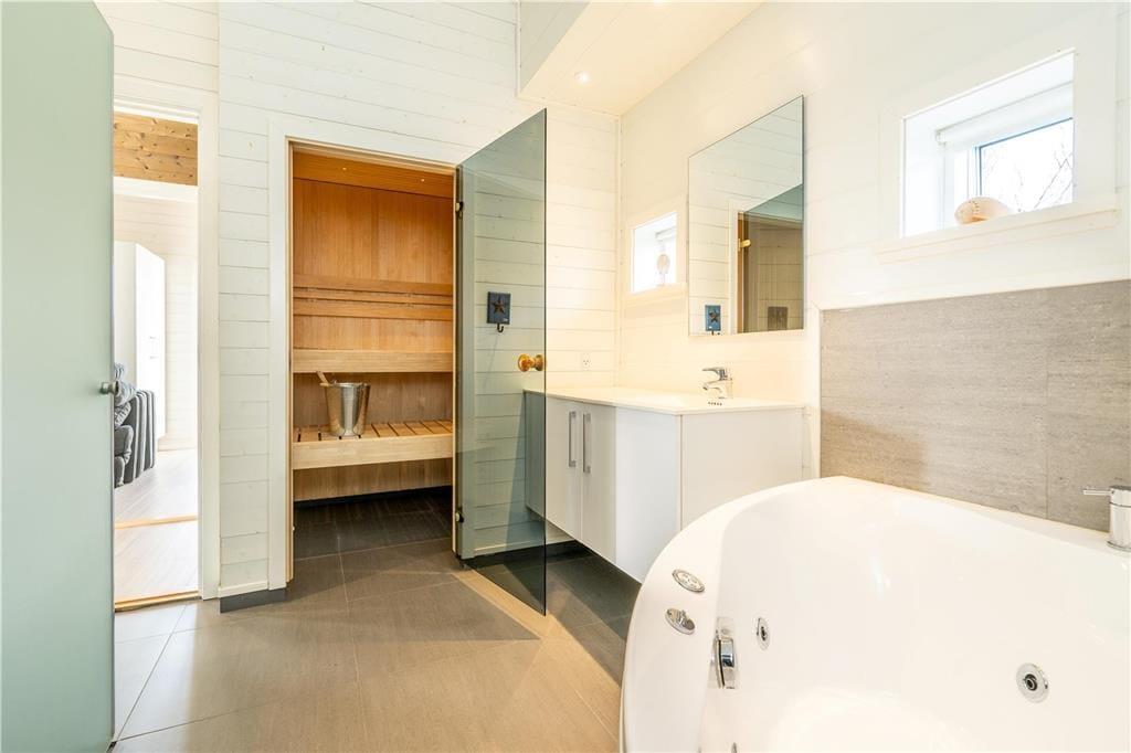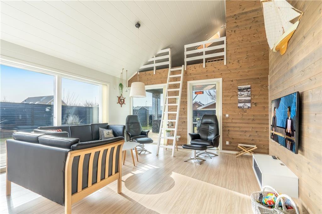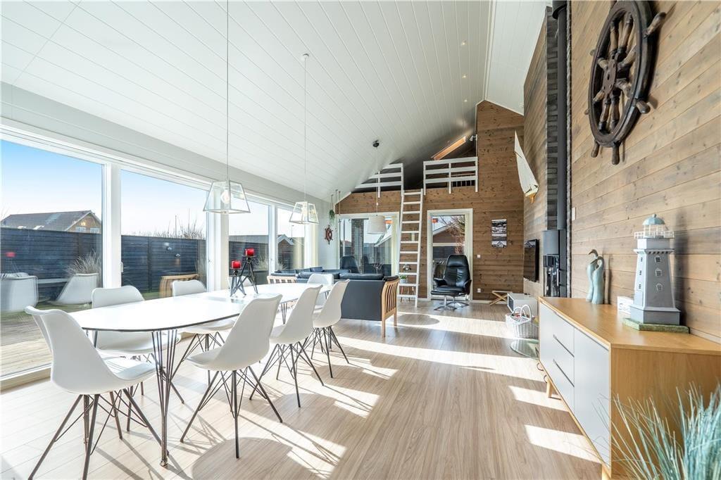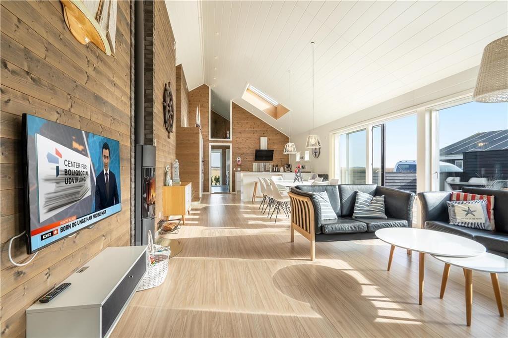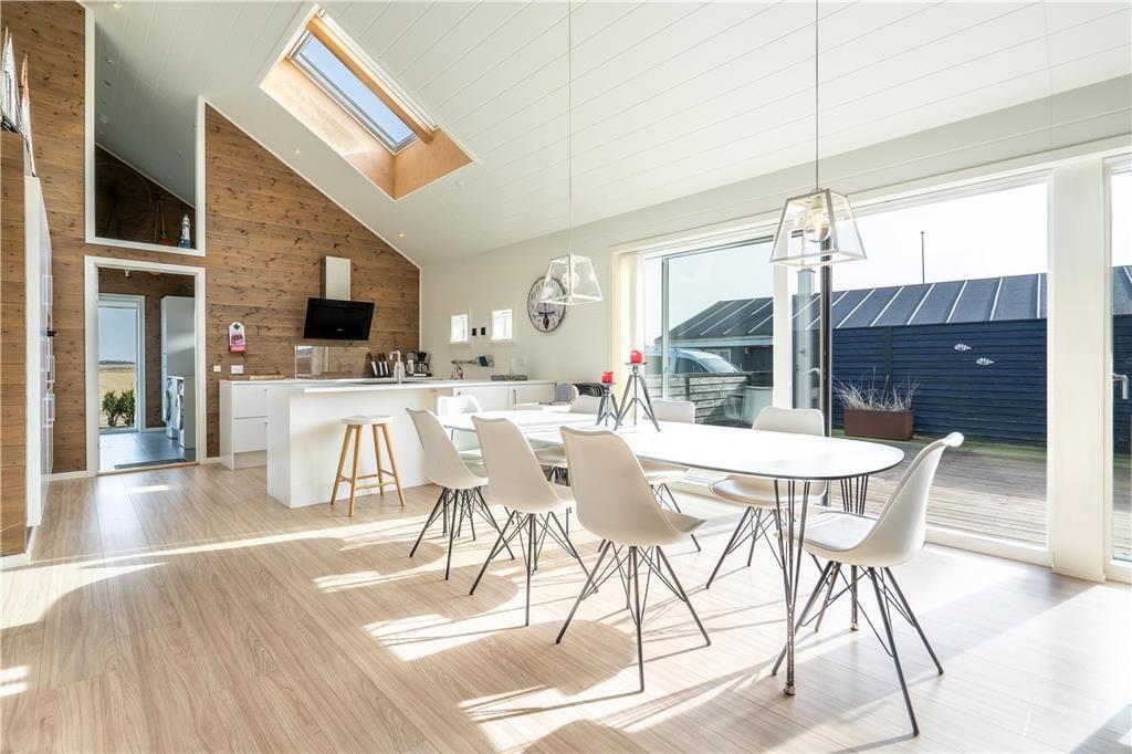 Den 130 m2 store og stilrene murstensejendom kan uden problemer rumme otte voksne og to børn, for der er fire gode soveværelser og en stor hems med plads til overnatning. Hvis I er mange samlet, er det rart, at der er to flotte badeværelser i huset, og så er det ene endda et rigtigt wellnessrum med spabad og sauna. I alle rum er der gulvvarme – selv i entréen, der er indrettet som et bryggers med vaskemaskine, tørretumbler og håndvask. Bedst af alt er opholdsrummet, der imponerer med flot loftshøjde, smukt lysindfald og moderne møblement. Fra det lækre køkken har I et godt overblik over stuen, der byder på et stort spisebord og en sofagruppe med fladskærms-tv med parabolkanaler. Om sommeren kan glasset for det store vinduesparti trækkes helt til side, så stuen smelter sammen med den sydvendte terrasse.