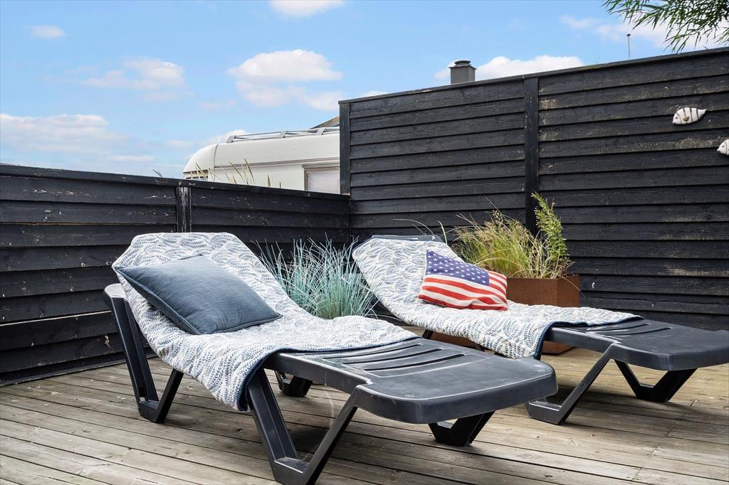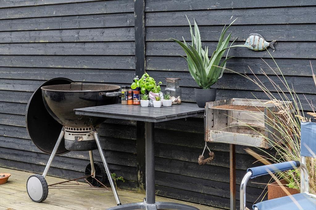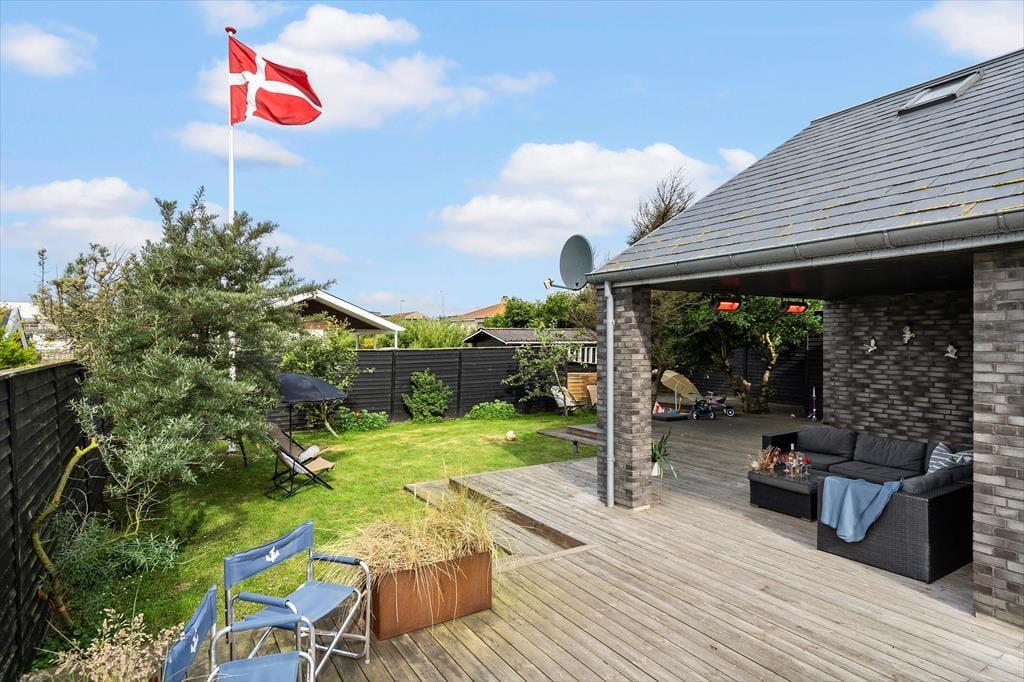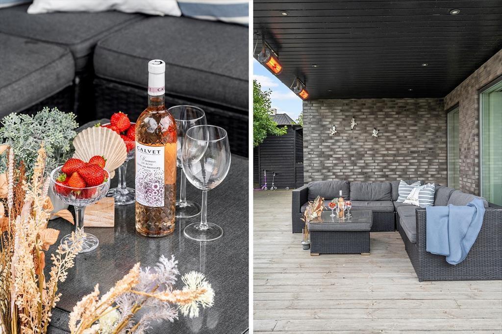 En stor og delvist overdækket terrasse breder sig syd og vest for huset, så det er nemt at finde en solbeskinnet opholdsplads det mest af dagen. Sammen med en lille græsplæne er terrassemiljøet skærmet af et træhegn, og derfor fungerer udearealerne som en dejligt ugeneret oase, der også er en tryg base for både små børn og hunde. På den flisebelagte indkørsel er der god plads til at parkere, og til elbil-ejere er der ladestik ved huset.