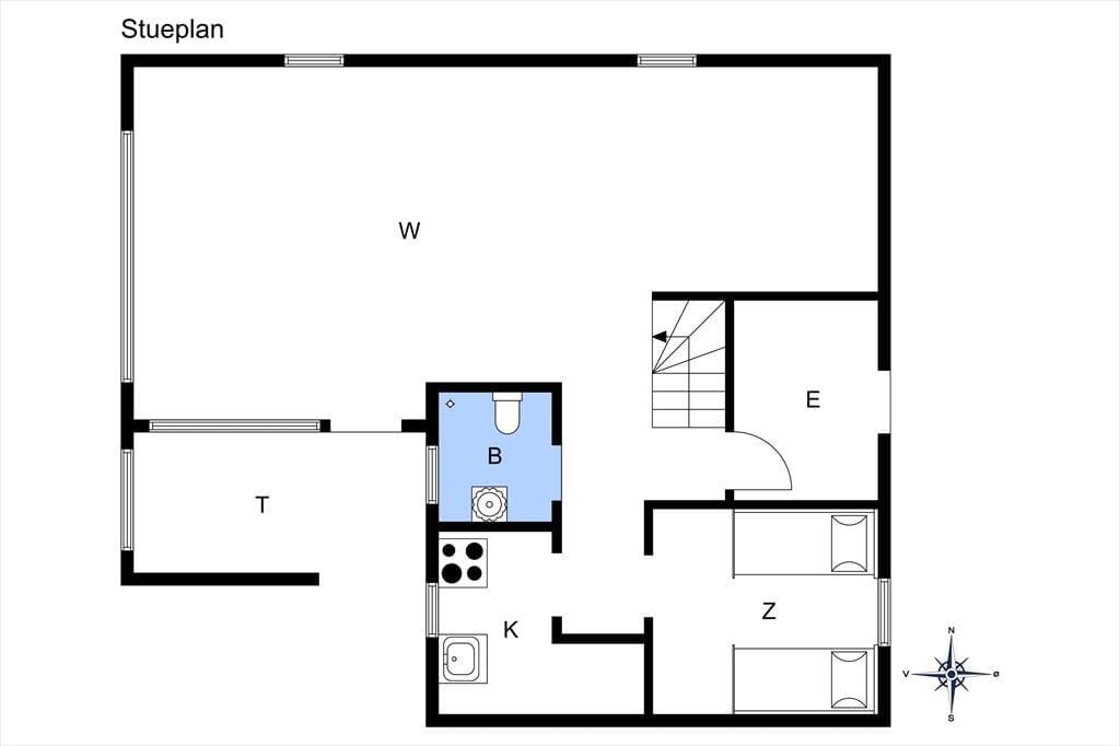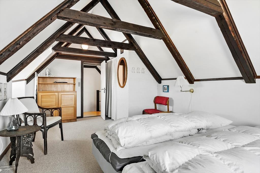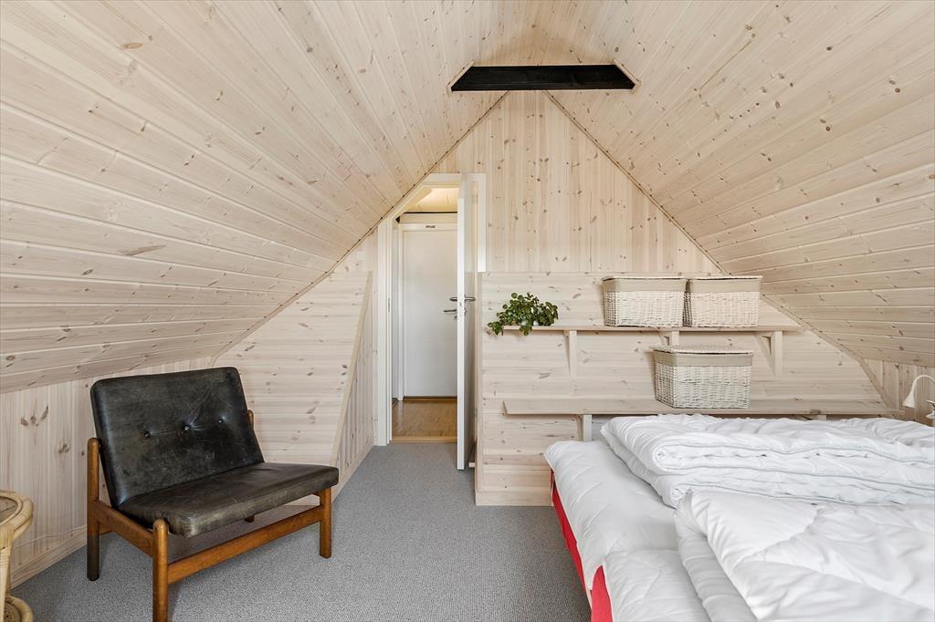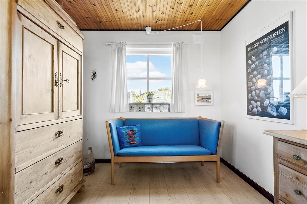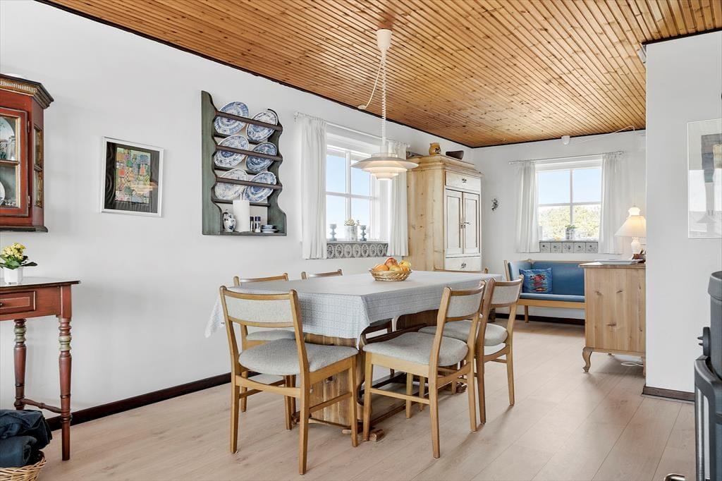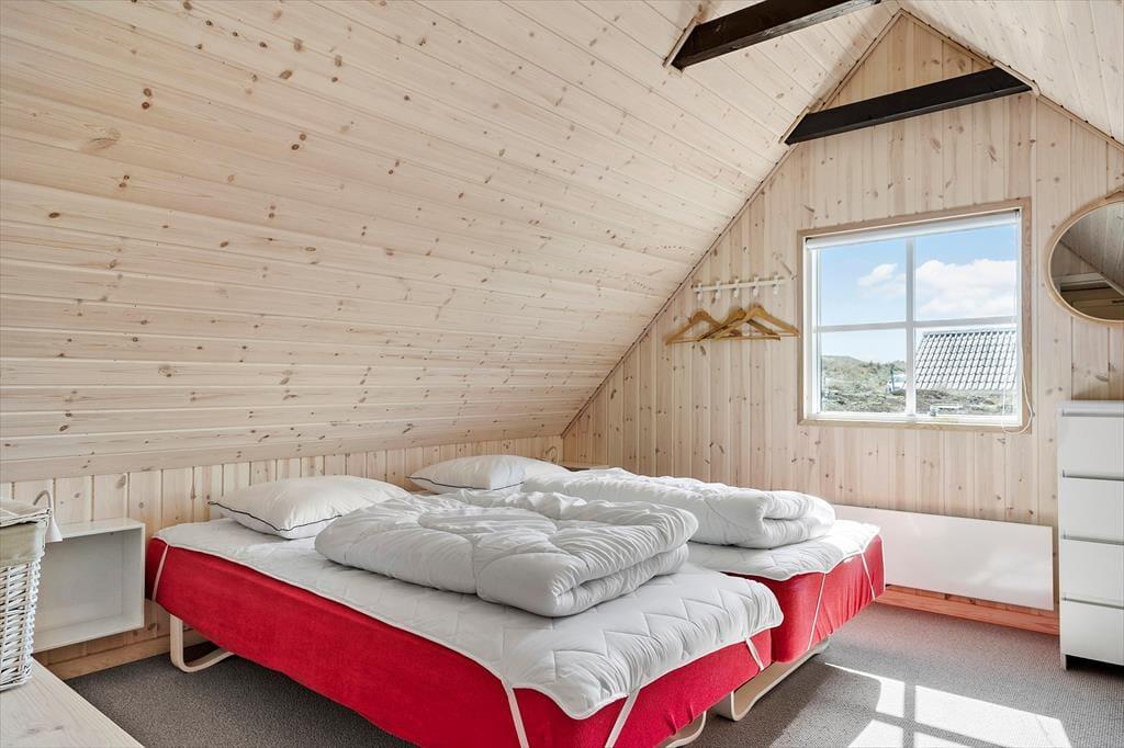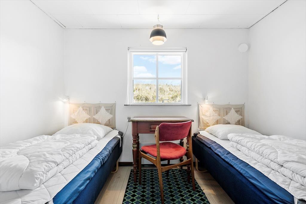 Det 101 m2 store sommerhus er opført i to plan, så to af ferieboligens tre soveværelser er placeret på førstesalen. I alt er der sengepladser til seks personer på værelserne, og i stuen har I god plads til, at alle kan samles, uanset om I vil nyde et godt måltid ved spisebordet eller slappe af i sofaarrangementet. I stuen er der både brændeovn og tv – men for at se på sidstnævnte kræver det godt nok, at I kan løsrive blikket fra de smukke kystomgivelser, som vinduerne åbenbarer. Fra køkkenet kan I også se ud på klitterne, når I skræller kartofler eller rører i gryderne, og det er lige til at komme i feriehumør af. Huset badeværelse er pænt og enkelt indrettet med bruser og gulvvarme.
