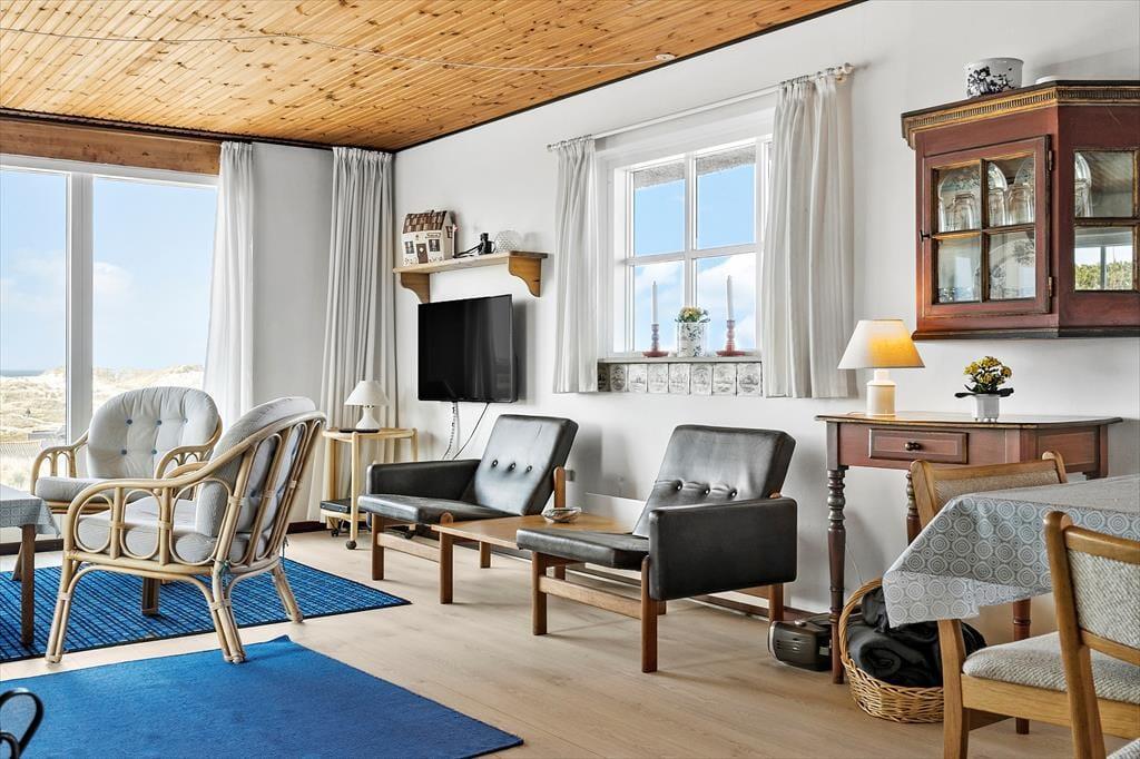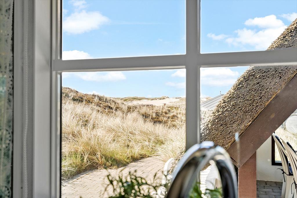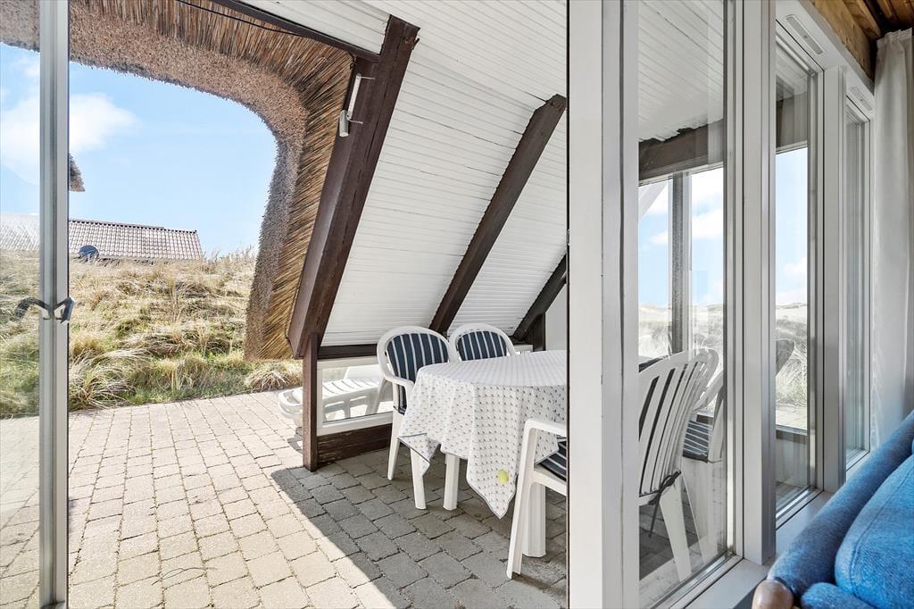 Klitterne og havet danner også et smukt bagtæppe for hyggestunderne på terrassen, der smyger sig vest og syd for sommerhuset. Selv på den overdækkede del af terrassen kan I nyde udsigten, for her er der nemlig panoramavinduer, så I ikke går glip af naturidyllen, selvom der skulle være vestenvind. Der er for øvrigt terrasseområder på husets østside, så dagens første solstråler kan I også suge til jer. Bemærk i øvrigt, at der ingen grill er i huset af hensyn til stråtaget.