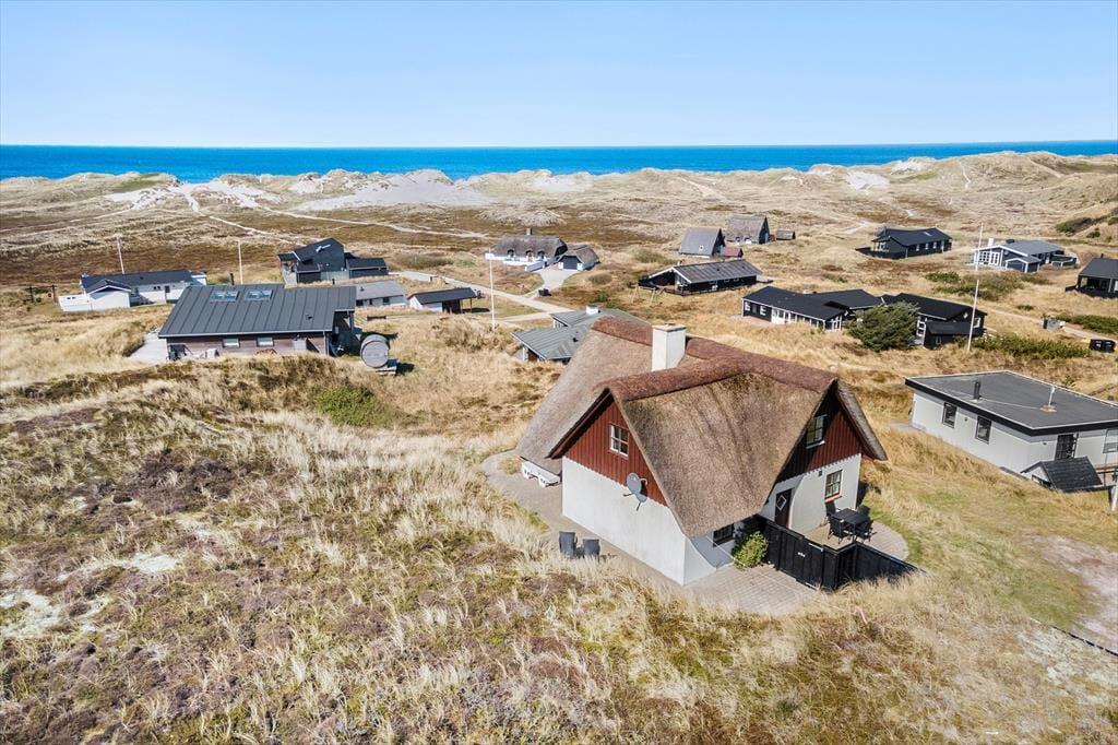 Velkommen til Kridthuset – et charmerende, stråtækt sommerhus, der ligger lige syd for Søndervig på en høj klit med fantastisk udsigt over området. Fra stuen og terrassen kan I sågar se til Vesterhavet bag klitterne, og hvis det flotte syn giver jer lyst til at komme tættere på, skal I kun gå 400 meter, før I står på stranden.