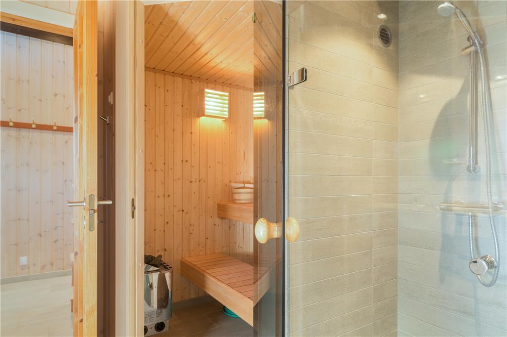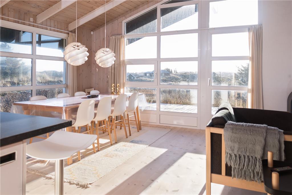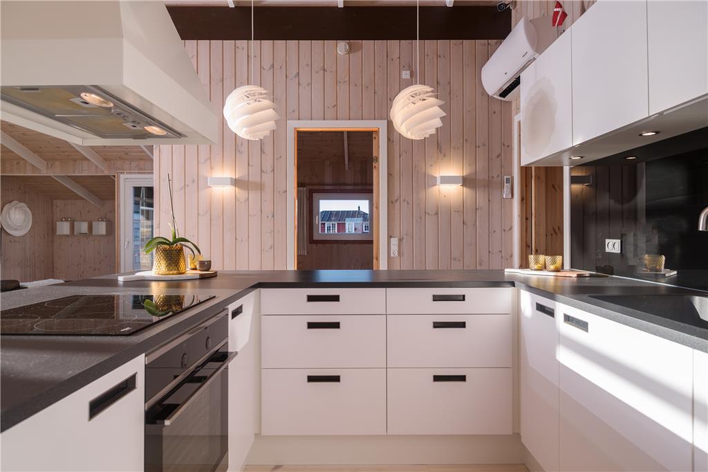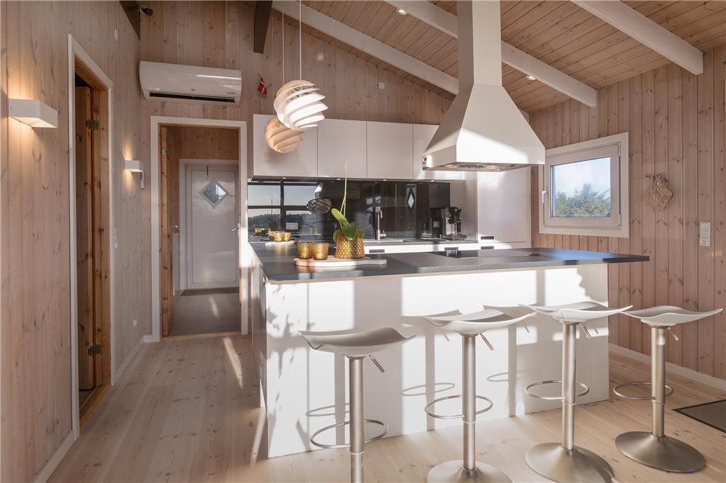 Det skønne lyse køkken er praktisk og velindrettet. Kokken kan være sammen med familien, mens måltiderne tilberedes, for her kan I sidde og tale over et glas vin og hygge jer, mens maden simrer på komfuret. Køkkenet har åben forbindelse til alrum og stuen. Det hele virker lyst og luftigt med loft til kip og I mærker en dejlig rumfornemmelse. Der er rigtig god plads rundt om spisebordet eller i sofagruppen. Her er desuden brændeovn og fladskærms-tv med både danske og tyske TV-kanaler. Den store lysestue har et skønt lysindfald fra de store vinduer mod syd, hvor I også har en god udsigt ud over den fantastiske natur og den skønne kuperede grund som omgiver sommerhuset. Der er også et hyggehjørne i stuen hvor det er ideelt for børnene at lege. Der er store 3 soveværelser i sommerhuset, 2 med dobbeltsenge og 1 med køjeseng. Det store lyse og velindrettede badeværelse er helt nyt fra 2017. Her er gulvvarme, dobbelt håndvask, bruseniche og sauna. Derudover er endnu et badeværelse tilbygget i 2024.