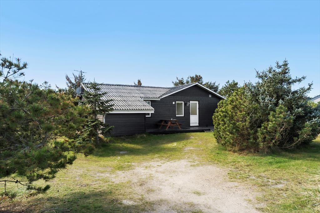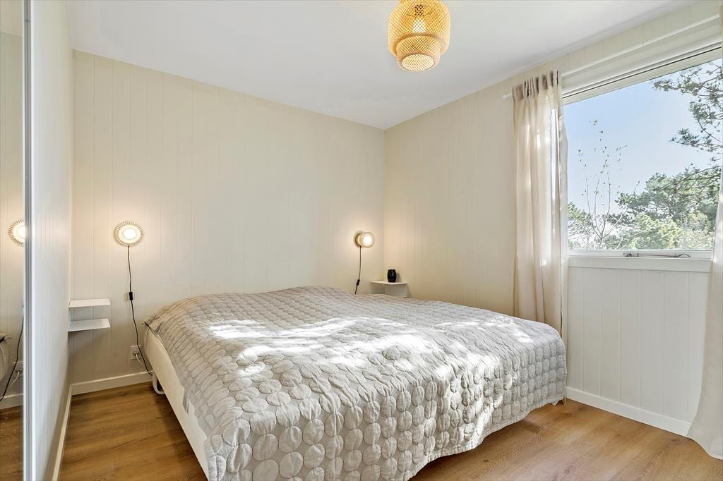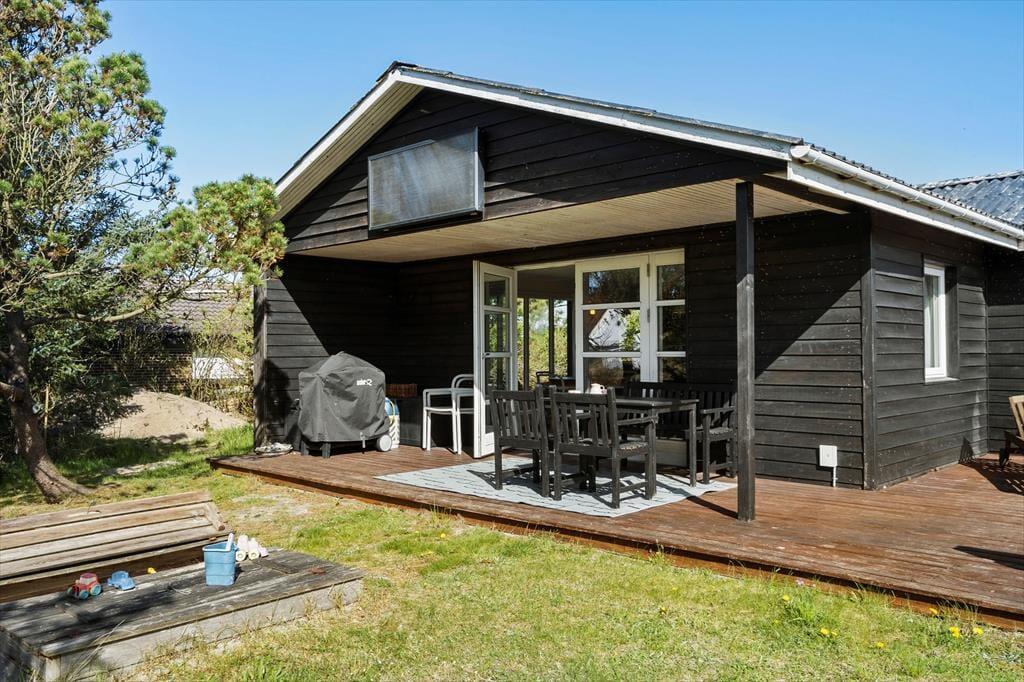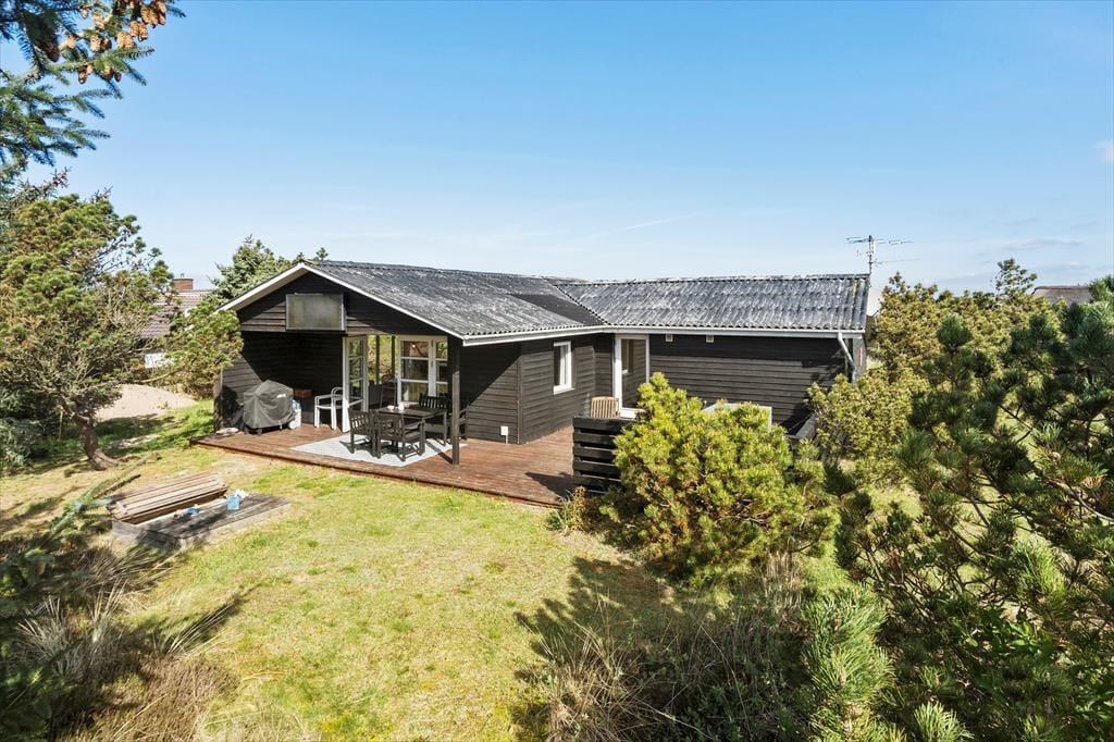 Dette indbydende sommerhus i det sydlige Søndervig ligger på en hyggelig grund omkranset af frodige træer og beplantning, og derfor kan I nyde feriedagene komplet ugeneret på den sydvendte terrasse og i haven, hvor der også er sandkasse og fodboldmål. Med sengepladser til fem personer fungerer sommerhuset ideelt til børnefamilien, og I har nem adgang til smuk natur samt blot 750 meter til stranden og Vesterhavet.