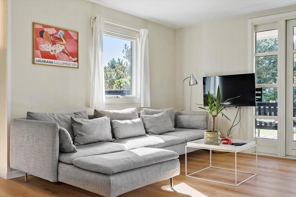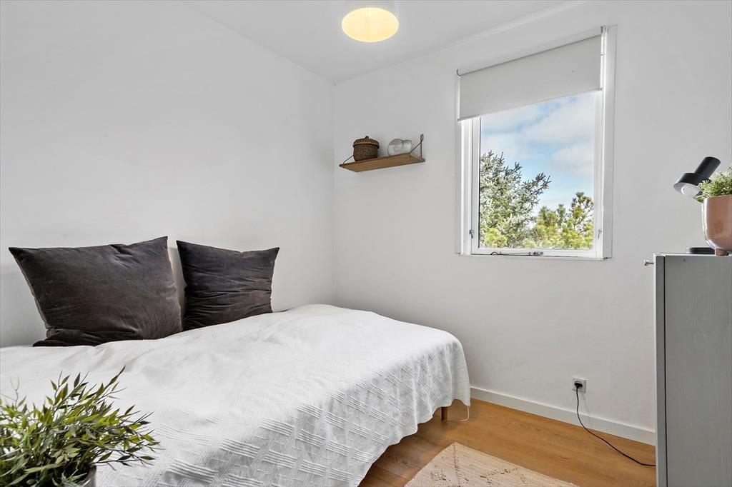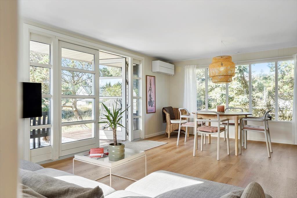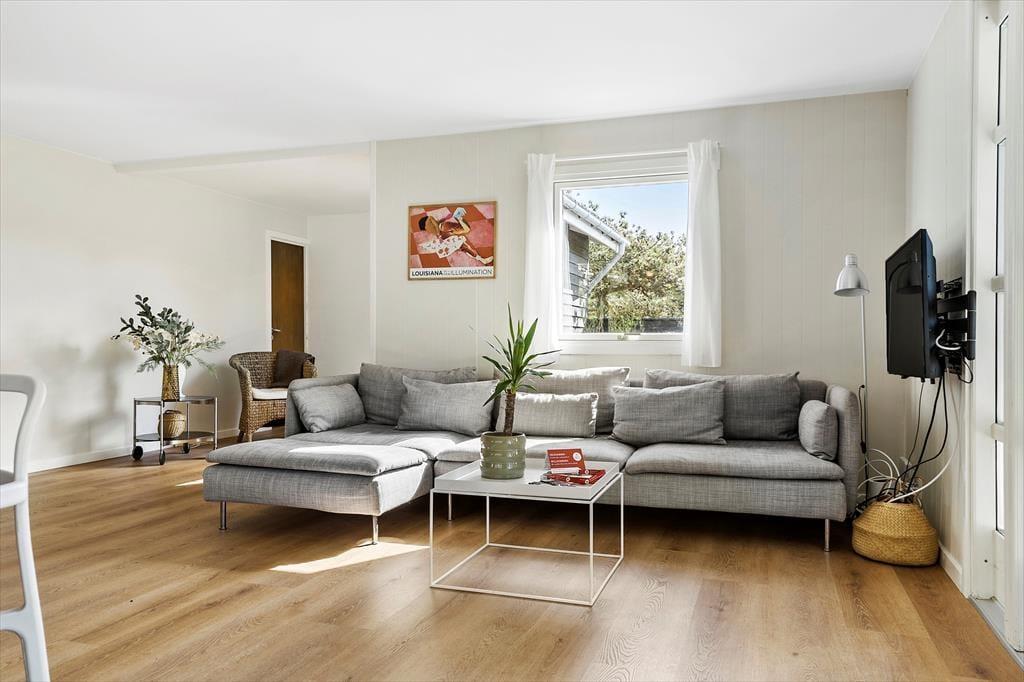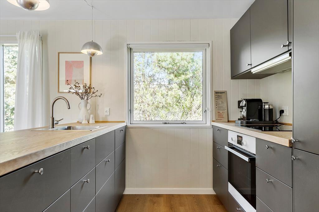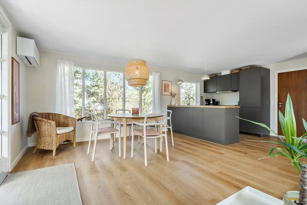 I kan glæde jer til at indtage en skøn feriebolig, hvor det ydre emmer af klassisk sommerhuscharme, mens det indre er lyst og indbydende. Ferieboligens tre hyggelige soveværelser giver sengepladser til fem personer, og badeværelset er lækkert og moderne indrettet med bruseniche og væghængt toilet. Foruden en entré med god plads til vandrestøvler, vinterjakker og sommersandaler består resten af huset af et åbent opholdsrum, hvor køkken og stue glider i ét. Køkkenet er ligesom resten af rummet holdt i lyse nuancer, og store vinduespartier giver et skønt lysindfald og trækker naturens farver ind. Madlavningen går som en leg i det velindrettede køkken, og retterne serveres let ved spisebordet. Tv og wi-fi sikrer underholdningen, og mens I slapper af i sofaerne, sørger varmepumpen for en behagelig temperatur.