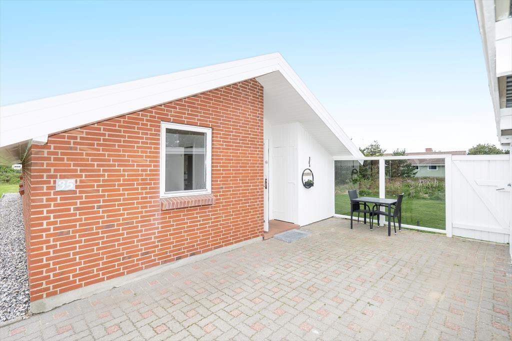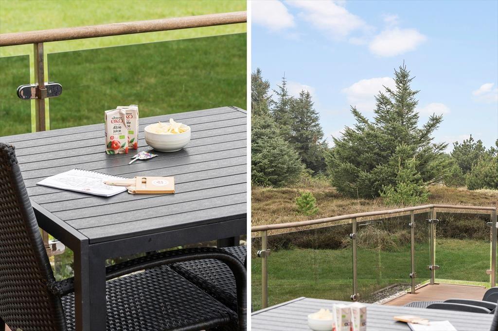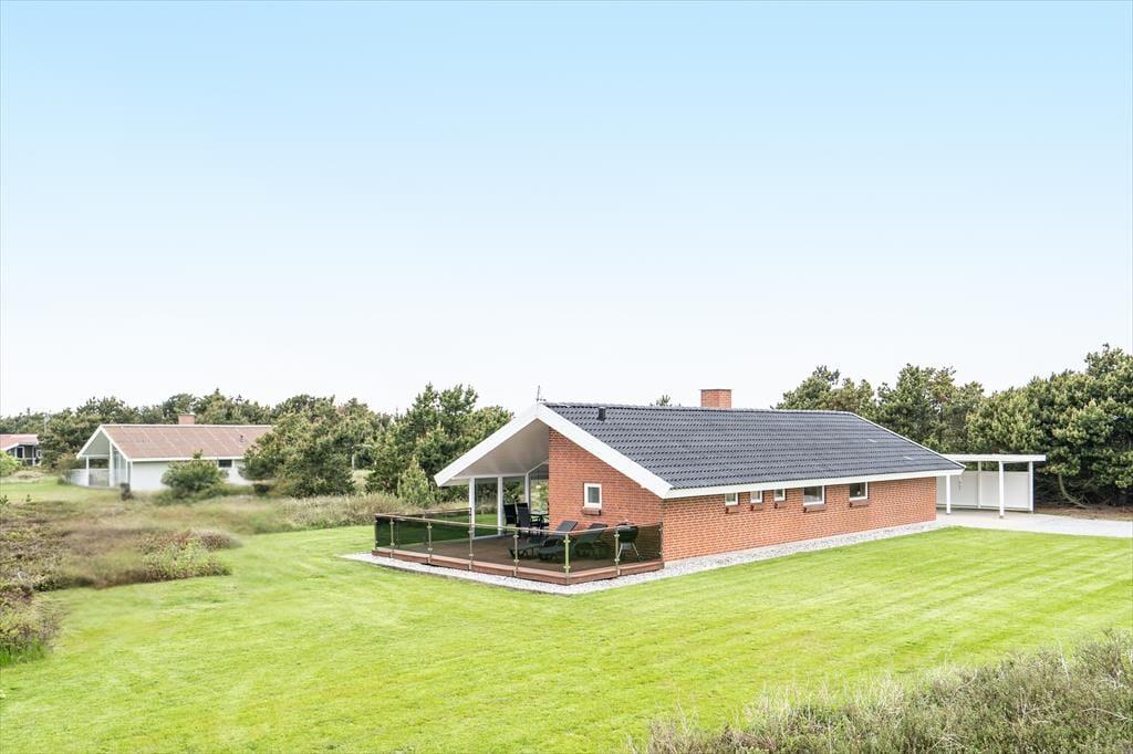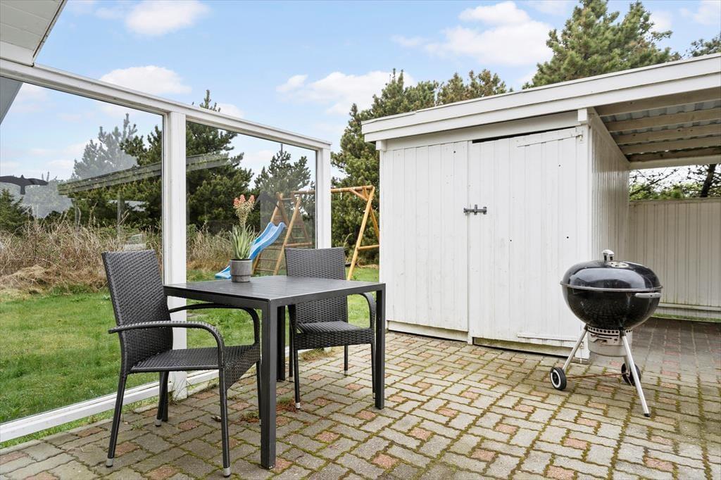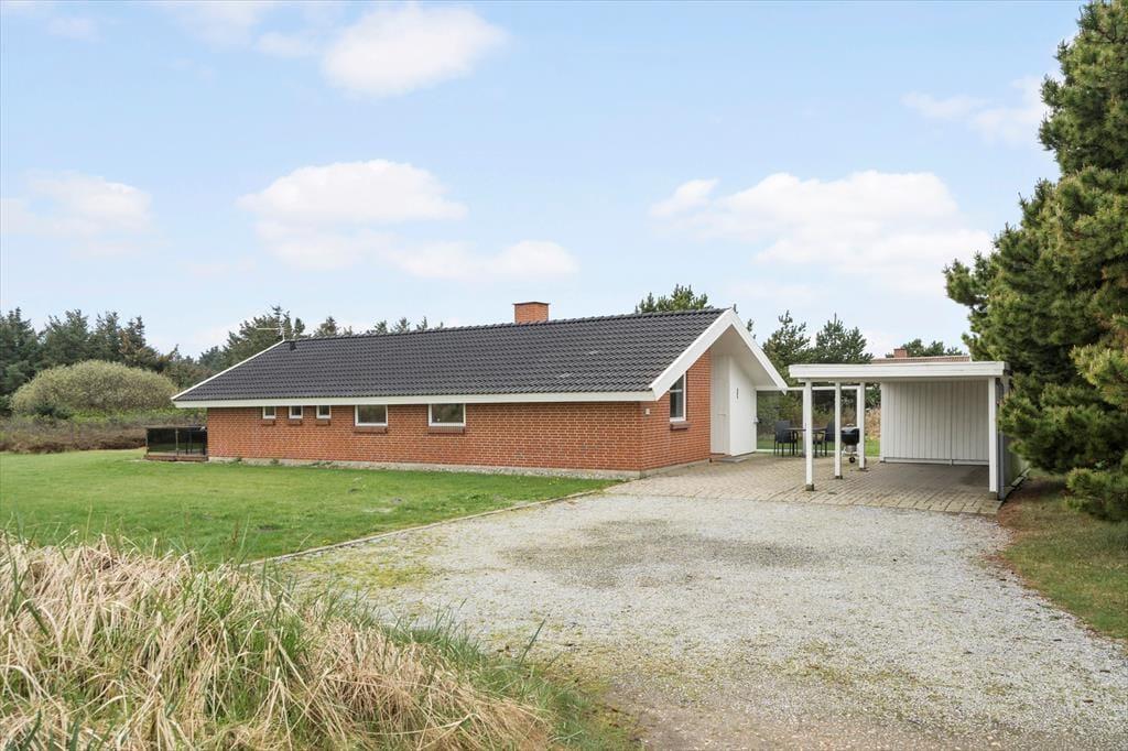 Grunden er omkranset af varieret beplantning, der giver jer noget kønt at kigge på og samtidig også følelsen af privatliv. I kan se frem til at nyde sommerdagene i solen på den sydvendte terrasse, der har et overdækket opholdsområde med glasafskærmning, hvis I får brug for at søge ly mod vinden eller aftenduggen. Familiens yngste har et gyngestativ og god plads til at lege og spille bold, og her er carport til bilen samt et skur til feriehusets grill og jeres medbragte cykler. Mellem huset og carporten findes også en dejlig gårdhave - terrasseområde hvor der er isat glasværn mod vest, så I kan sidde i læ for vinden og samtidig nyde udsigten.