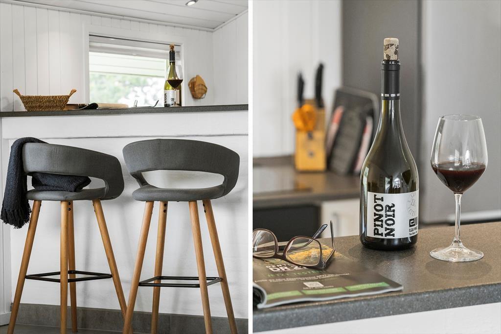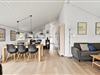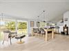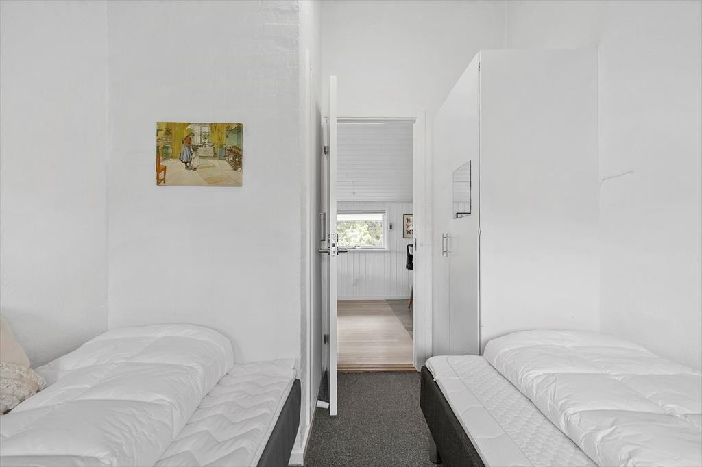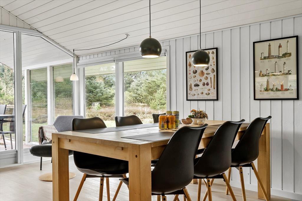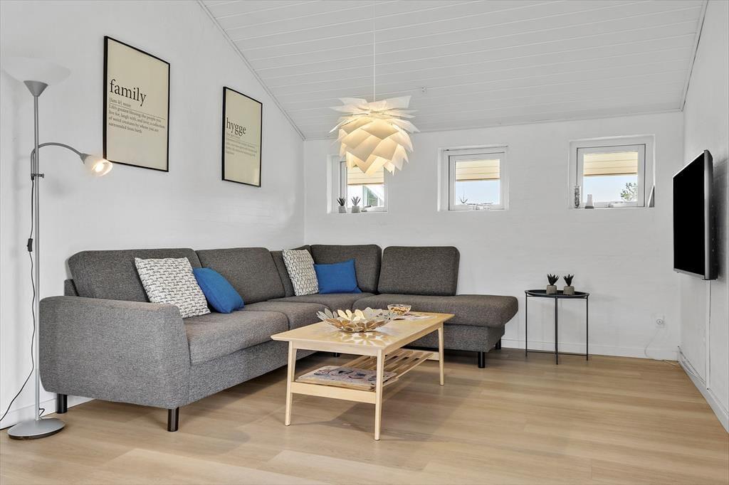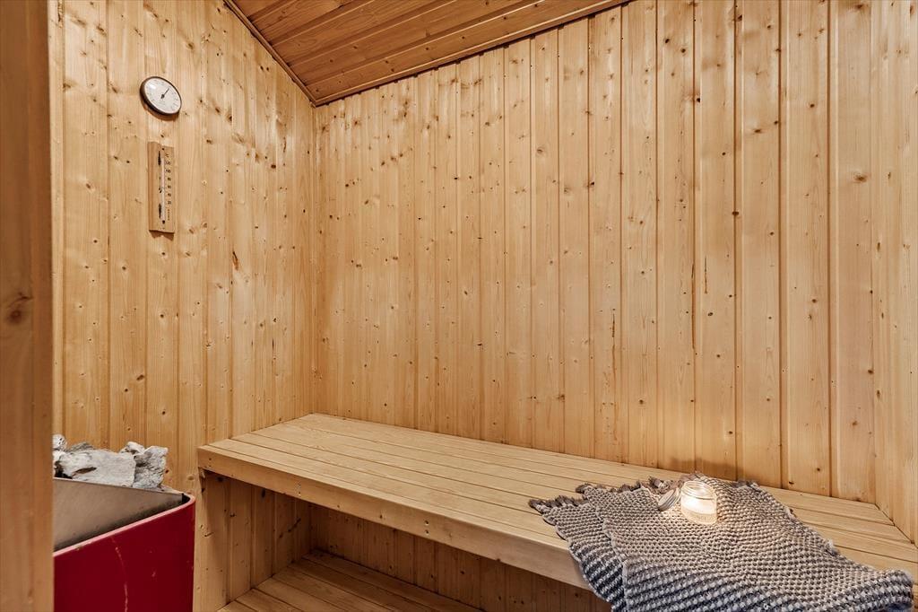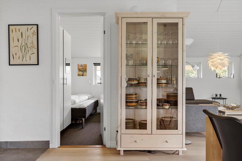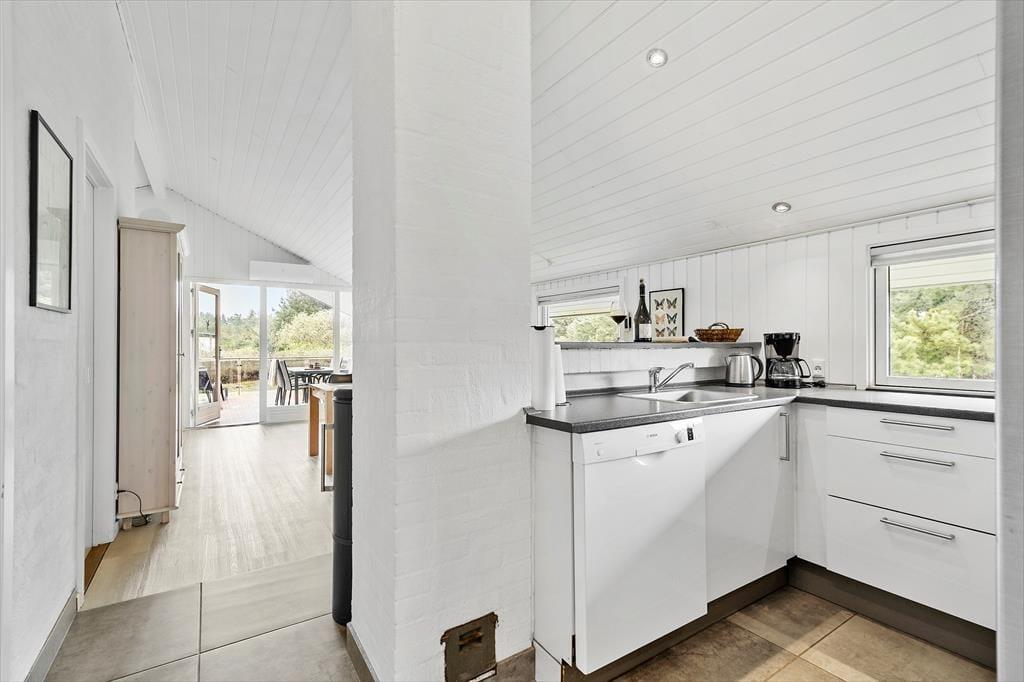 Det 90 m2 store sommerhus er indrettet med tre gode værelser, der alle har en fornuftig størrelse. Flisebadeværelset byder på bruseniche og gulvvarme, og I kan desuden glæde jer over et skønt wellnessrum med brus sauna. Resten af huset består af et åbent opholdsområde, hvor køkkenet og vinkelstuen glider i ét. Huset er flot renoveret, og det lækre køkken fra 2019 er lyst og moderne indrettet med alt, hvad I skal bruge til madlavningen, inklusive opvaskemaskine. En disk med siddepladser bygger bro til stuen, hvor spisebordet og sofaarrangementet ved tv’et giver god plads til at være sammen om lækre måltider, hyggelige filmaftener eller afslapning med iPad’en via feriehusets Wi-Fi. Brændeovnen og varmepumpen sørger for en behagelig temperatur, og store vinduespartier lukker masser af lys ind og giver en smuk udsigt til de frodige omgivelser.