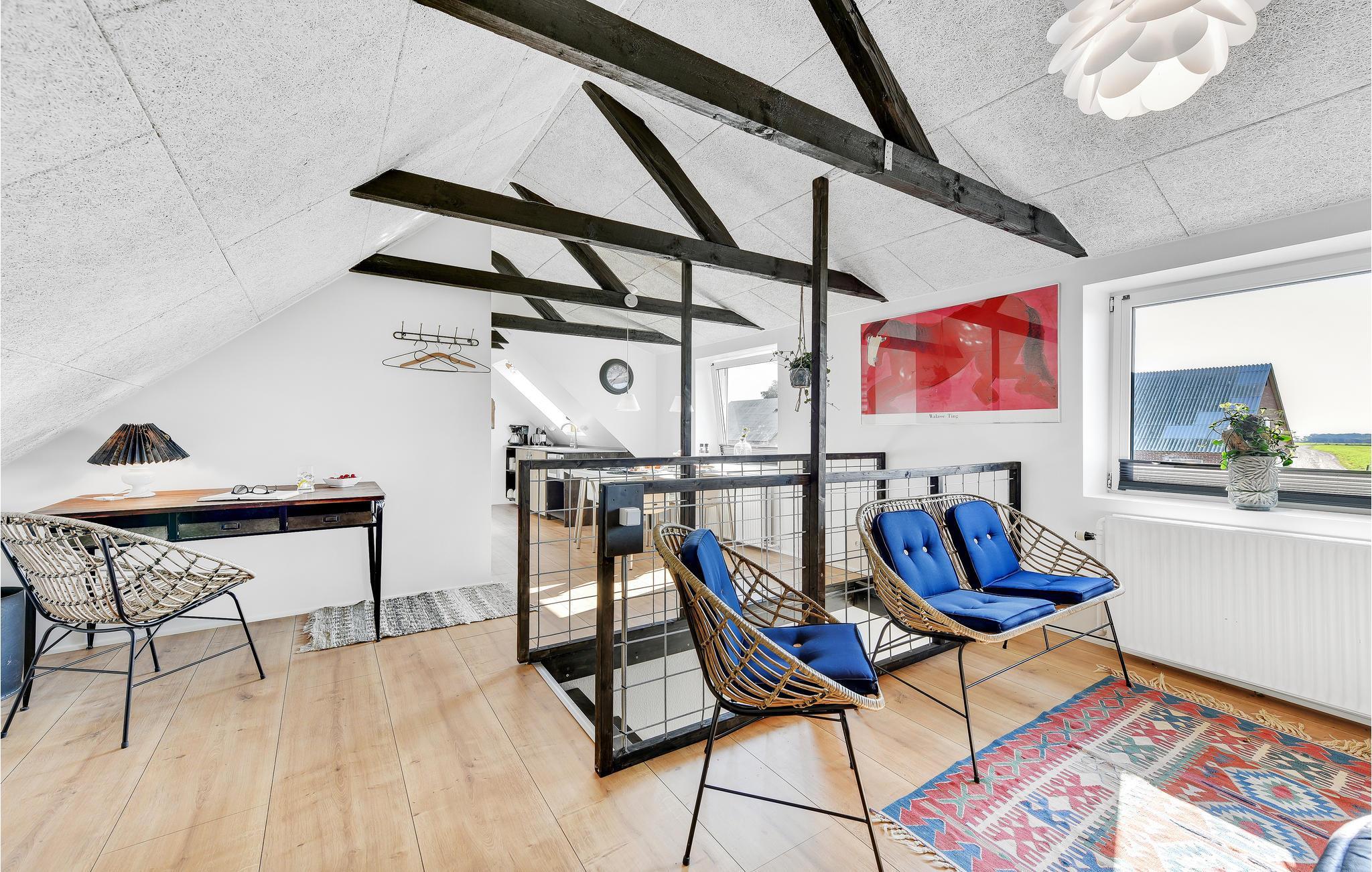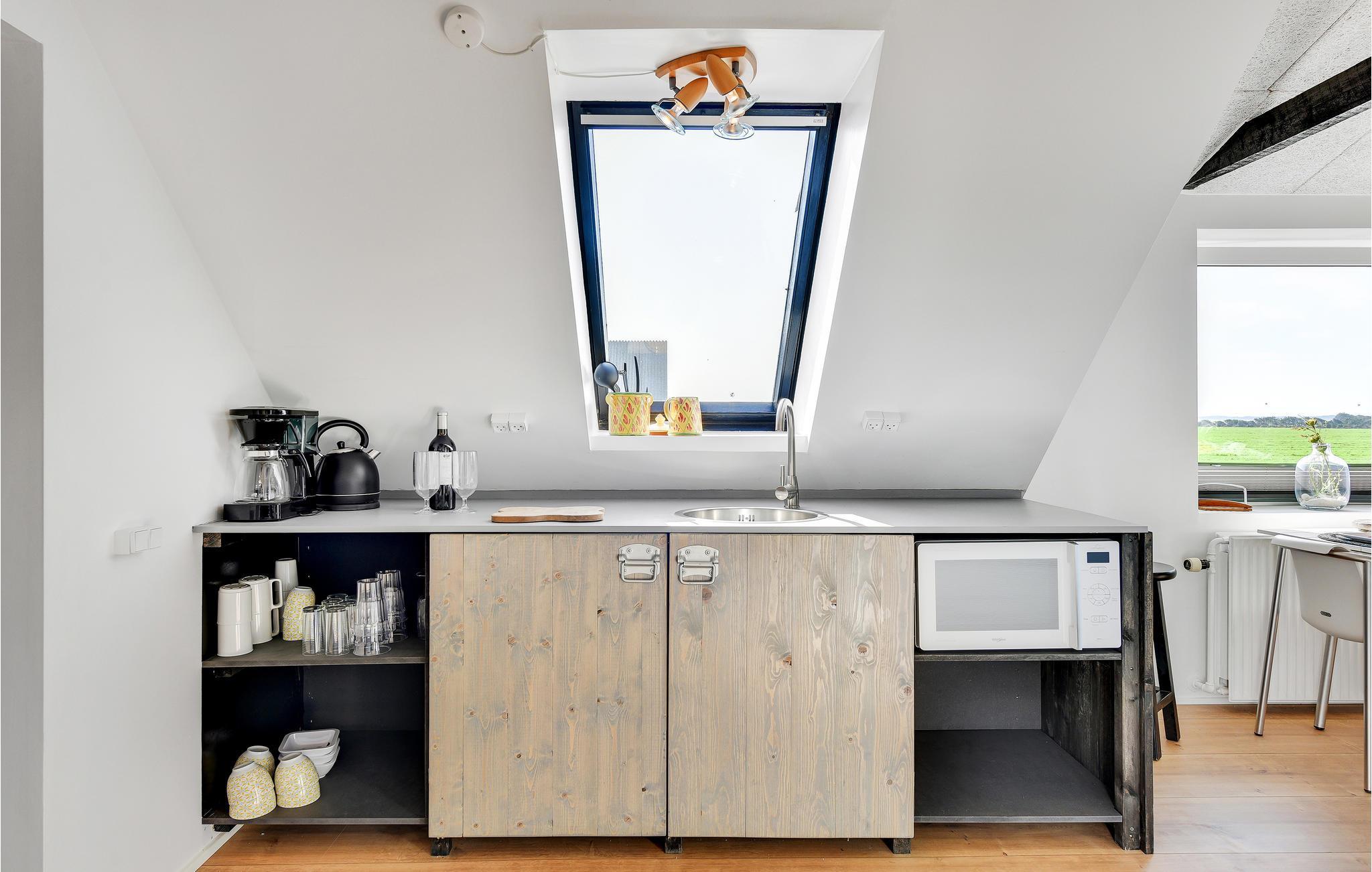 Lejligheden er indrettet med 2 soveværelser, stue i åben forbindelse med tekøkken, som har miniovn, håndvask og 1 kogeplade. Derudover er der et badeværelse med bruser. Fra stuen og køkkenet er der en fantastisk udsigt over markerne til Ringkøbing fjord og surferparadiset ved Baggers dæmning. Lejligheden ligger på 1. sal, så den er ikke egnet til gangbesværede.