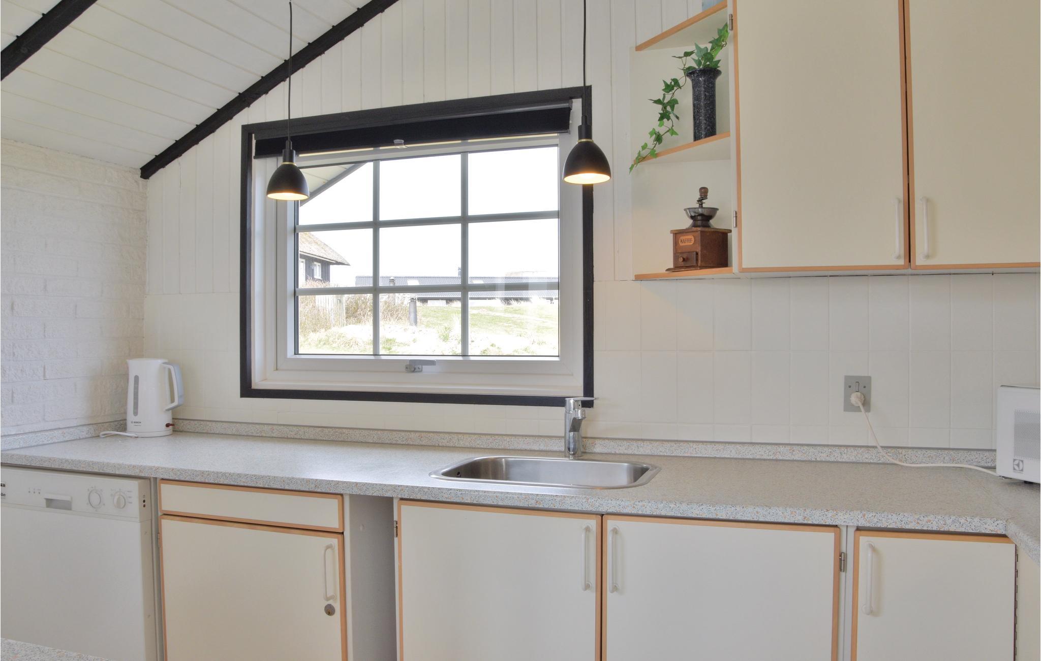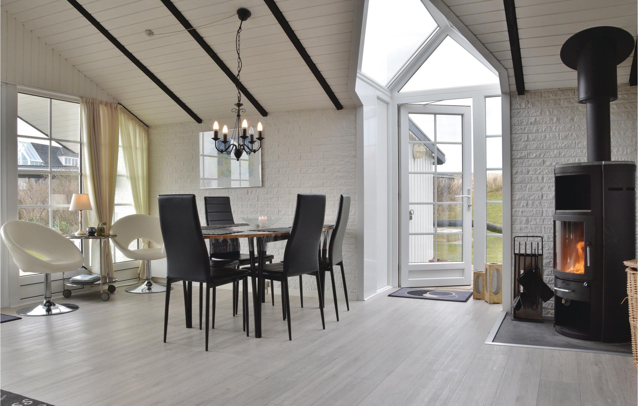 Hold en dejlig ferie i et skønt feriehus bygget i træ, med mange lysindfald fra loftsvinduer, karnapper og mere. I stuen er der et stort vinduesfag ud mod terrassen og haven, ligesom her er en hyggelig overdækket terrasse hvor I kan nyde de lange sommeraftener uden at blive generet af vind og vejr. Husets køkken er i åben forbindelse med stuen, hvor den hyggelige brændeovn står, tænd op i den og hyg jer selvom det bliver køligt. Huset er meget centralt beliggende, og ligger i gåafstand til alle Søndervigs specialbutikker, caféer, restauranter, cykeludlejning, dagligvarebutik mm. Ved Vesterhavet er der ikke blot gode bademuligheder, men også fine chancer for at afprøve sine talenter som lystfisker fra stranden, og uanset vejret bør Vesterhavet opleves. Her er der højt til himlen, frisk luft og en enestående natur, som blot ligger ganske få minutters gang fra huset. Til Ringkøbing er der ca. 10 km, en hyggelig by med mange brostensbelagte gader, gågade med butikker, en hyggelig havn hvor I bl.a. kan bestille de mest fantastiske fiskeretter og nyde maden i det autentiske fiskermiljø. Indenfor ca. en times kørsel ligger Legoland, og I kan også tage en tur i Givskud Zoo og opleve de store, omponerende dyr på nærmeste hold.