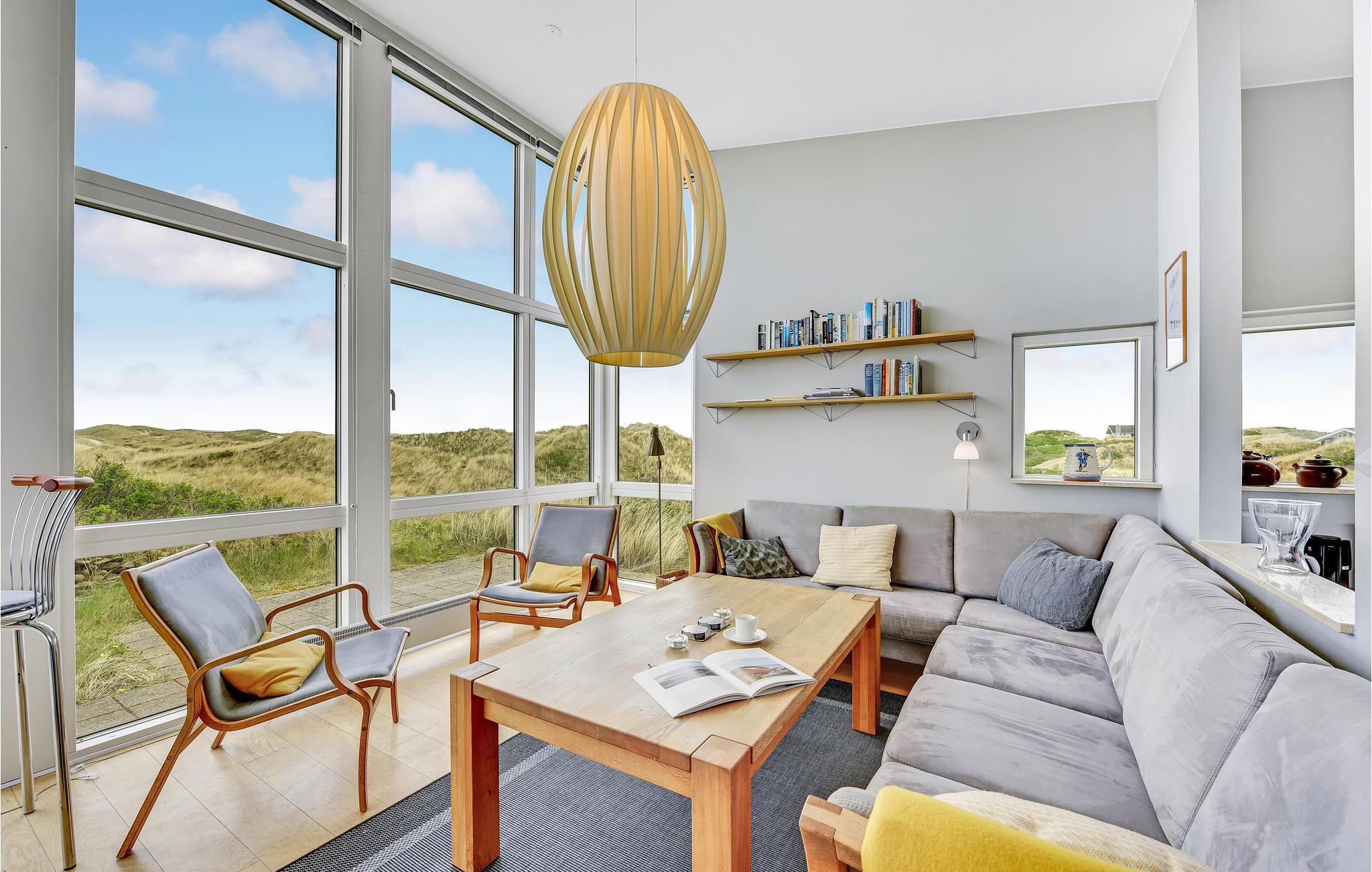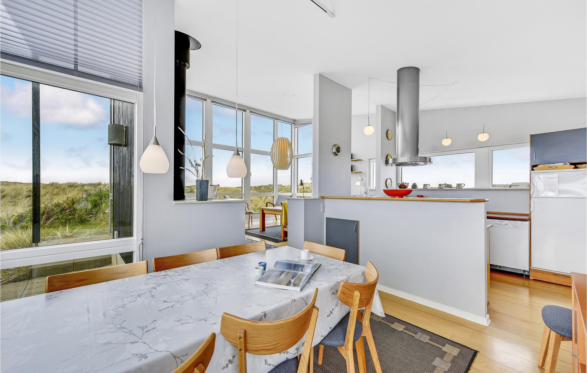 Der er en pragtfuld panoramaudsigt over Vesterhavet og klitterne fra dette skønne, velbeliggende feriehus, der har en enestående beliggenhed på toppen af en klit. Det store panoramavindue fremhæver den lyse atmosfære og giver en fornemmelse af, at naturen kommer ind i huset. Det er udstyret med alle moderne faciliteter. Terrasserne indbyder til afslappende timer med solbadning om dagen og flotte solnedgange på de smukke sommeraftener. Omgivelserne er ideelle til traveture i den smukke, barske natur, ligesom Søndervig med butikker, bowlingcenter, badeland m.m. ligger i gåafstand fra huset. Har I lyst til en ferie, hvor nøgleordene er natur, strand, hav, klitter og masser af frisk luft, er dette hus perfekt.