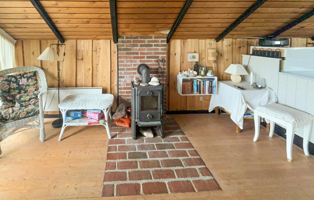 Hyggeligt træhus nær Ringkøbing Fjord med terrasse, brændeovn og gode fiskemuligheder.