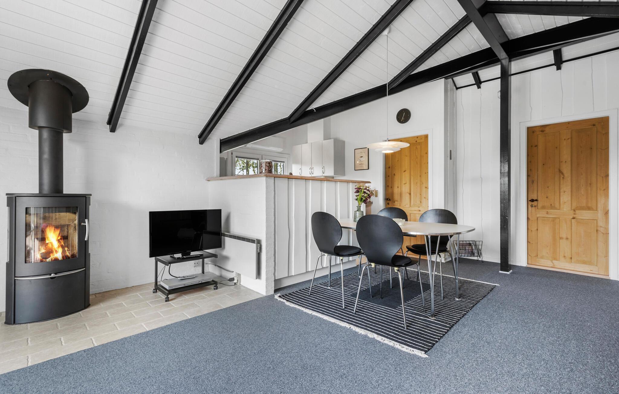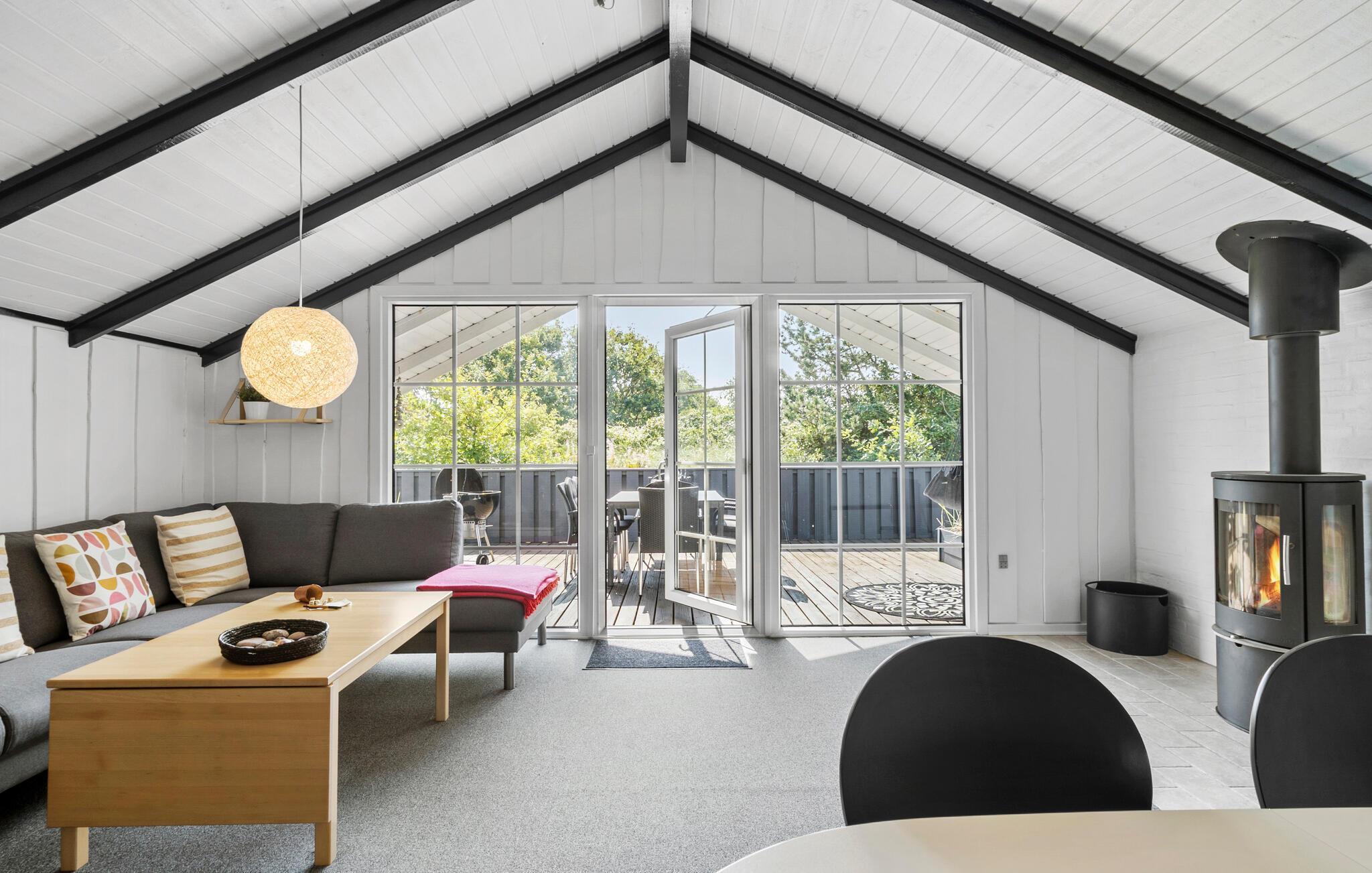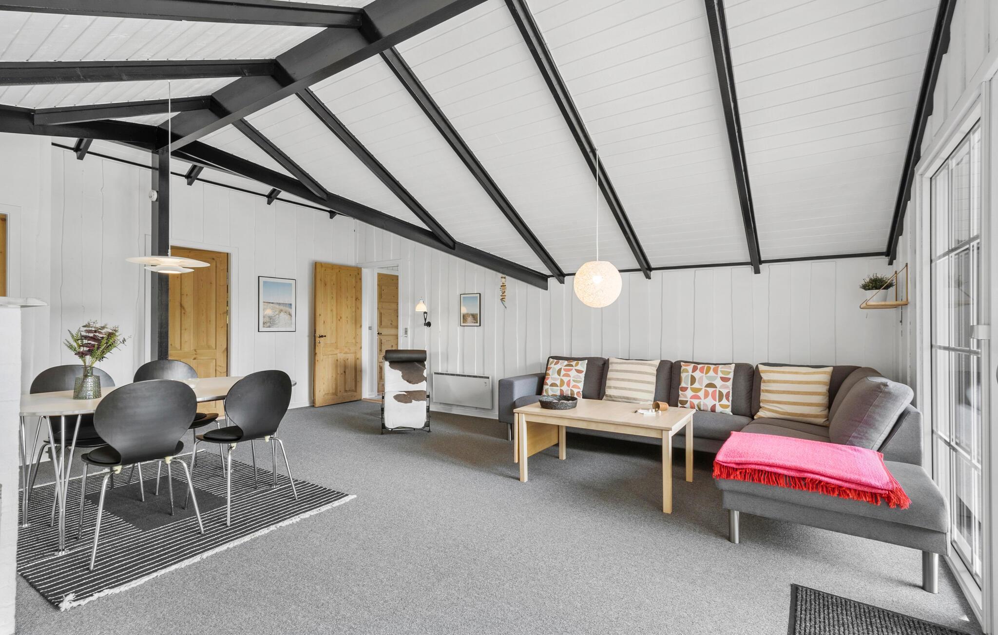 Velkommen til et herligt udgangspunkt for jeres feriedage i det vestjyske. Her får I en god ramme om de rolige stunder mellem jeres spændende udflugter i det naturskønne område. Boligen er meget familievenlig og har gode fællearealer, så både børn og voksne kan se frem til en masse hyggestunder. Begynd dagene med morgenmad i stuen og nyd udsigten til de flotte sorte bjælker under loftet, mens I lægger jer fast på dagens program. Efter en frisk gåtur ved vandet kan I tænde op i brændeovnen og mærke varmen brede sig.