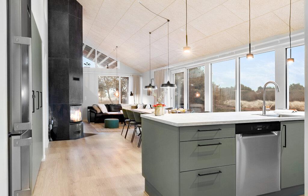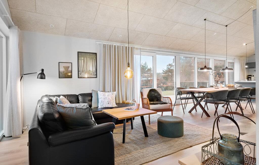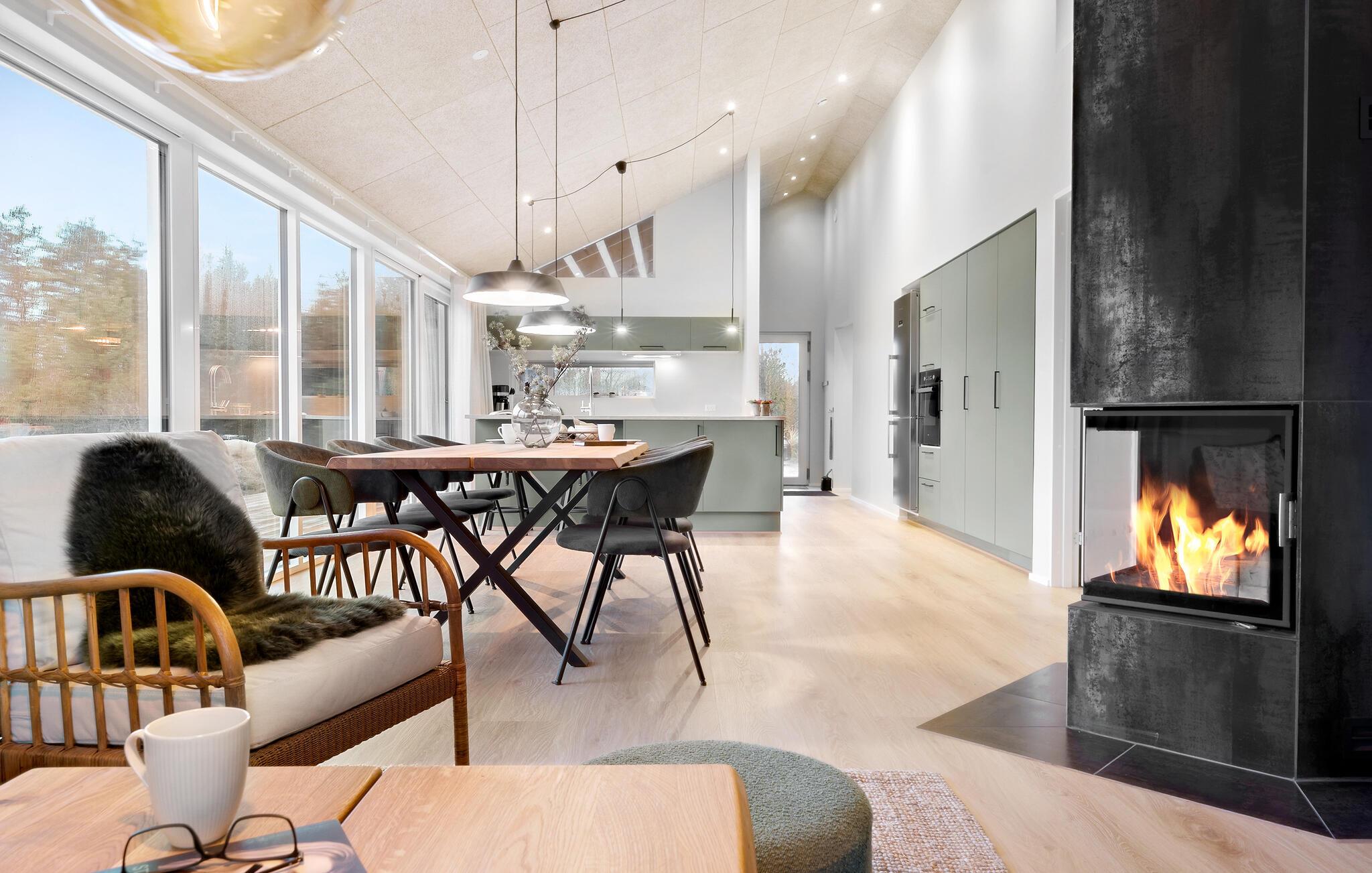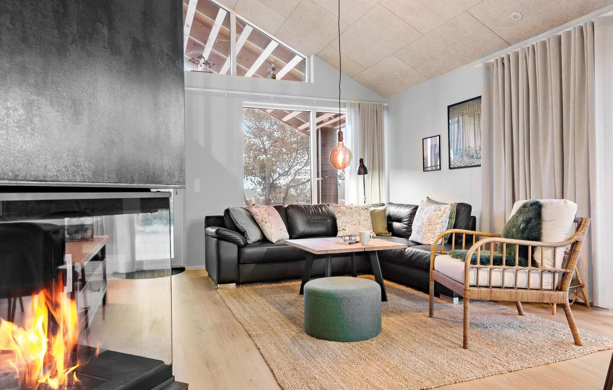 Velkommen til dette sommerhus, som byder på både komfort, stilfuld indretning og skønne omgivelser - helt oplagt til den næste familieferie. Den lyse opholdsstue med store vinduespartier og højt til loftet giver rammerne til hyggelige aftener i sofaen mens brændeovnen knitre. Lav mad sammen i fællesskab i køkkenet, som er stort og åbent, og med to højstole hvorfra man kan hjælpe med at snitte grønt til salaten eller smage sovsen. Efter en lang dag, kan I tage en tur i saunaen og nyde roen og varmen.