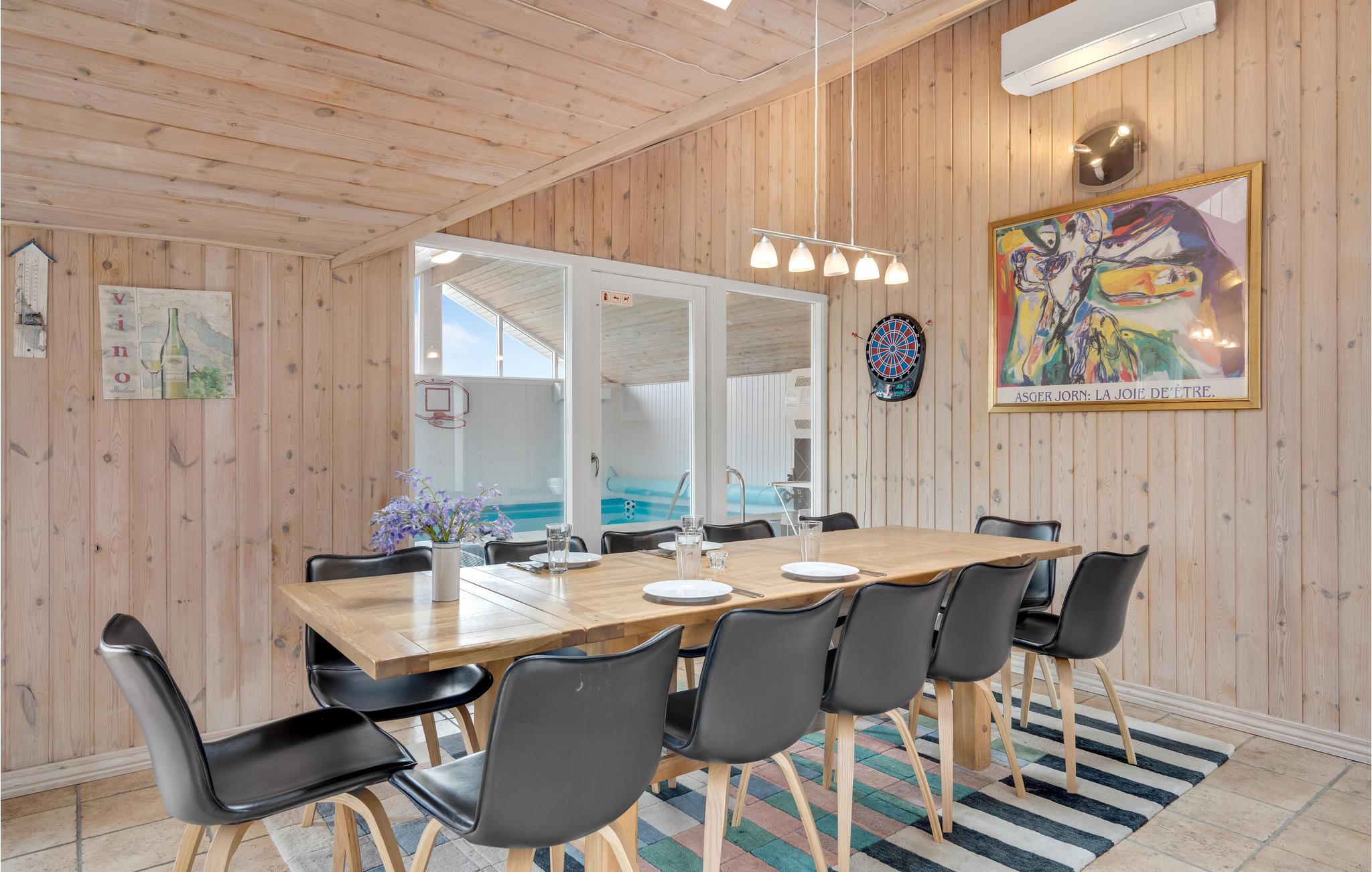Bo mellem Klegods klitter i dette store sommerhus med pool, der ligger på en dejlig naturgrund. Huset er udstyret med to gode terrasser, den ene er indhegnet, så I kan lade små børn og hunde frit rende ud og ind, uden at være nervøse for at de skal "stikke af". Huset er velindrettet med god plads til op til 12 gæster. Der er en stor pool, et fire personers spabad og en sauna, så I hele familien kan nyde ferien i fulde drag. I den åbne stue i forbindelse med køkkenet, står en brændeovn, som ikke kun spreder hurtig varme, men også er hyggelig. Uanset vejret er det altid en oplevelse at gå en lang tur langs Vesterhavet, og bagefter hoppe en tur i husets wellness-afdeling og få varmen igen. Så kan I hygge jer i stuen med et brætspil, en god film eller bare snakke sammen. Huset ligger mellem feriebyen Søndervig og den hyggelige fiskerby Hvide Sande, hvor I kan købe pivfrisk fisk. I kan også tage fiskestangen med og prøve om I selv har held med at skaffe aftensmaden.