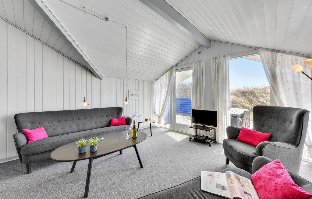 Charmerende fritidshus nær Søndervig Strand med udsigt til klitter og stor terrasse.