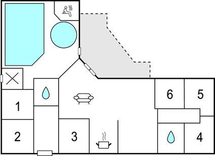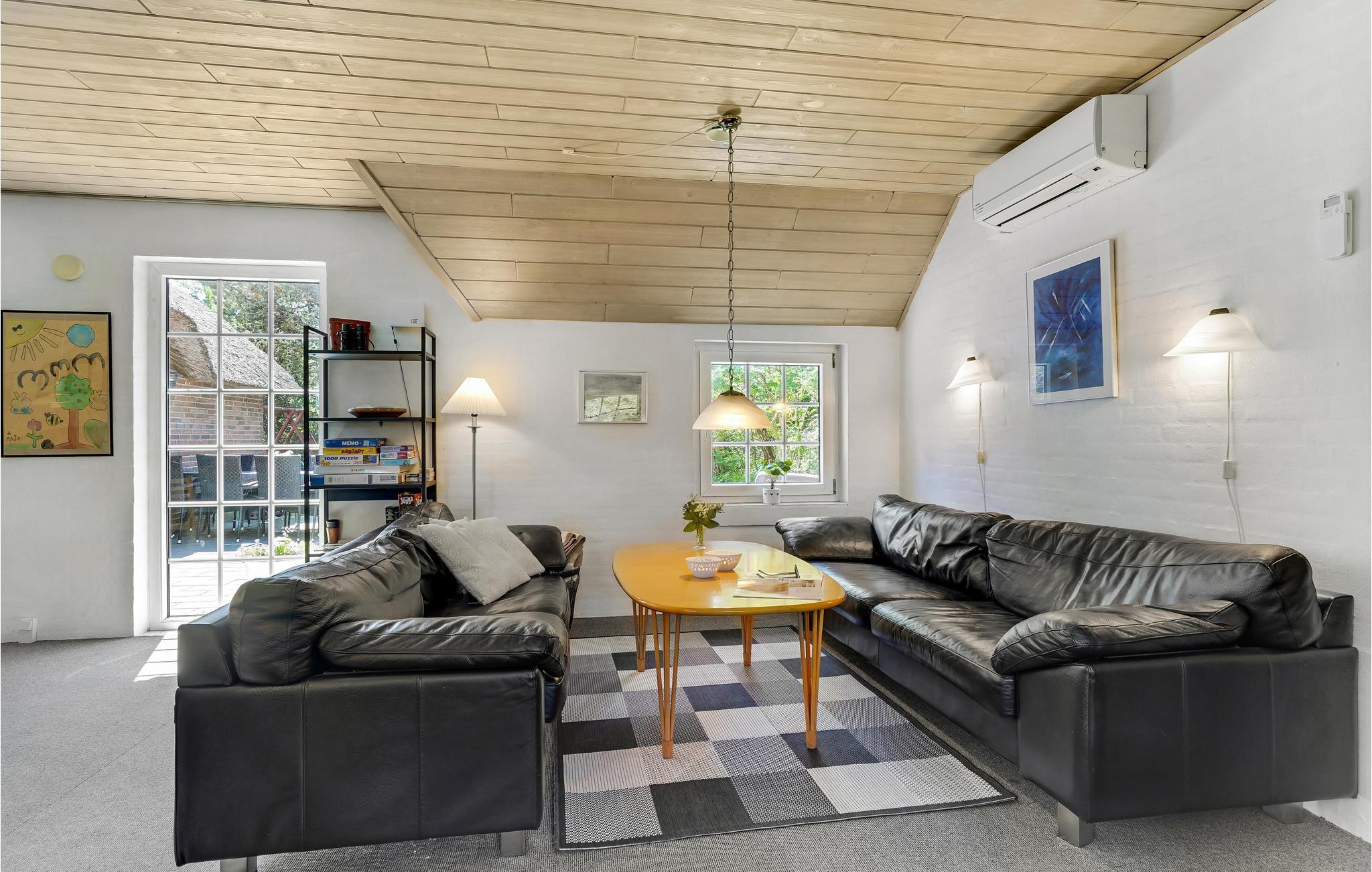 I husets midte ligger køkkenet i åben forbindelse til stuen og spiseområdet, i hver ende af huset er der en soveafdeling med hver tre soveværelser samt et badeværelse med bruser. I poolafdelingen er der, ud over den 17 m2 store swimmingpool, en sauna og et spabad. Så her kan der bruges mange timer på afslappende wellness-stunder efter en aktiv dag på stranden. I stuen er der både brændeovnen, som sørger for en rar atmosfærre og hurtig opvarmning, samt en varmepumpe som supplerende varmekilde. Huset har både vaskemaskine og tørretumbler, så I behøver ikke at have en hel kuffert fyldt med vasketøj med hjem.