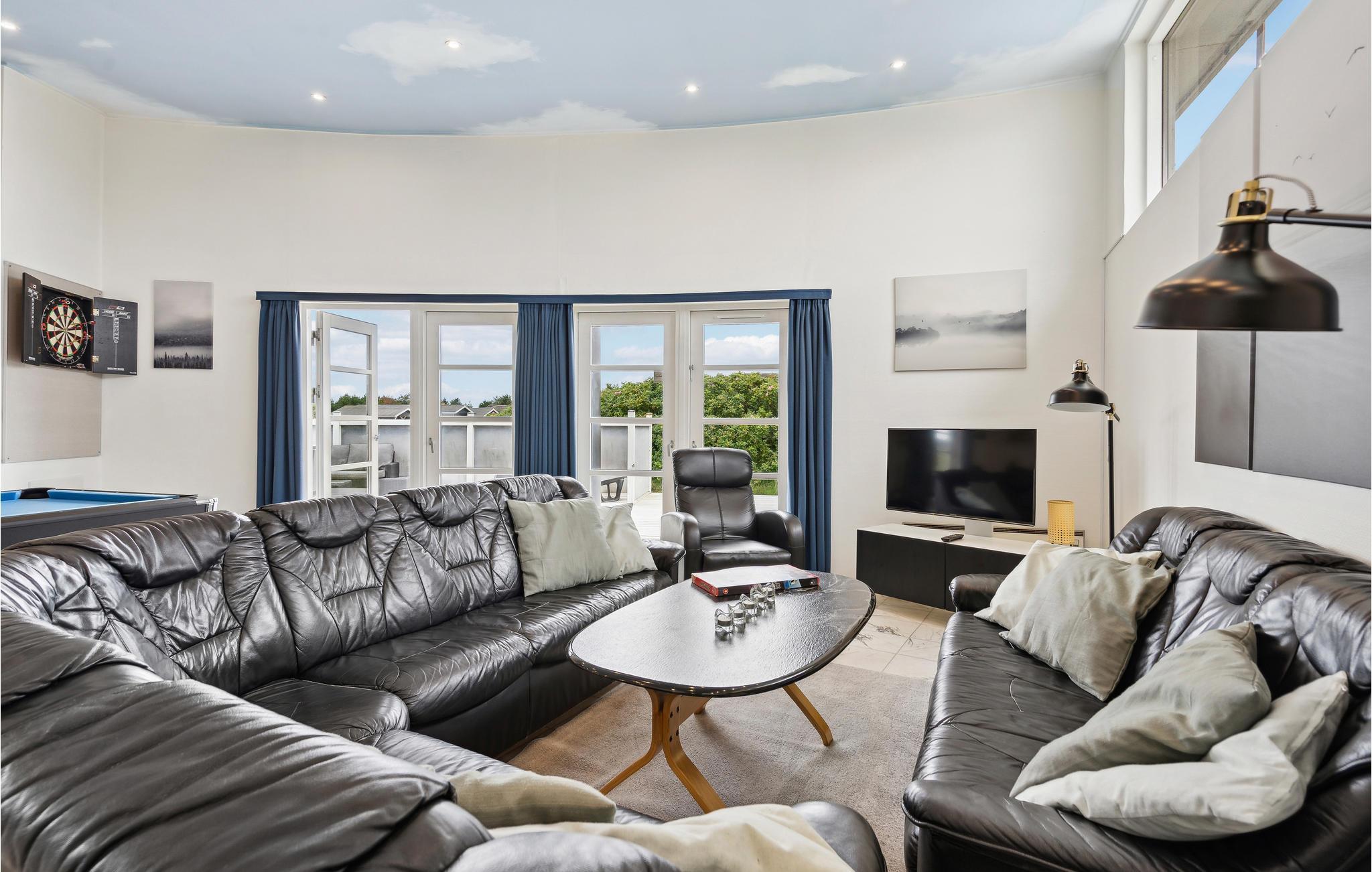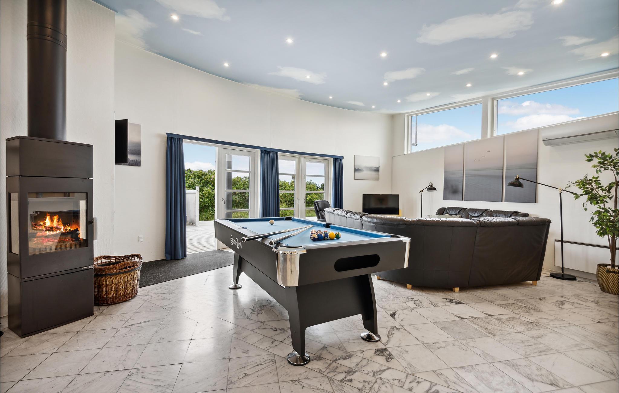 Midt på smukke Holmsland Klit indbyder denne stilfulde bolig til en harmonisk base mellem Vesterhavet og Ringkøbing Fjord. Glæd jer til hyggelige madlavningsaftener i det moderne køkken og måltider sammen ved det indbydende spisebord, mens brændeovnen skaber en atmosfære. Slap af i saunaen, snup et spil billard eller svøm i den varme indendørs pool.