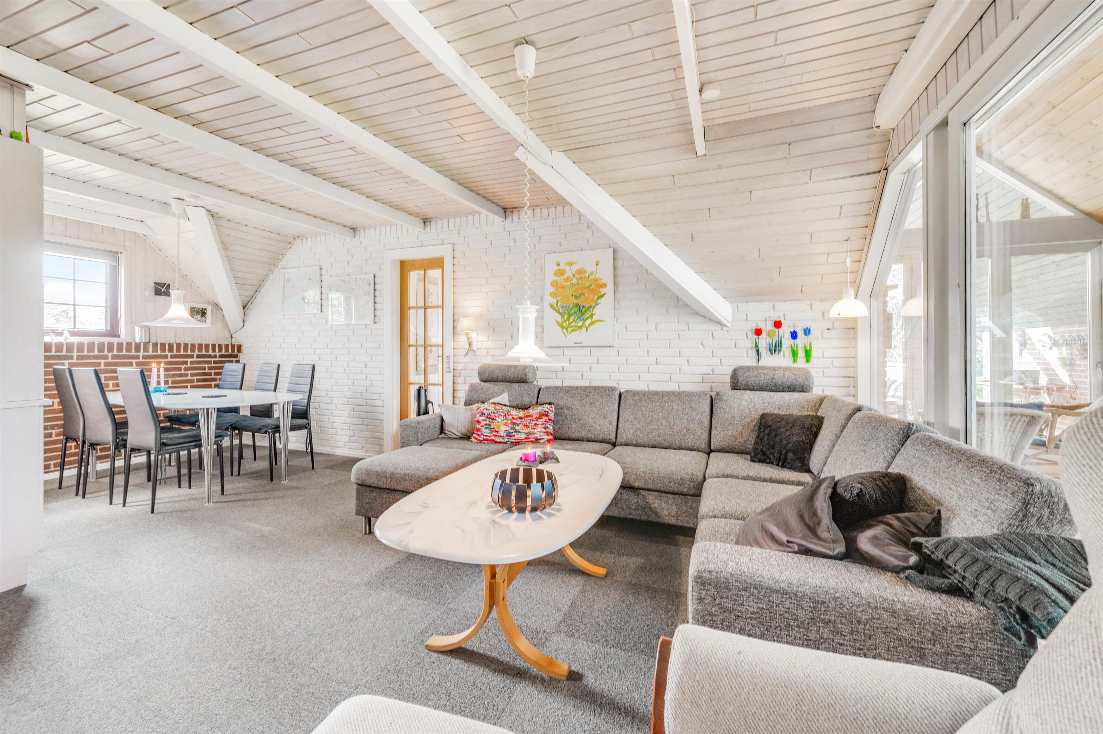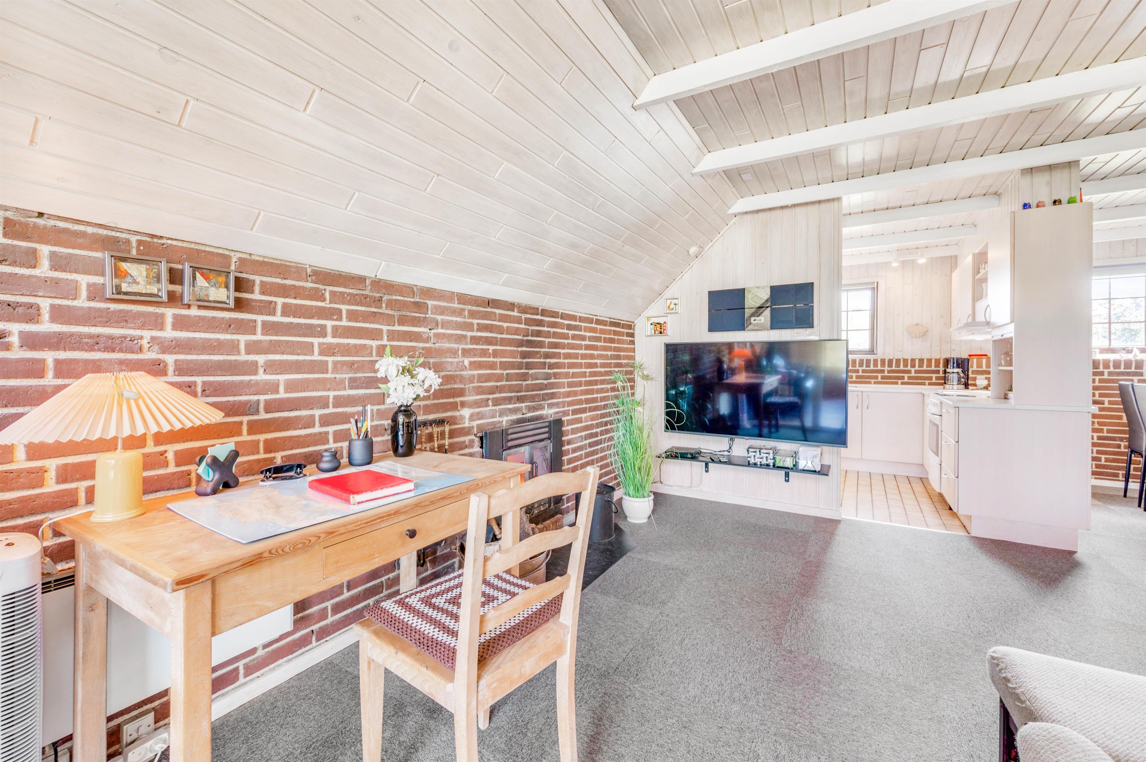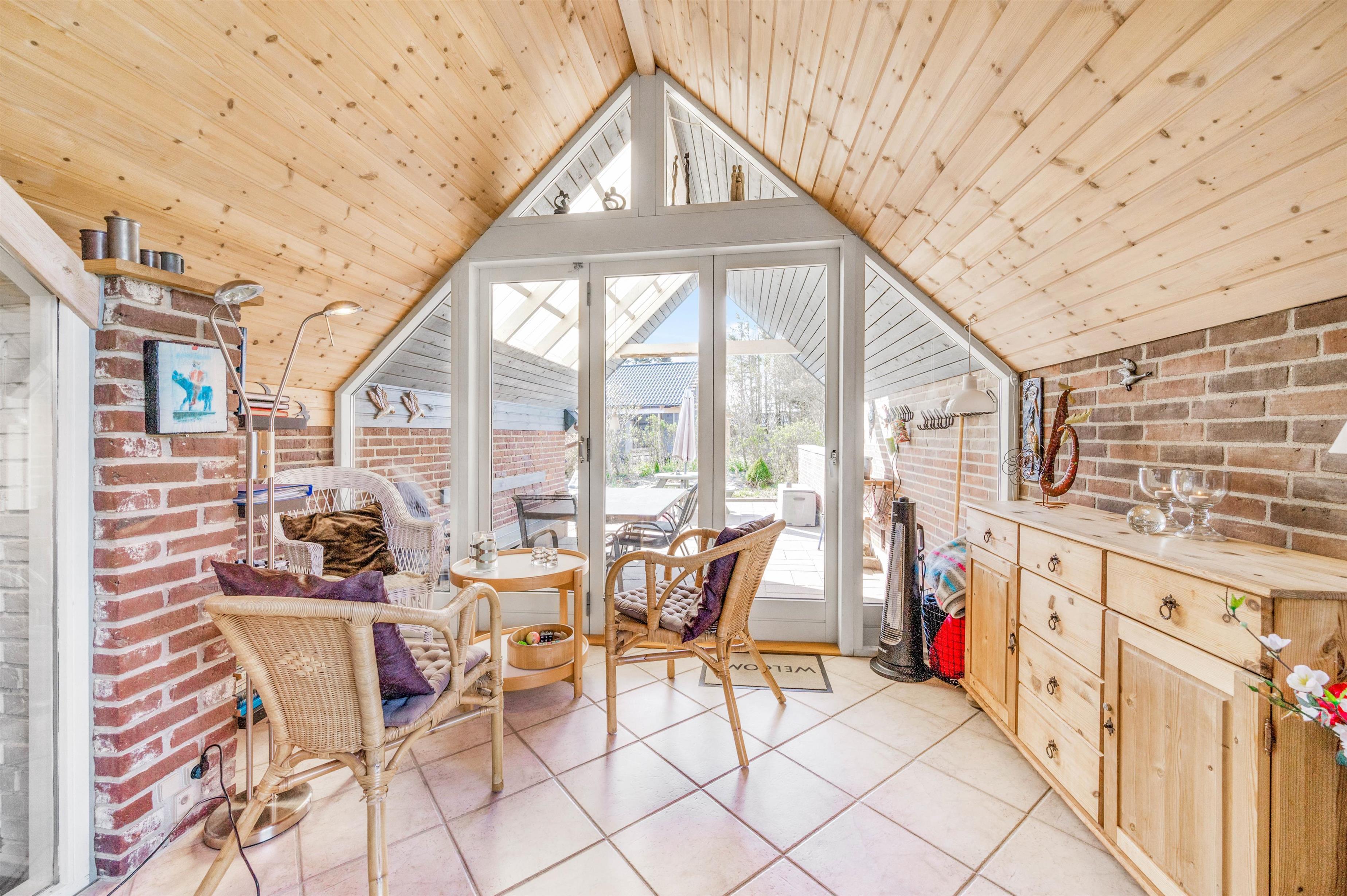 Det store stenhus på Hjelmevej 7 oser af charme både udvendigt og indvendigt. De røde mursten kombineret med de lyse træfarver skaber en hyggelig stemning indenfor, som bliver fulgt op af den afslappede indretningsstil med et hav af små detaljer - her er der dømt ægte sommerhusferie, langt væk fra den travle hverdag.