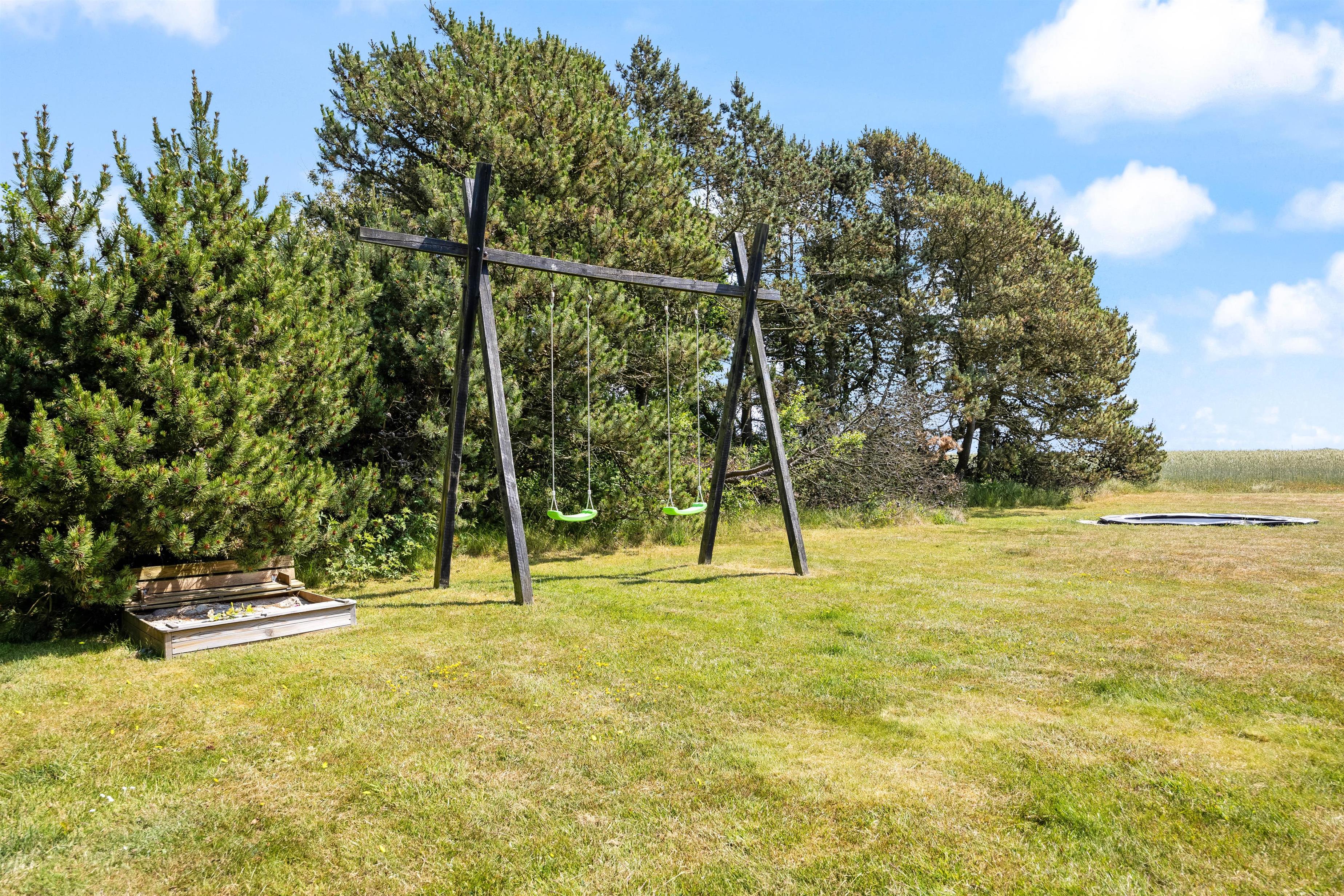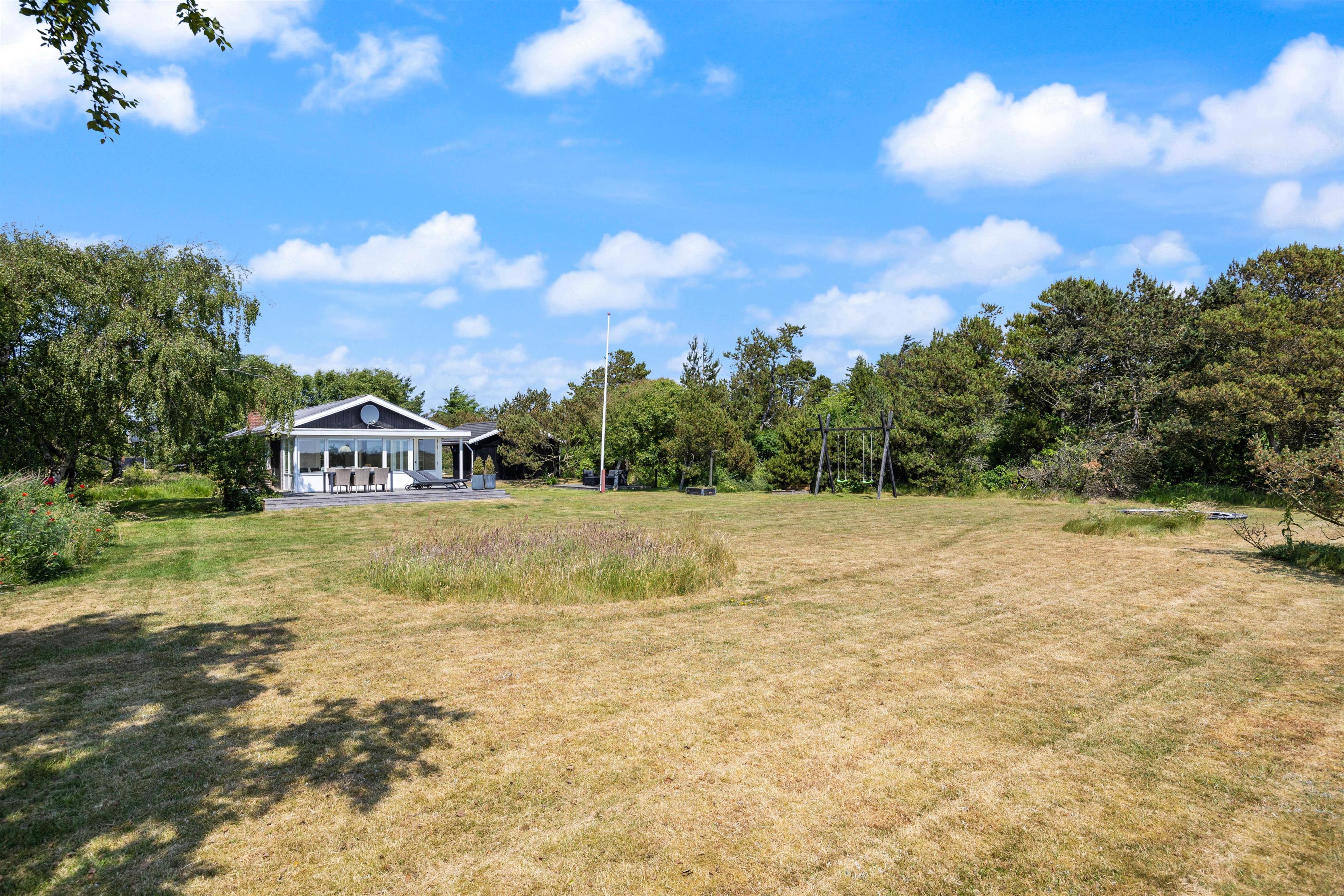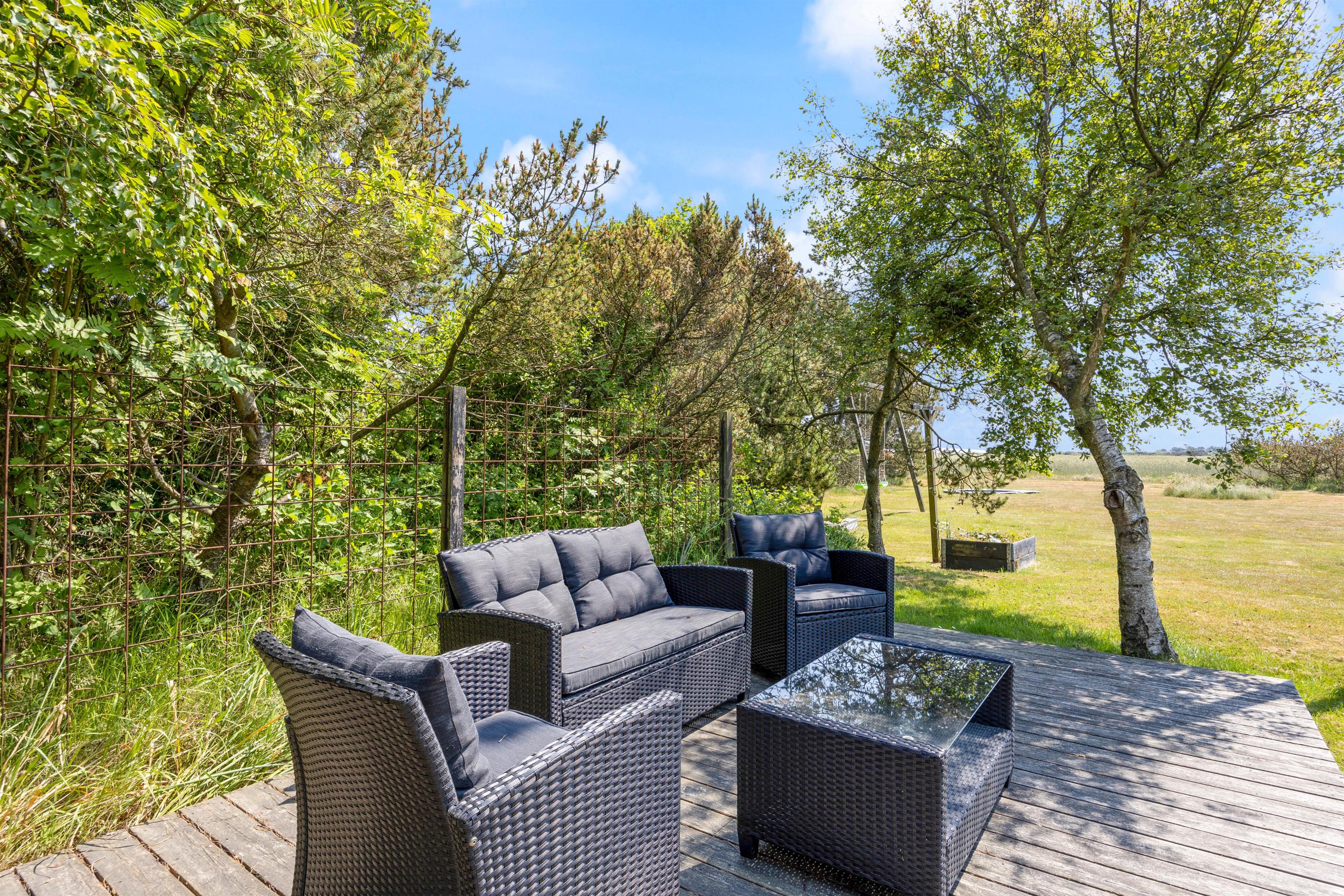 Den 2000 kvadratmeter store grund er omkranset af træer på begge sider. På de solrige dage er den sydvendte træterrassen det eneste rigtige sted at være. Den byder på forskellige kroge og gode steder at sidde eller ligge og nyde vejret. Det ekstra træplateau i haven skaber kun flere muligheder for at finde et læ fyldt sted at tænde op i grillen om aftenen og lade op til endnu en god dag i den vestjyske natur. Skal i hygge ekstra meget en aften, kan i bevæge jer ned til sommerhusets egen bålplads og hygge med snobrød og ristet skumfiduser. Børnene har desuden mulighed for at tage en rask gyngetur, lege i sandkassen eller tage en hoppetur på den nedgravede trampolin.
