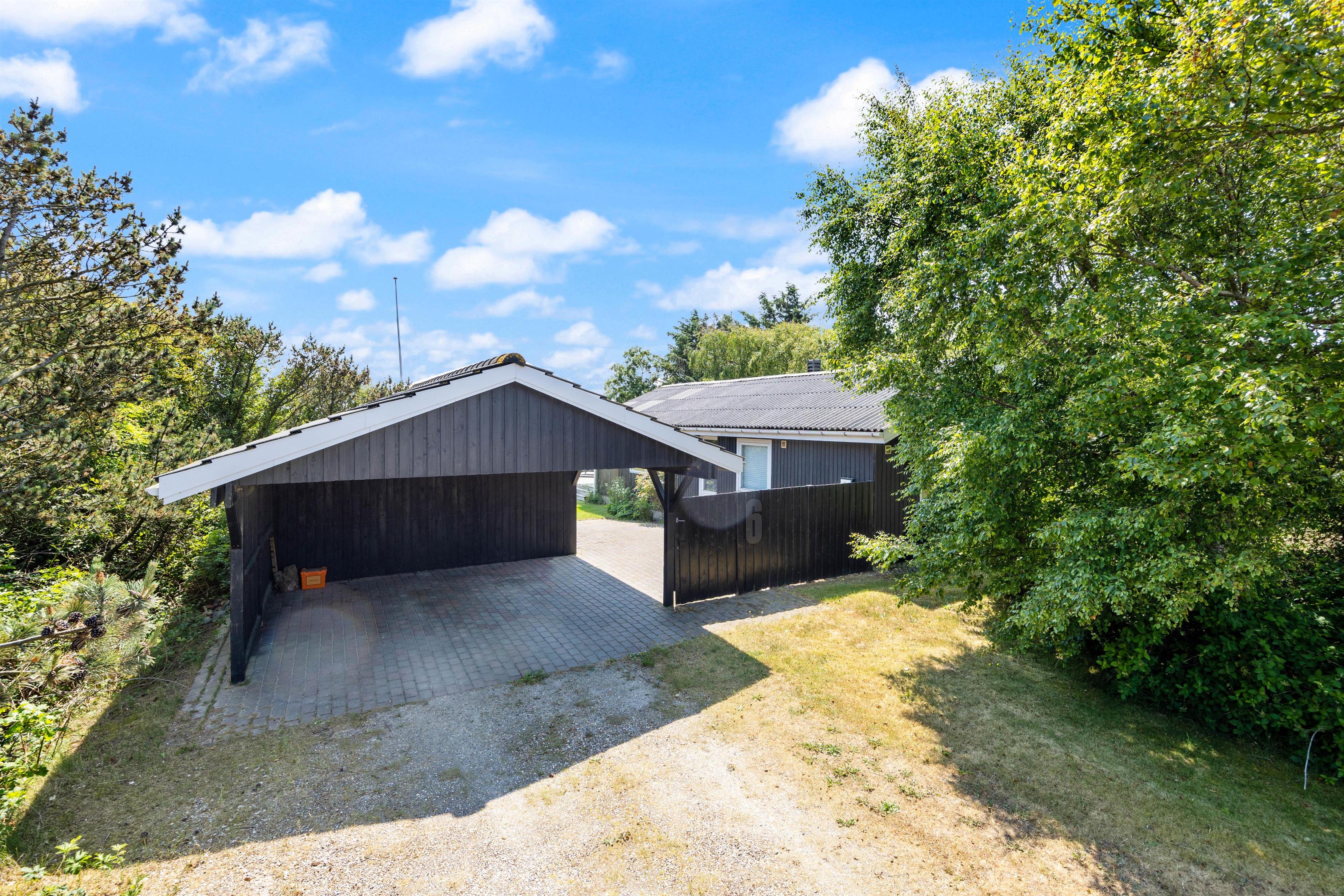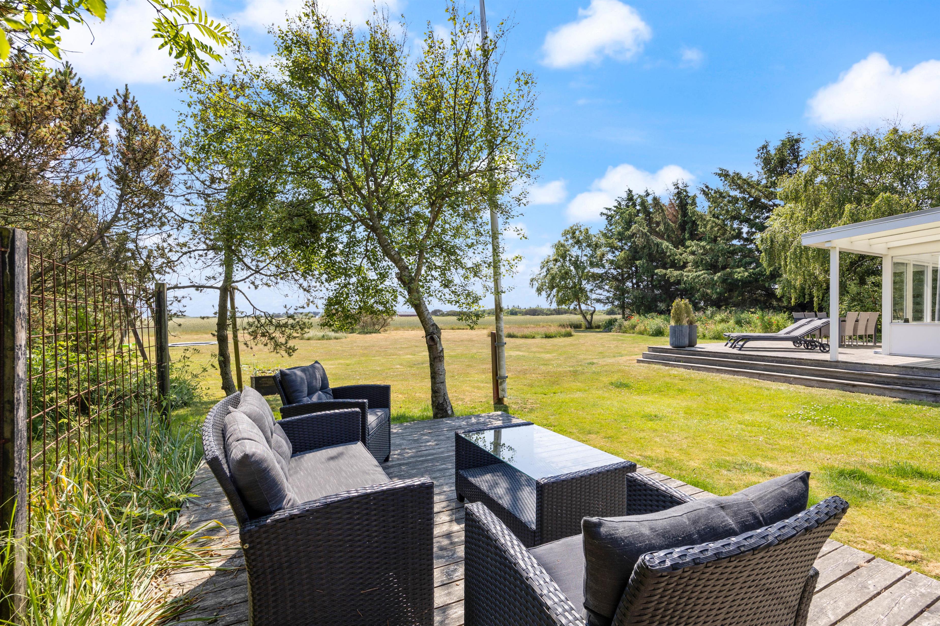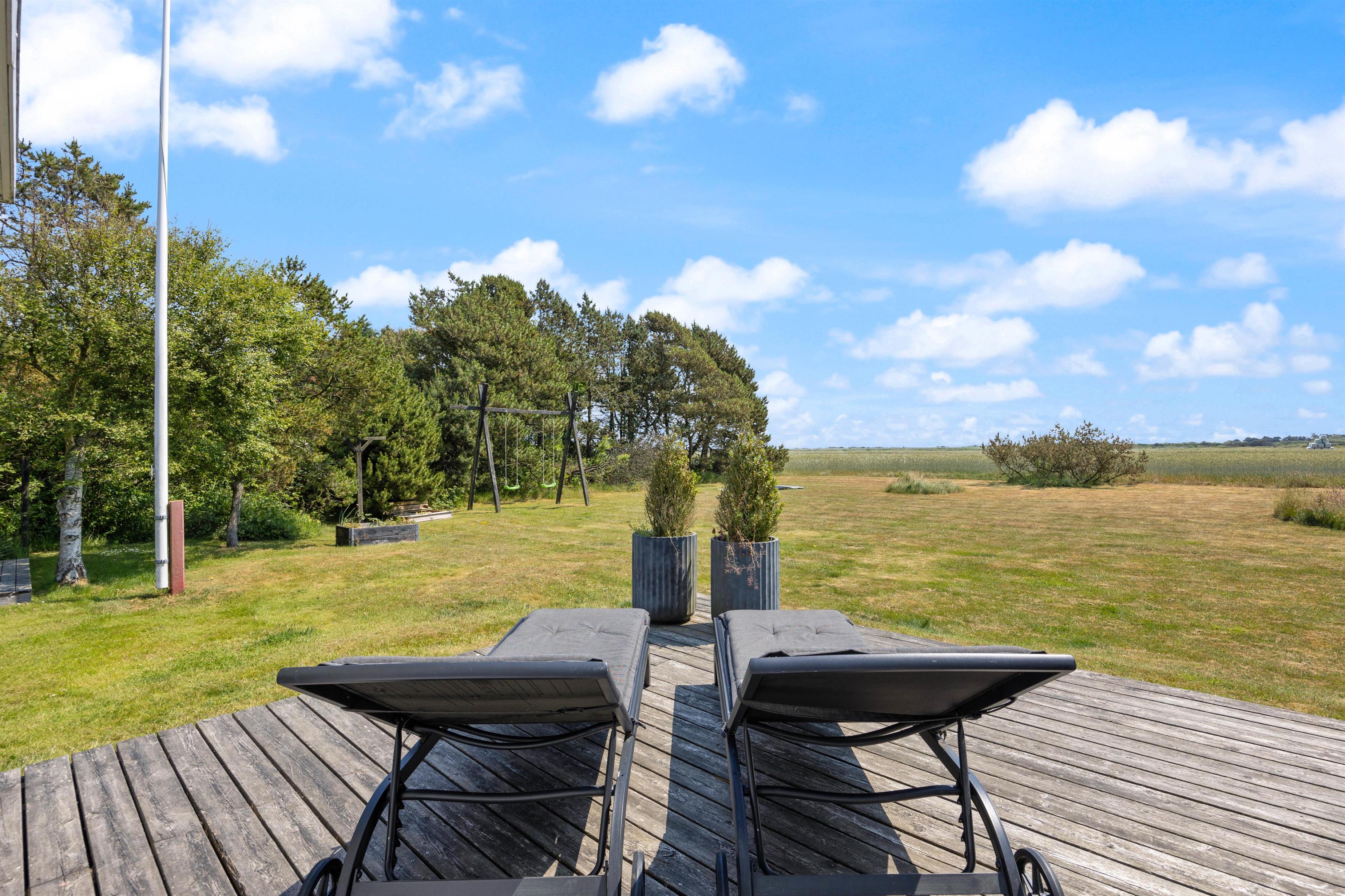 Den 2000 kvadratmeter store grund er omkranset af træer på begge sider. På de solrige dage er den sydvendte træterrassen det eneste rigtige sted at være. Den byder på forskellige kroge og gode steder at sidde eller ligge og nyde vejret. Det ekstra træplateau i haven skaber kun flere muligheder for at finde et læ fyldt sted at tænde op i grillen om aftenen og lade op til endnu en god dag i den vestjyske natur. Skal i hygge ekstra meget en aften, kan i bevæge jer ned til sommerhusets egen bålplads og hygge med snobrød og ristet skumfiduser. Børnene har desuden mulighed for at tage en rask gyngetur, lege i sandkassen eller tage en hoppetur på den nedgravede trampolin.