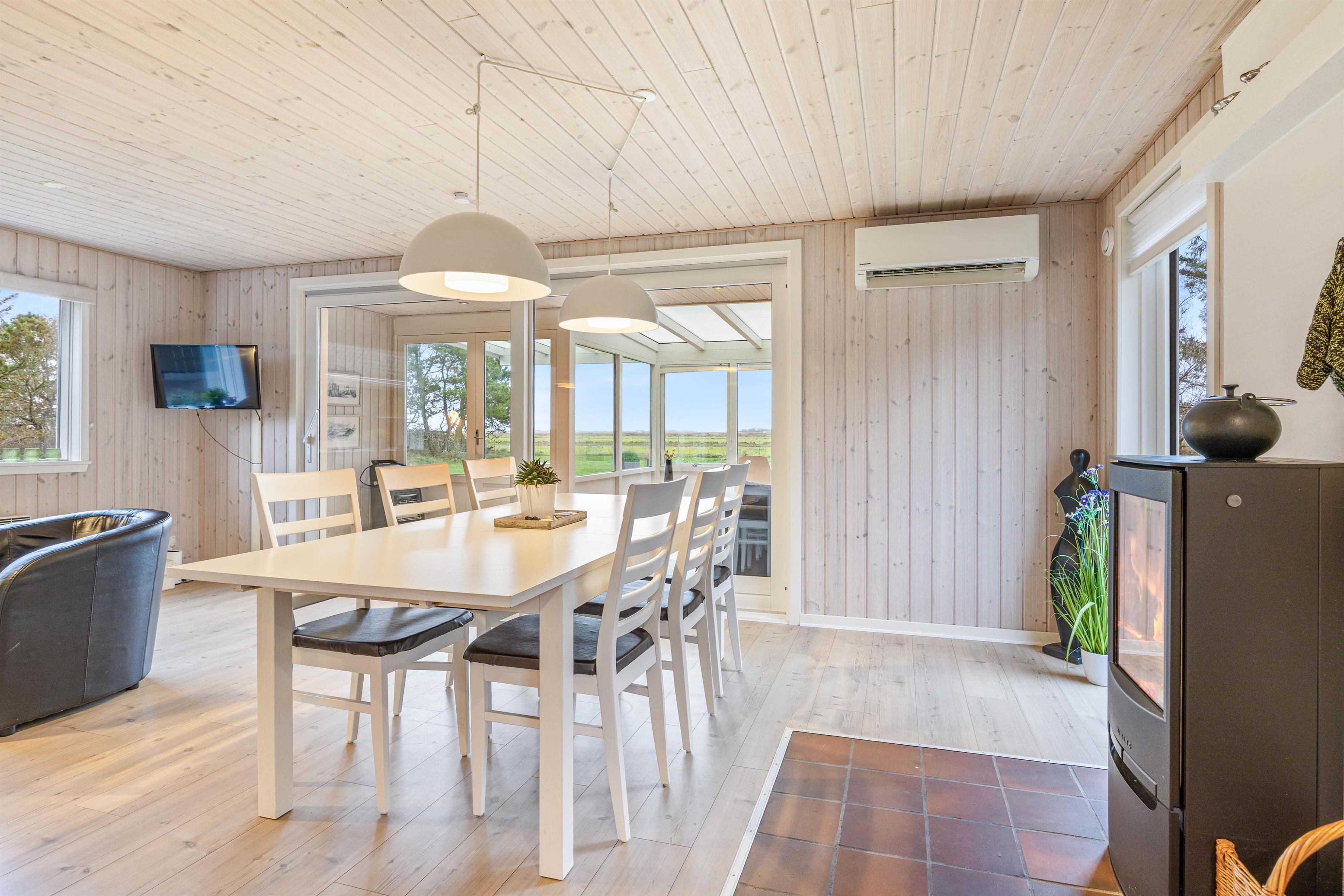 Udendørssæsonen forlænges af husets udestue, der kan bruges året rundt. Herfra har I en fantastisk panoramaudsigt over de tilstødende marker og enge, med fjorden i baggrund. Her kan I rigtig drømme jer væk og få lov til at kigge ud så langt øjet rækker.