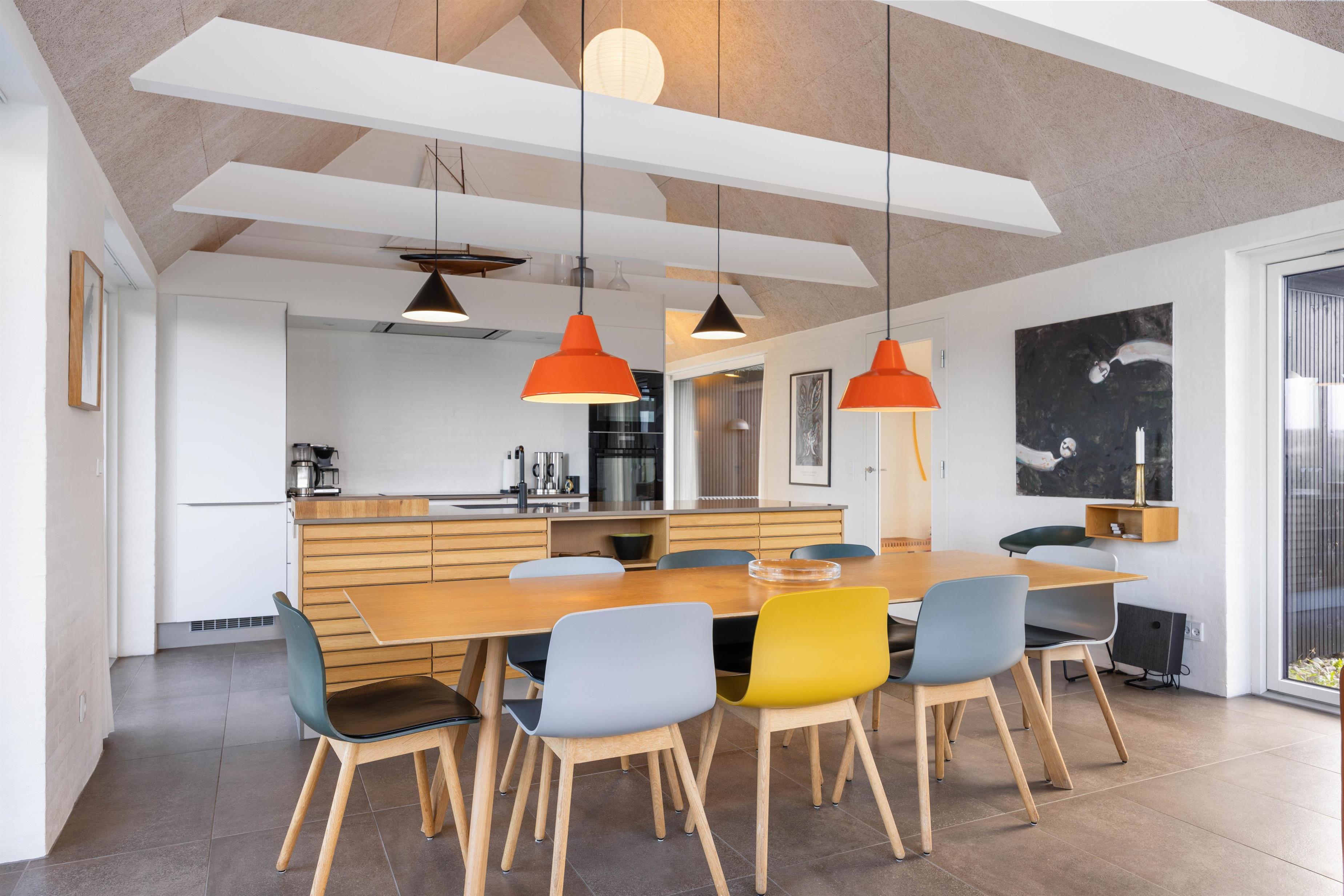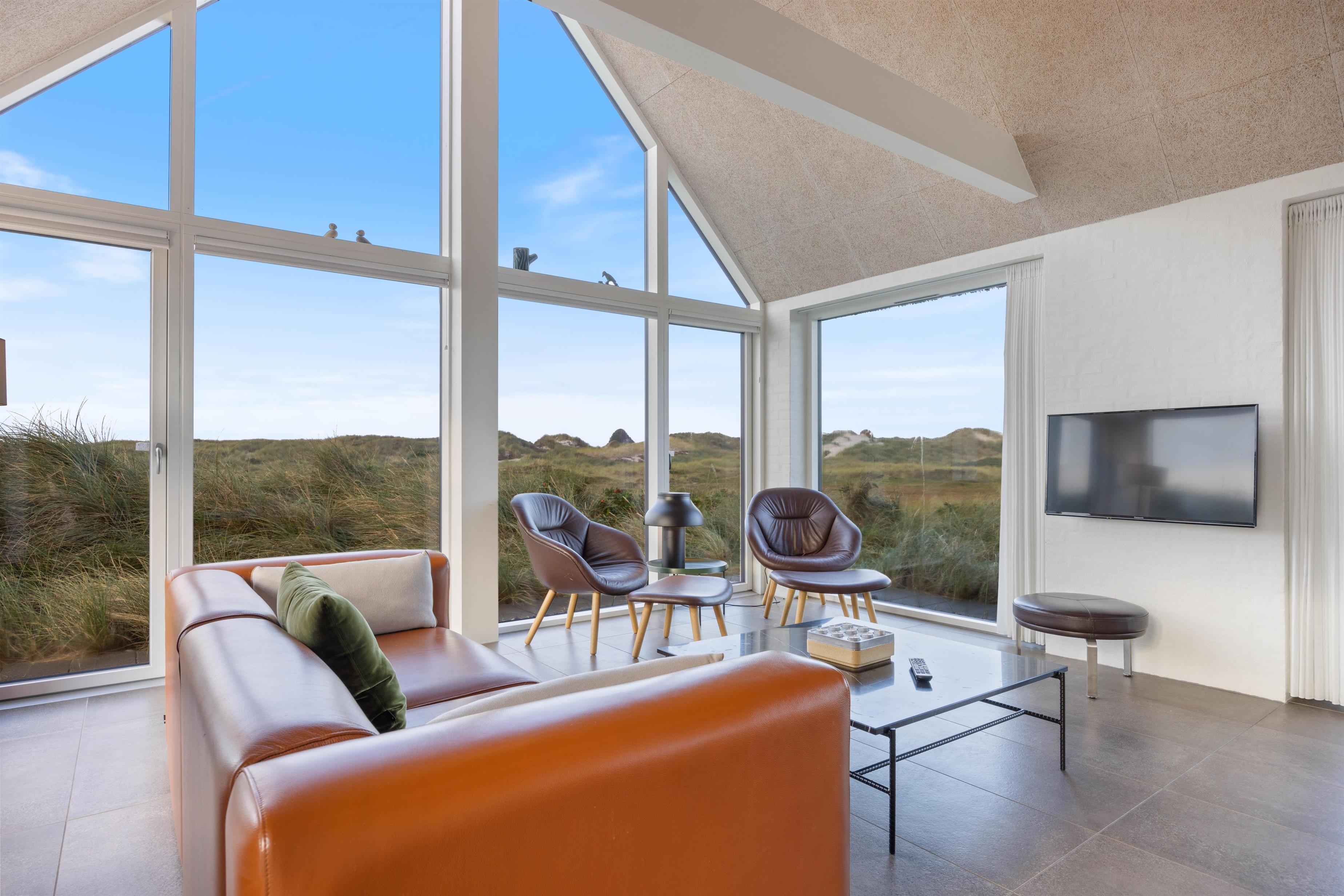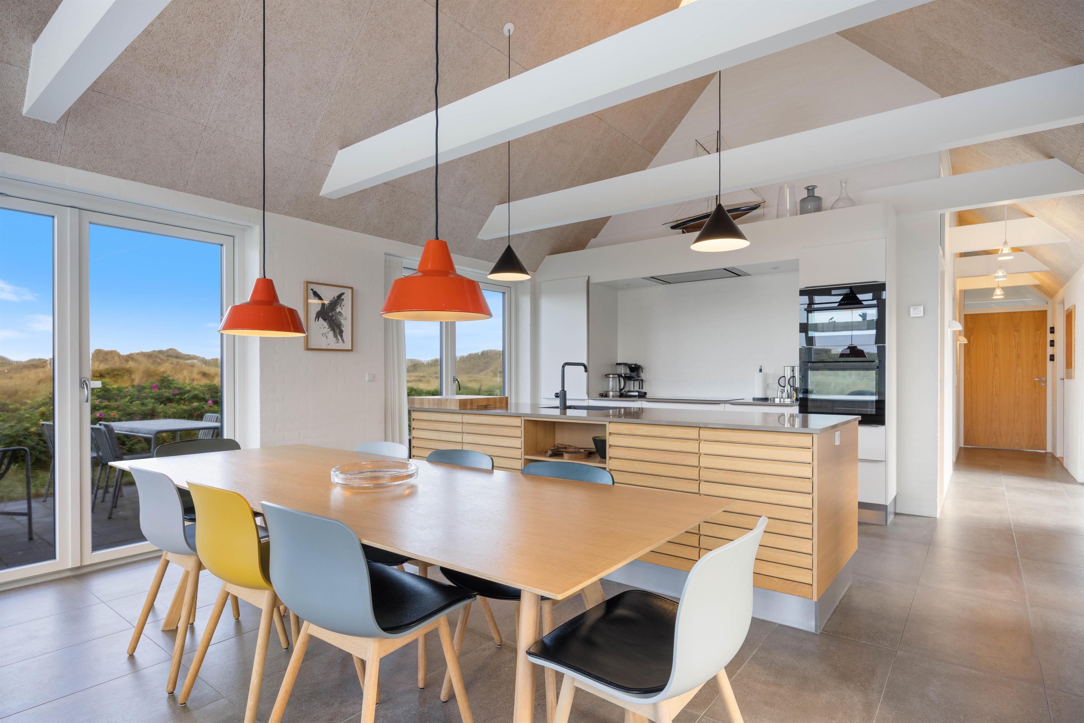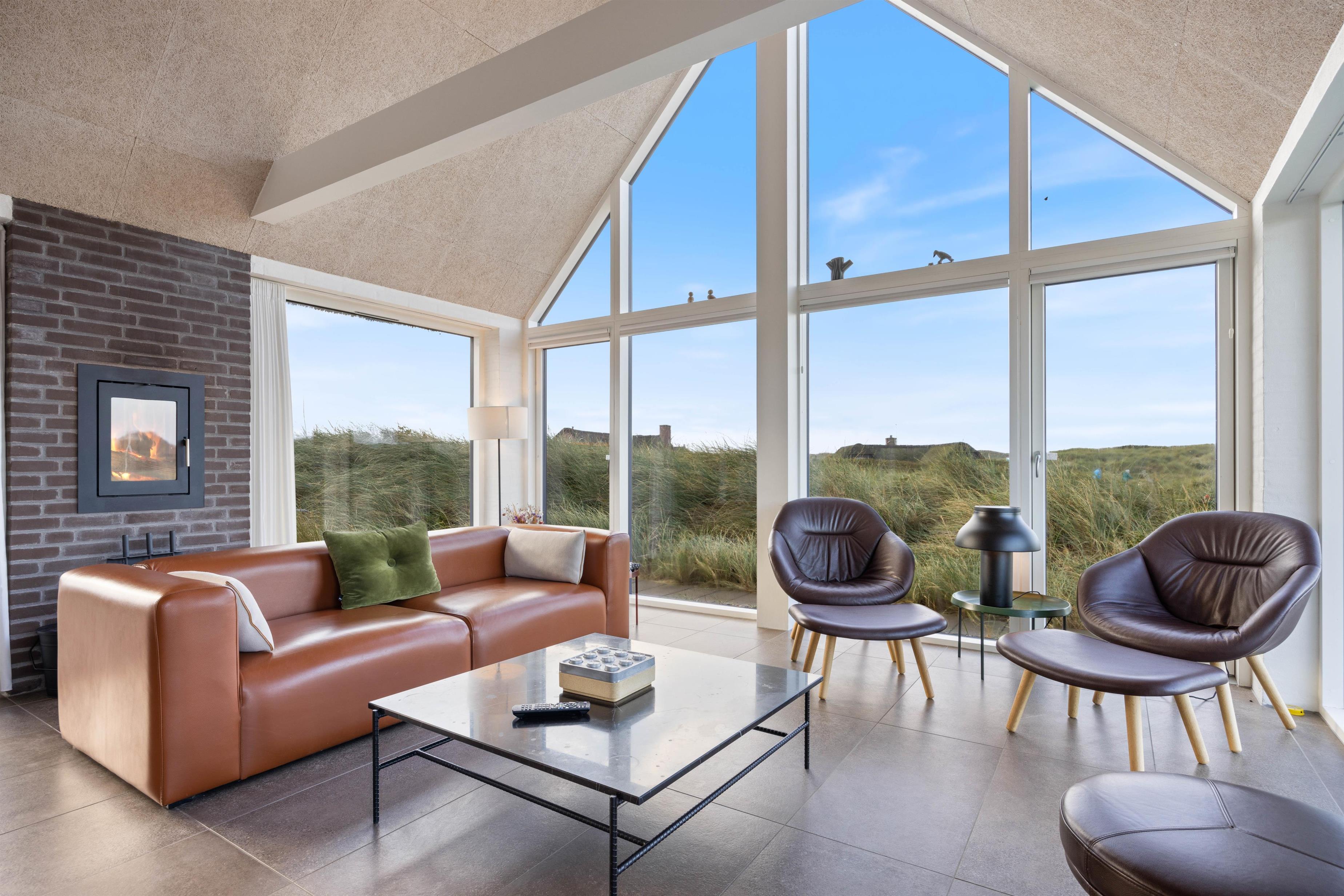 Det lyse opholdsrum er udstyret med gulvvarme, en pejs og byder på en fantastisk udsigt ud over klitterne. Der er sågar mulighed for at nyde en smuk solnedgang. I det åbne køkkenalrum er der rig mulighed for at tilbringe kvalitetstid sammen. I det åbne køkken, har I mulighed for at hjælpe hinanden med madlavningen. Imens opvaskemaskinen klarer opvasken for jer, kan I sætte jer godt til rette i stuen med en god film. Her er der en chromecast, så I kan streame netop de film og serier, som I ønsker at se via. jeres egne streamingtjenester.