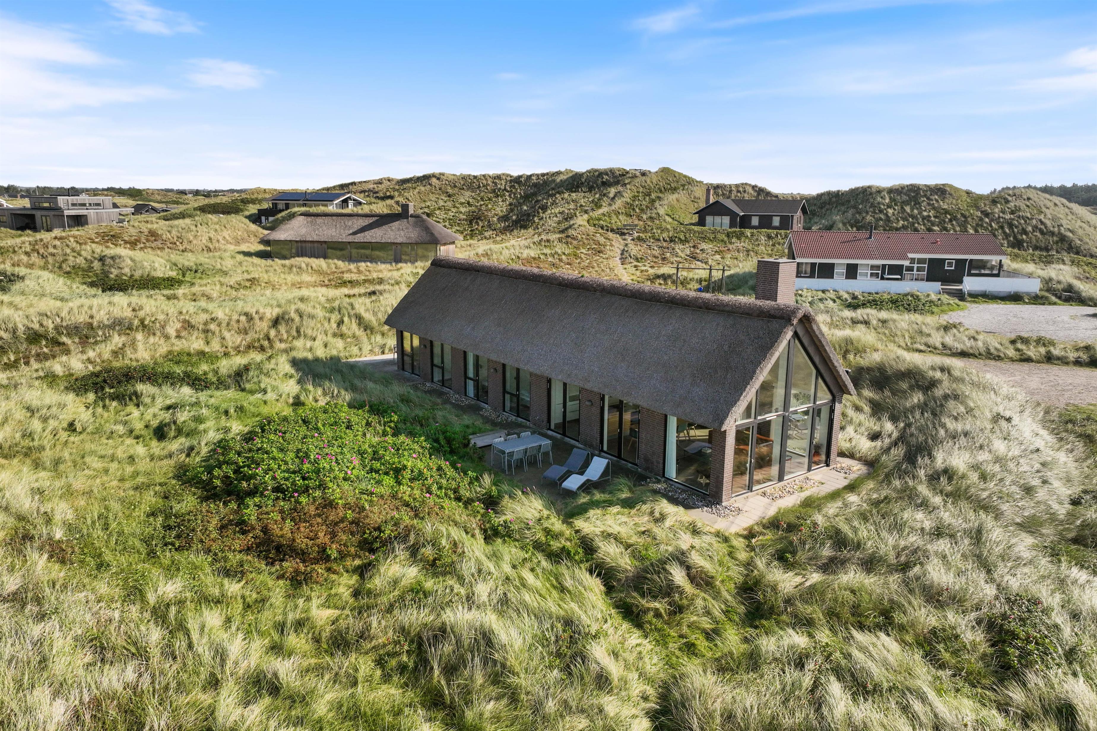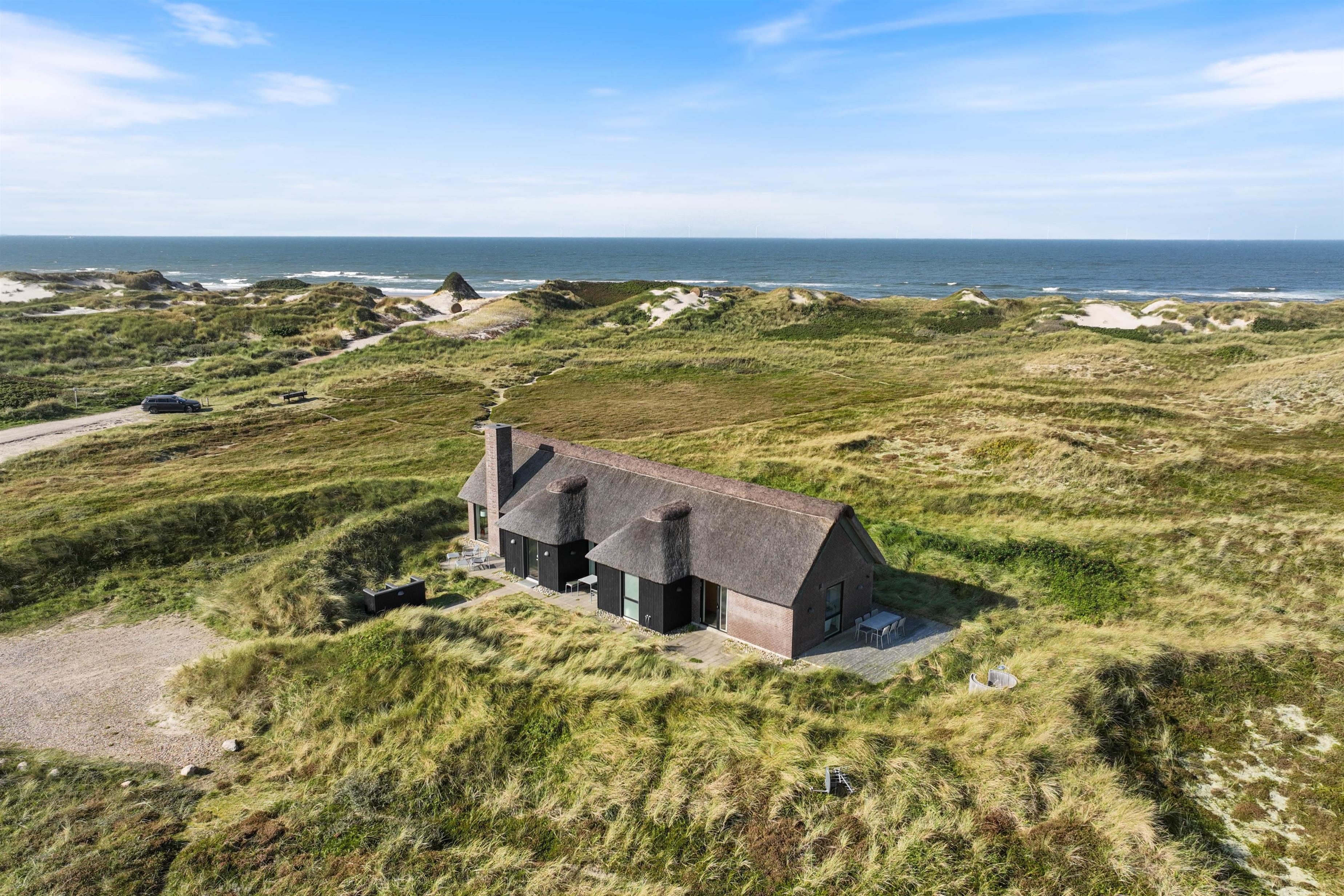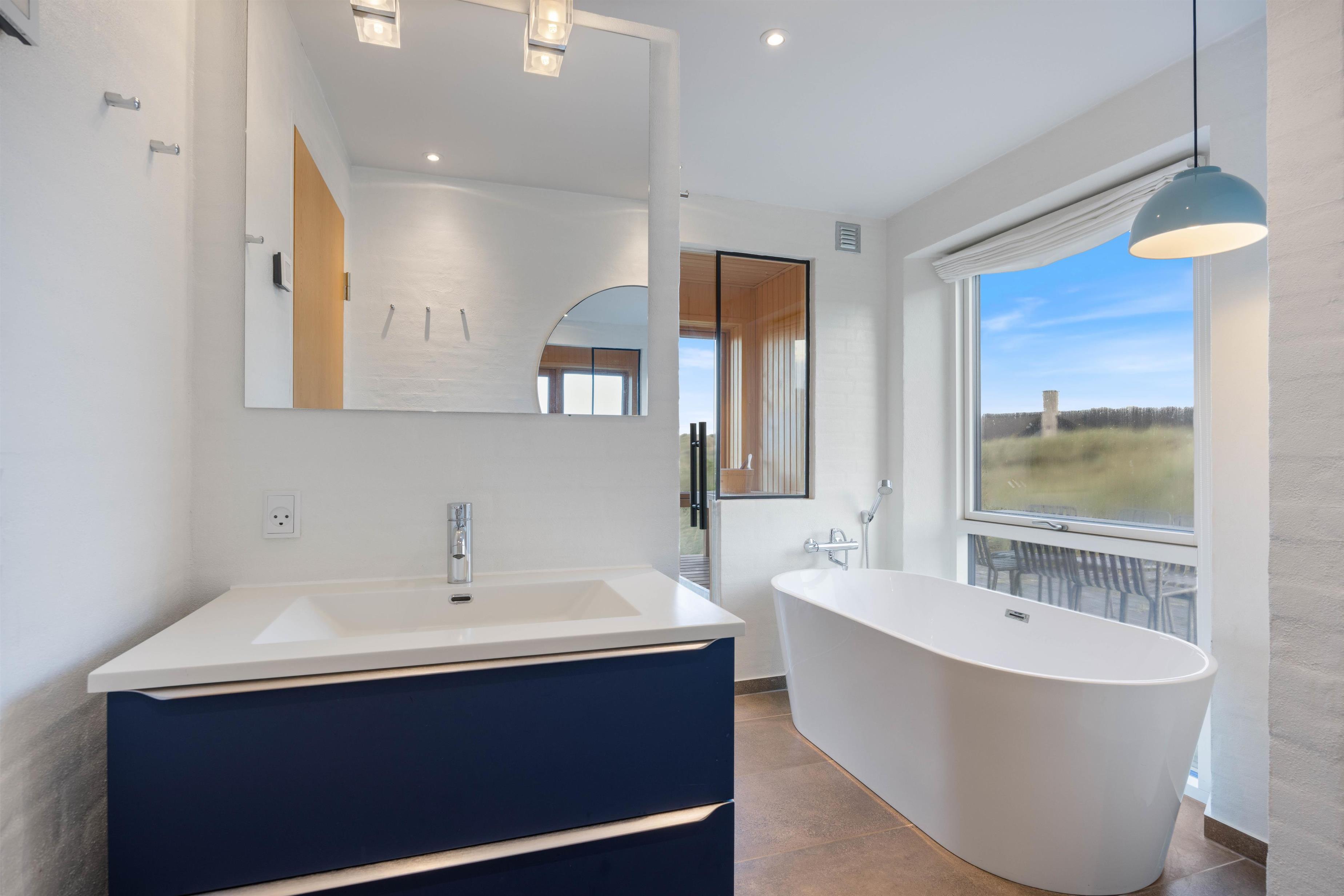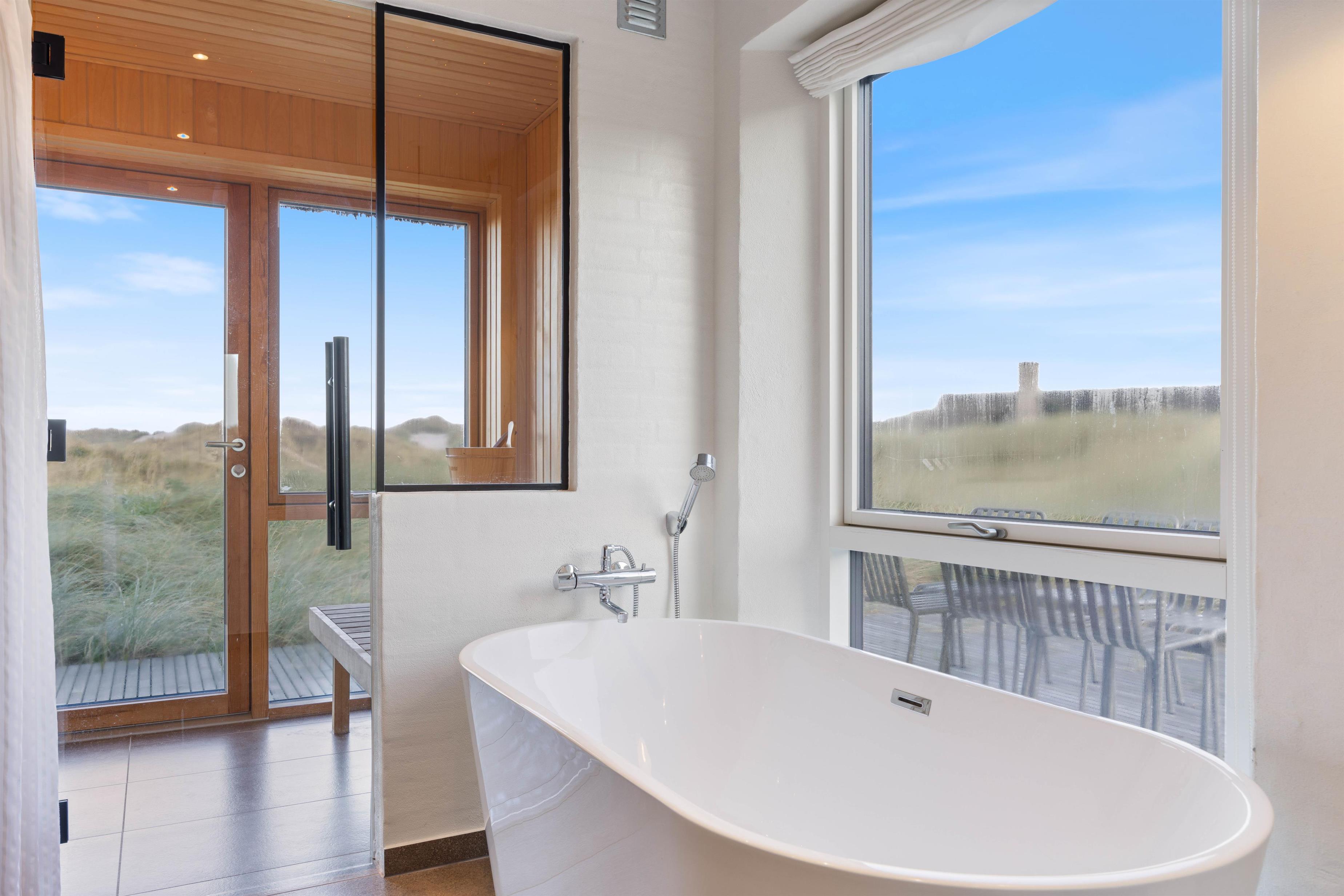 Der er 3 rummelige soveværelser med gulvvarme og dobbeltsenge, så I kan lade batterierne op efter en lang dag på stranden. Derudover er der 2 badeværelser med gulvvarme, hvoraf det store badeværelse både har en dobbeltbruser og et badekar. I kan blive ordentlige gennemvarme i saunaen, imens I nyder den smukke panoramaudsigt over klitlandskabet. I det andet badeværelse finder I praktiske bekvemmeligheder som vaskemaskine og tørretumbler.