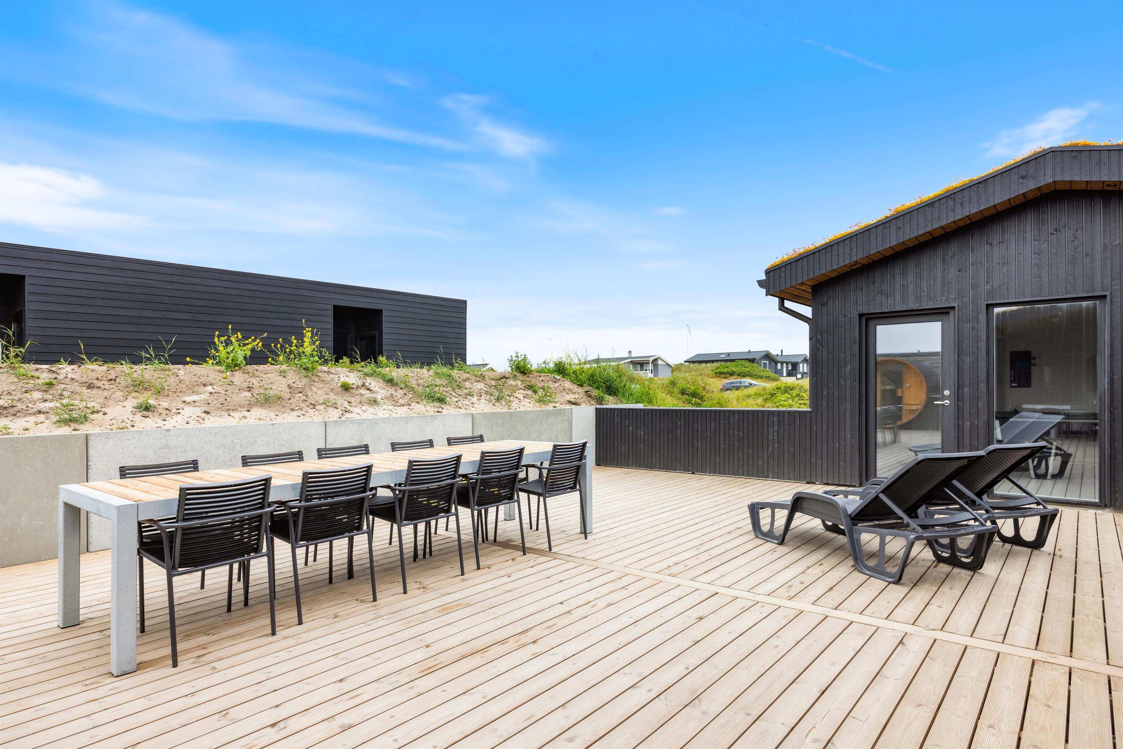 Feriehuset på Sand Holms Vej 62 i Søndervig ligger på en ca. 1215 m2 stor naturgrund med et stort terrasseområde, som er indhegnet, så jeres børn eller hunde ikke kan gå på opdagelse på egen hånd. For en ekstra dosis afslapning er der en udendørs sauna, hvor I kan komme til hægterne fra hverdagens stress eller varme jer op efter en lang gåtur på stranden. Om aftenen kan I runde en begivenhedsrig dag af med en hyggelig grillaften. Der er en gasgrill til rådighed i feriehuset til dette formål.