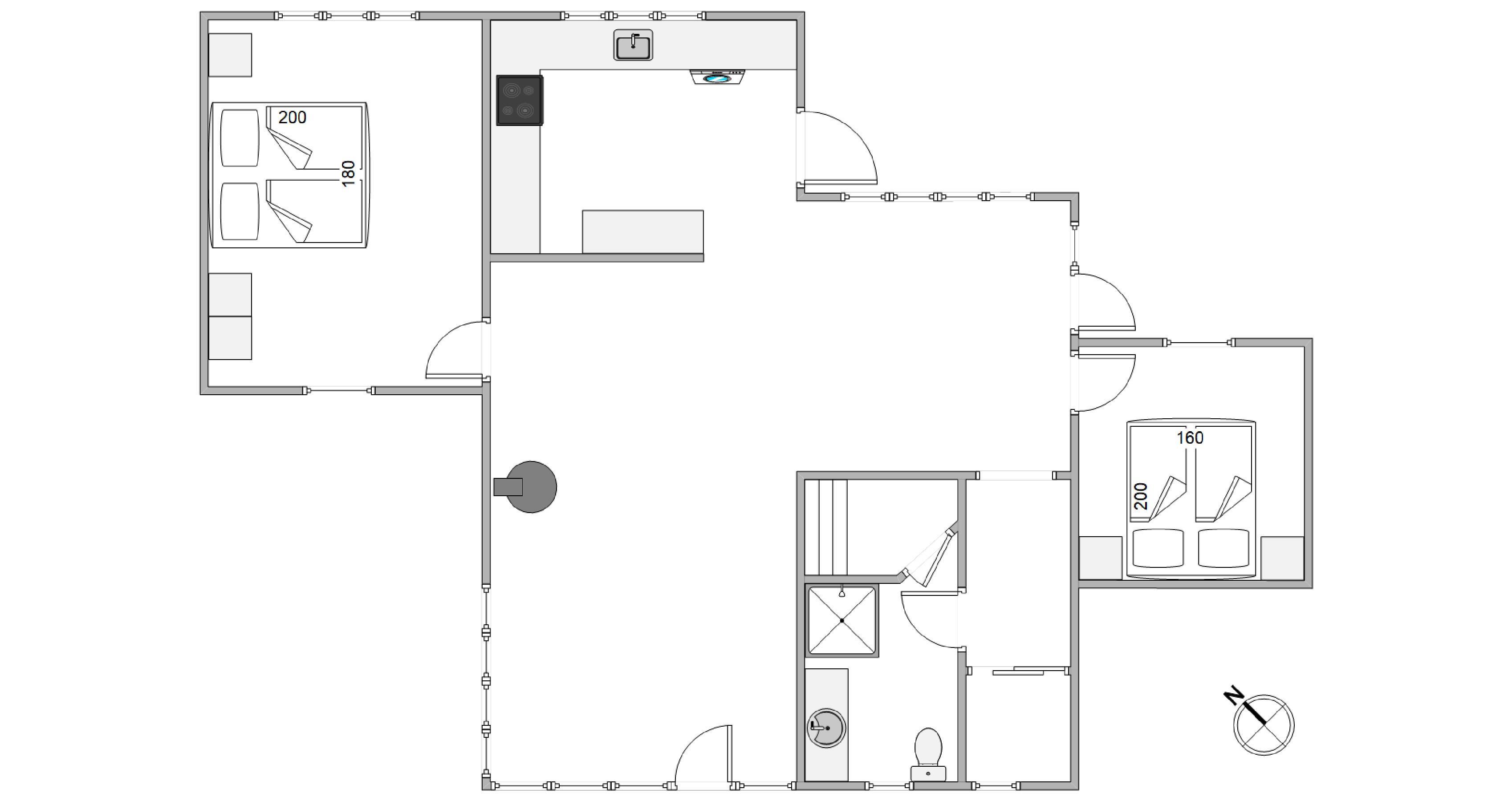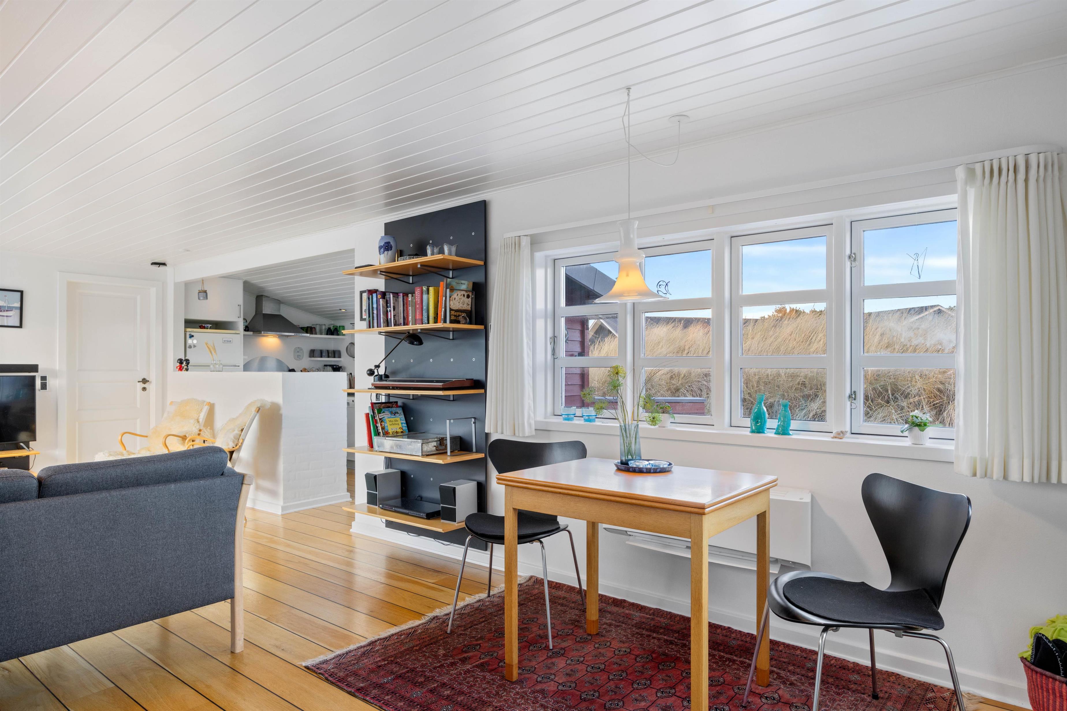 Når I træder ind i feriehuset på Nordsøvej 306 i Søndervig, bliver I mødt af et lyst, åbent og hyggeligt opholdsrum, der indbyder til mange timer sammen. Opholdsrummet forbinder stue, spiseplads og køkken. Her kan I sammen lave mad, spille spil eller planlægge ugens aktiviteter. En del af stuen er udformet som udestue og giver jer følelsen af at sidde midt i naturen.