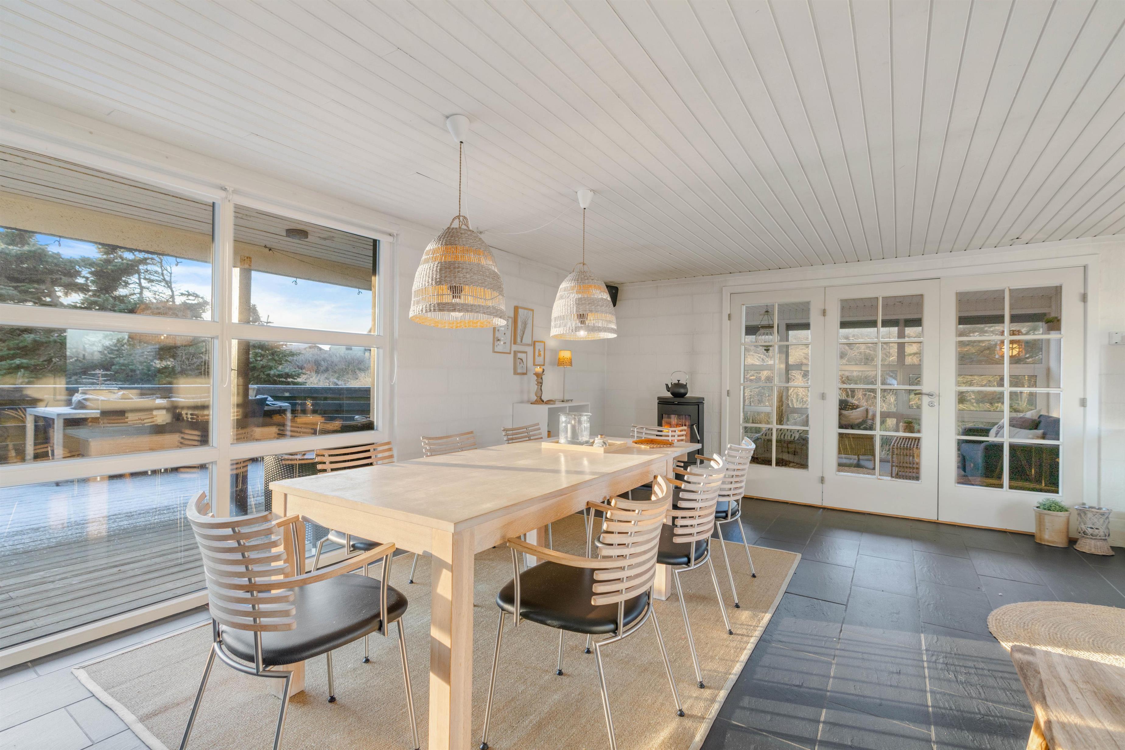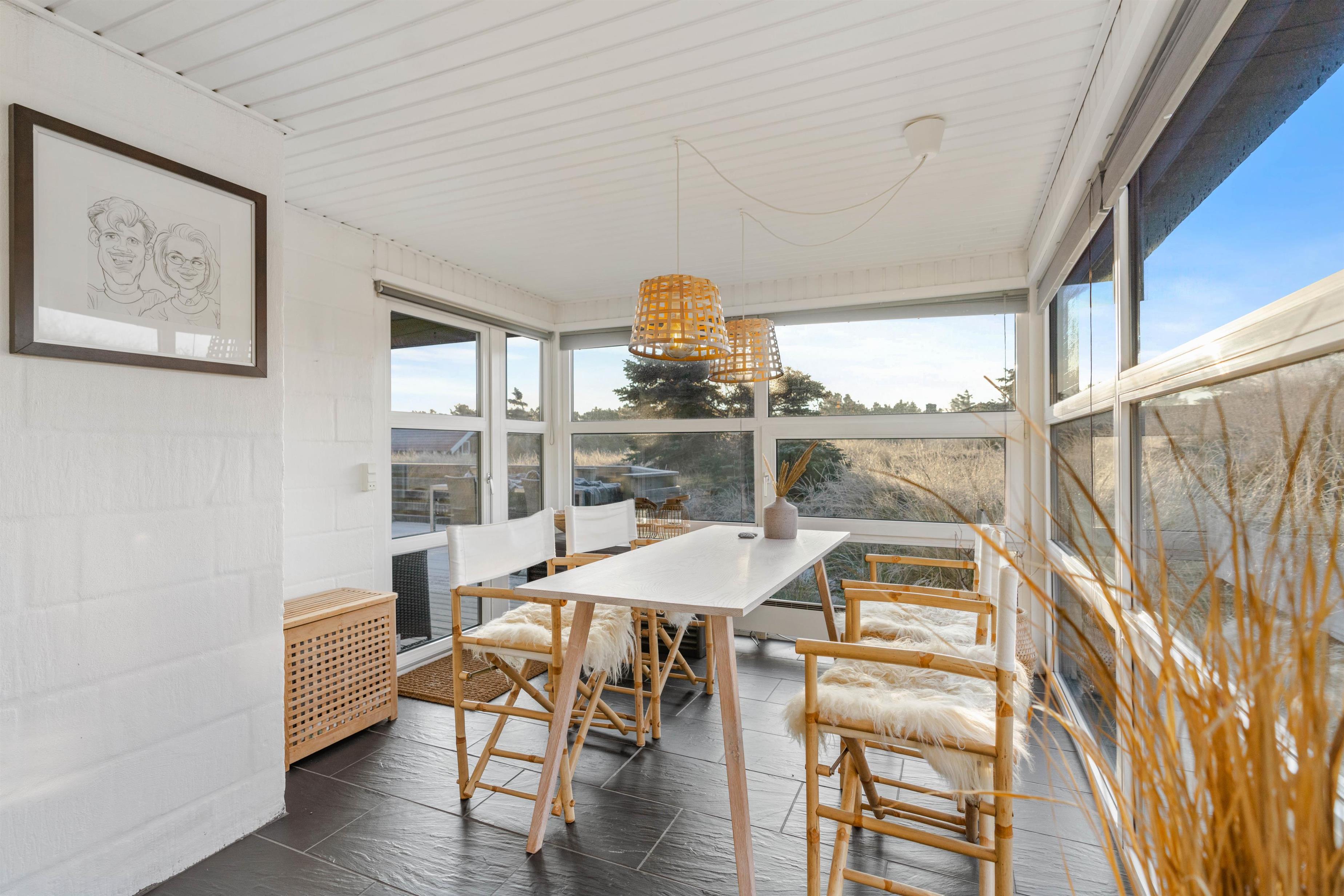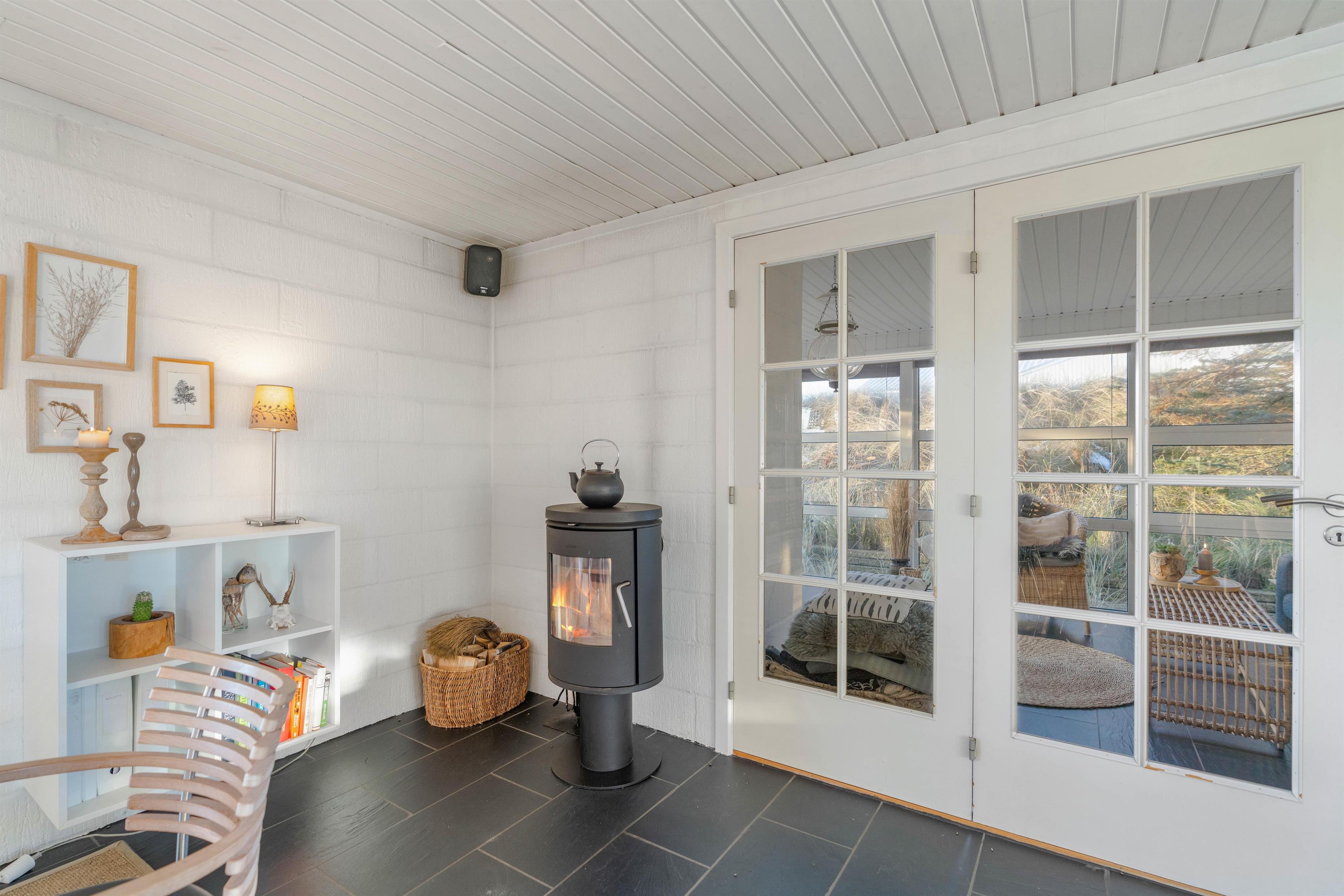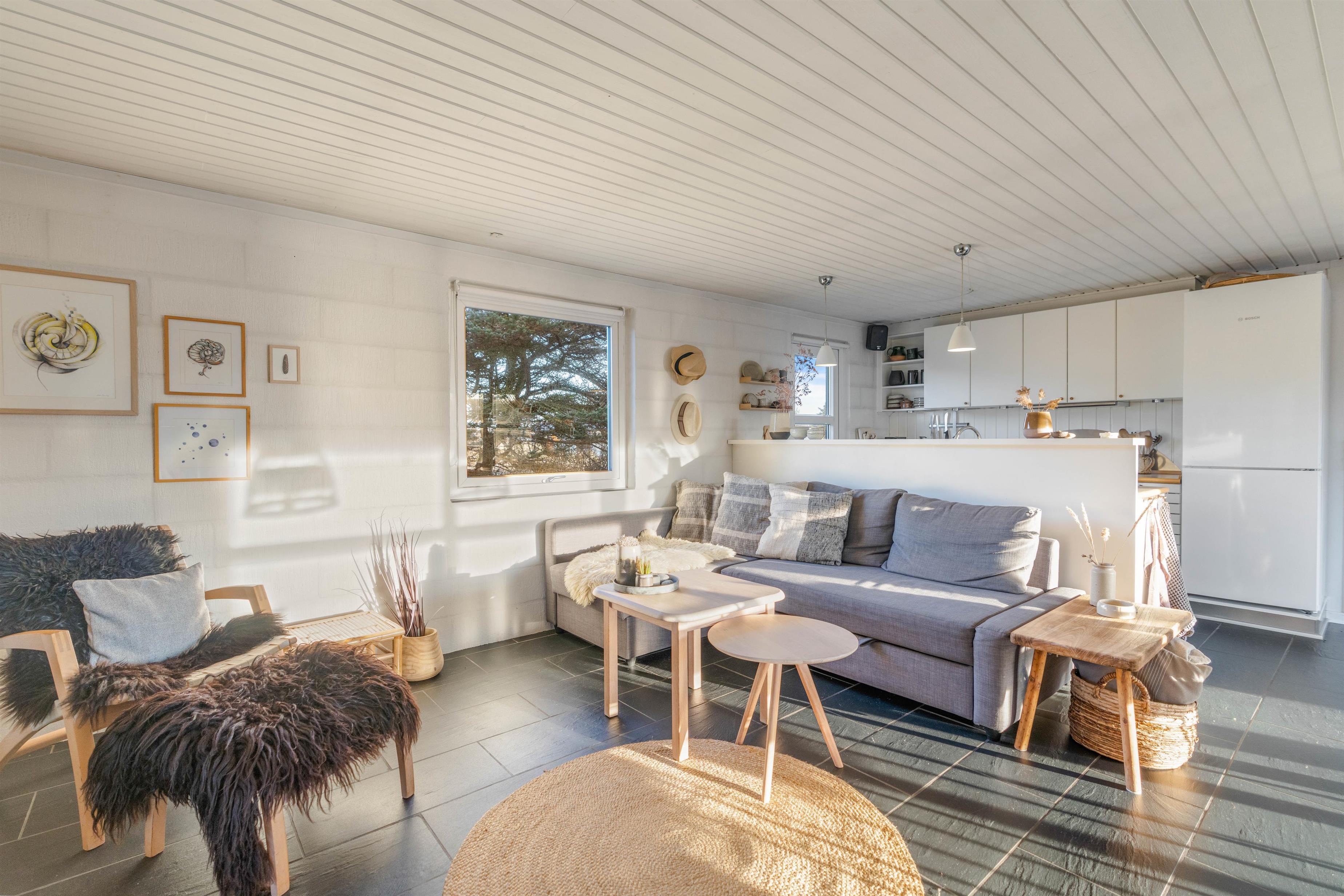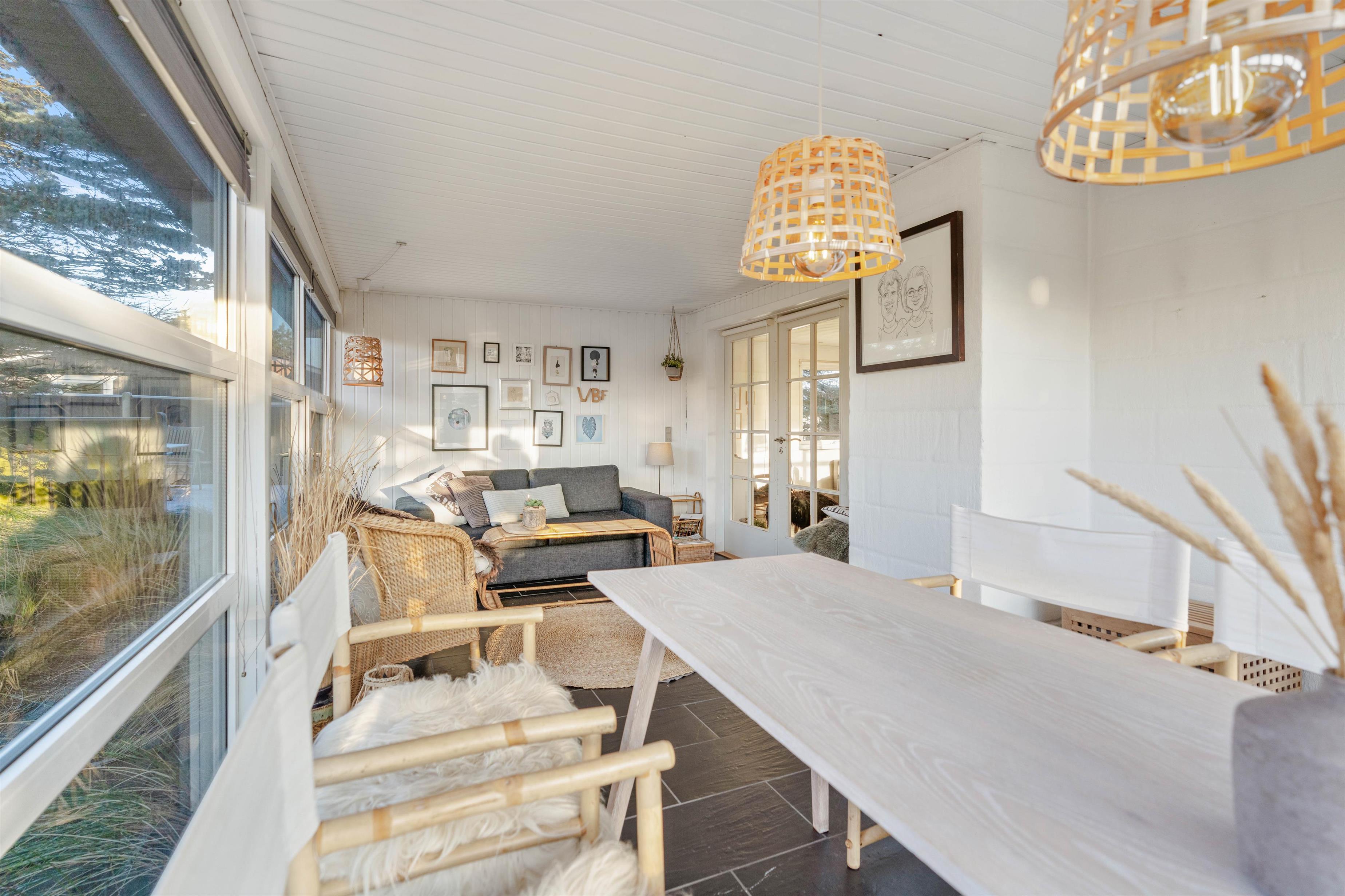 Sommerhuset består af i alt 111m2, og er moderne indrettet med lyse vægge og lofter. De sorte klinker skaber sammen med indretningen en god kontrast i husets ellers enkle stil. Overalt i huset er der store vinduer, som sørger for et flot lysindfald fra morgen til aften. Huset har desuden en flot udestue, som er perfekt til de dage, hvor vejret ikke er helt godt nok til at sidde udevendigt. Denne udestue giver en fantastisk fornemmelse af den smukke omkringliggende natur.